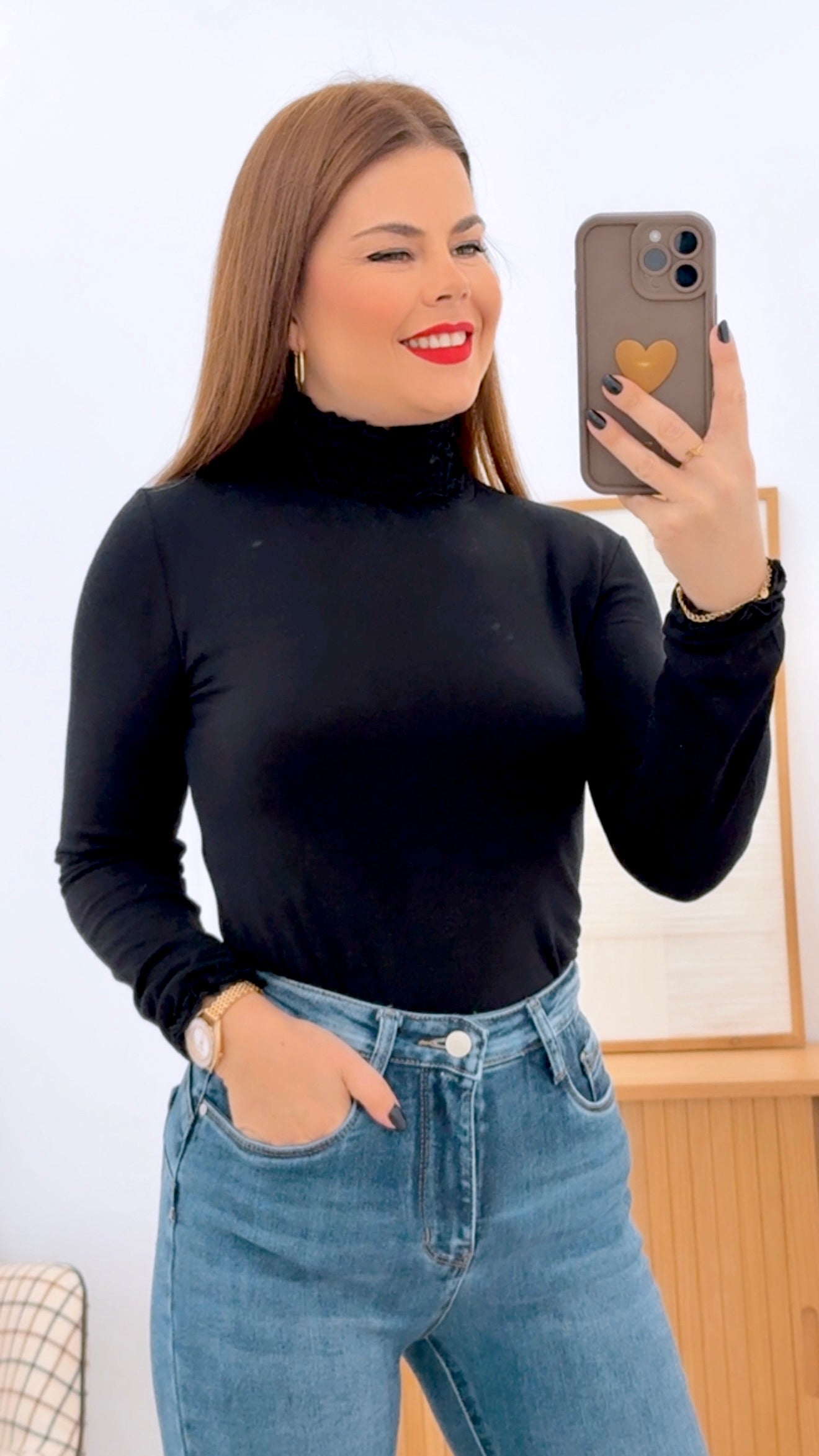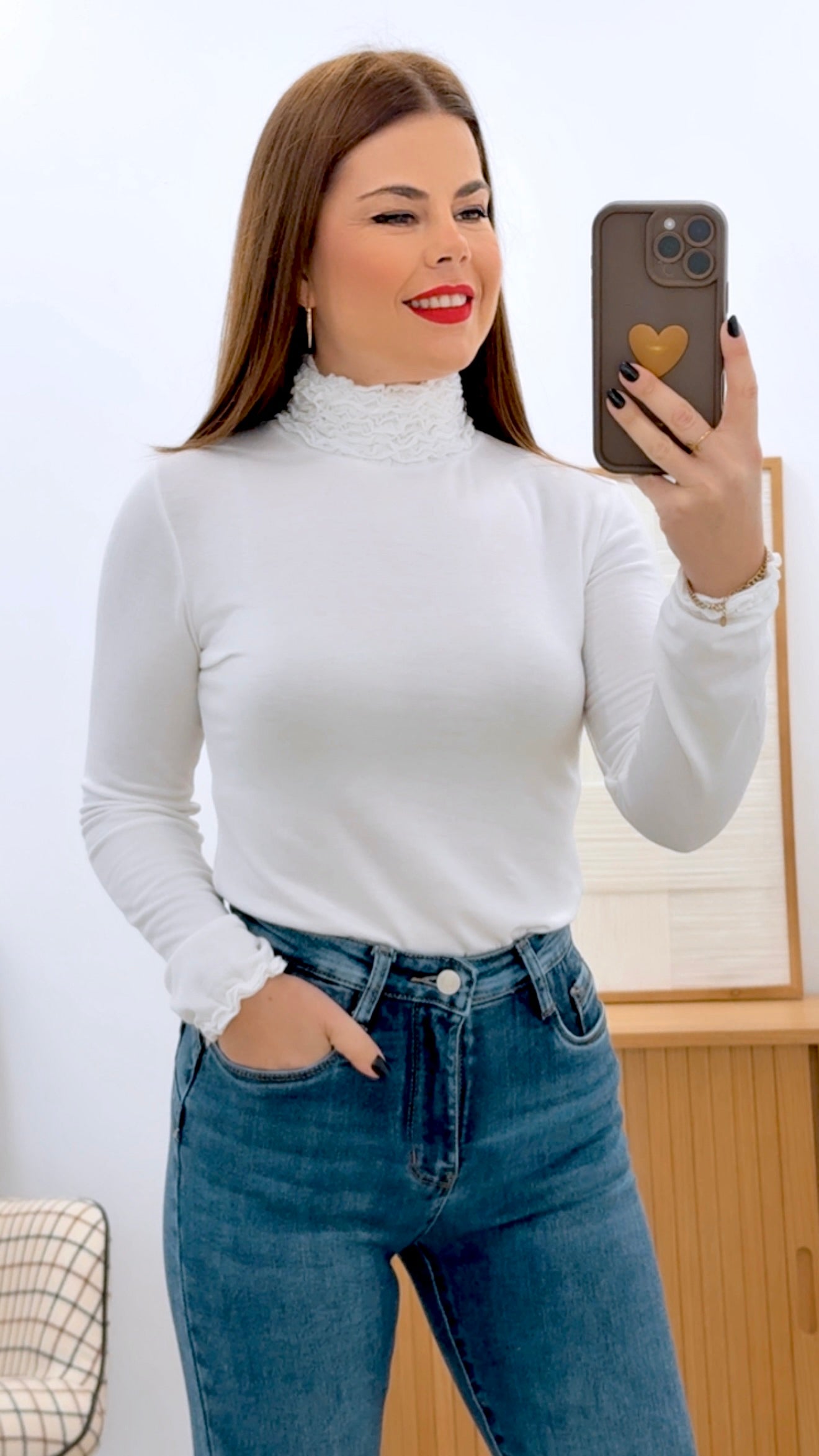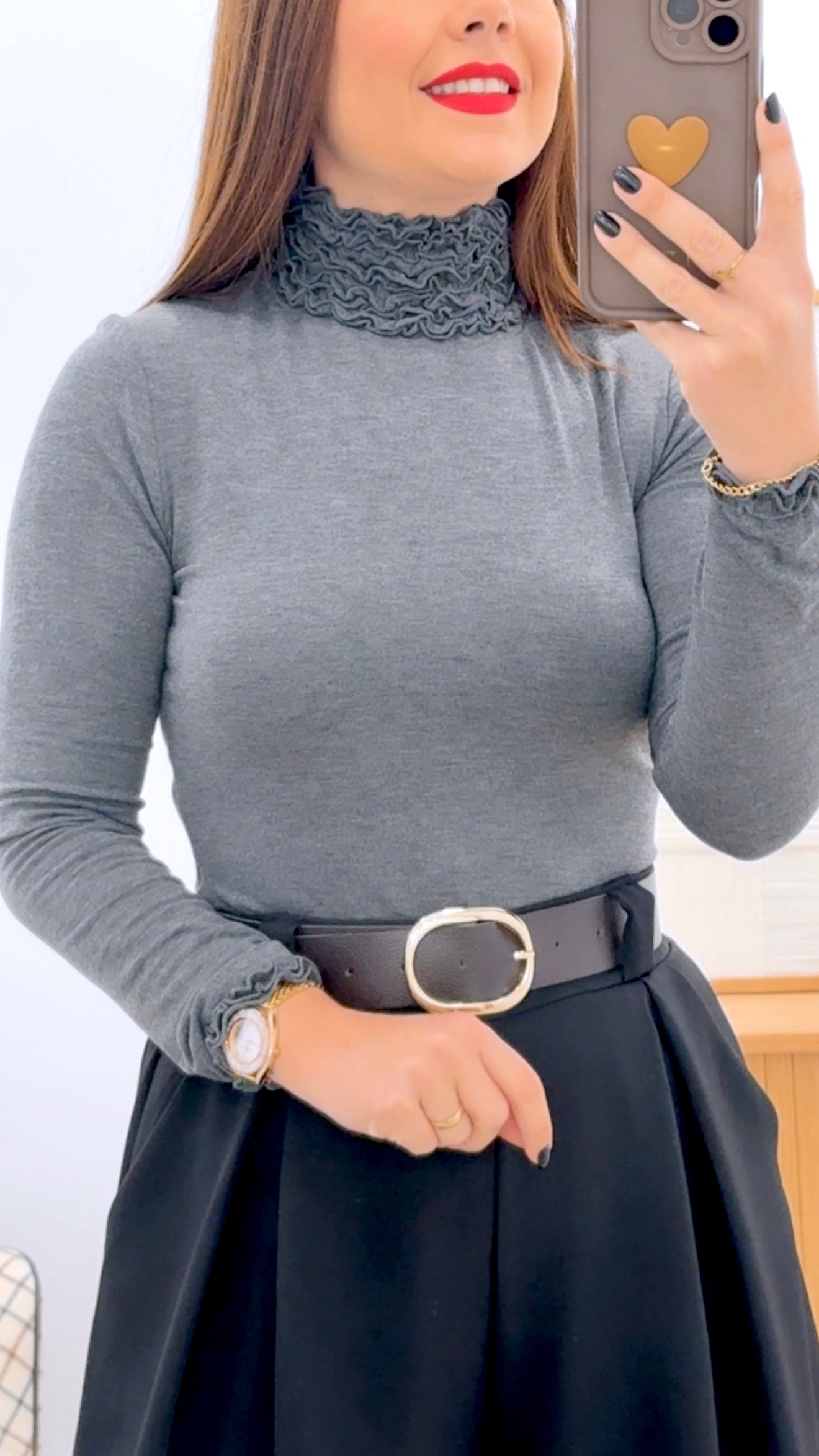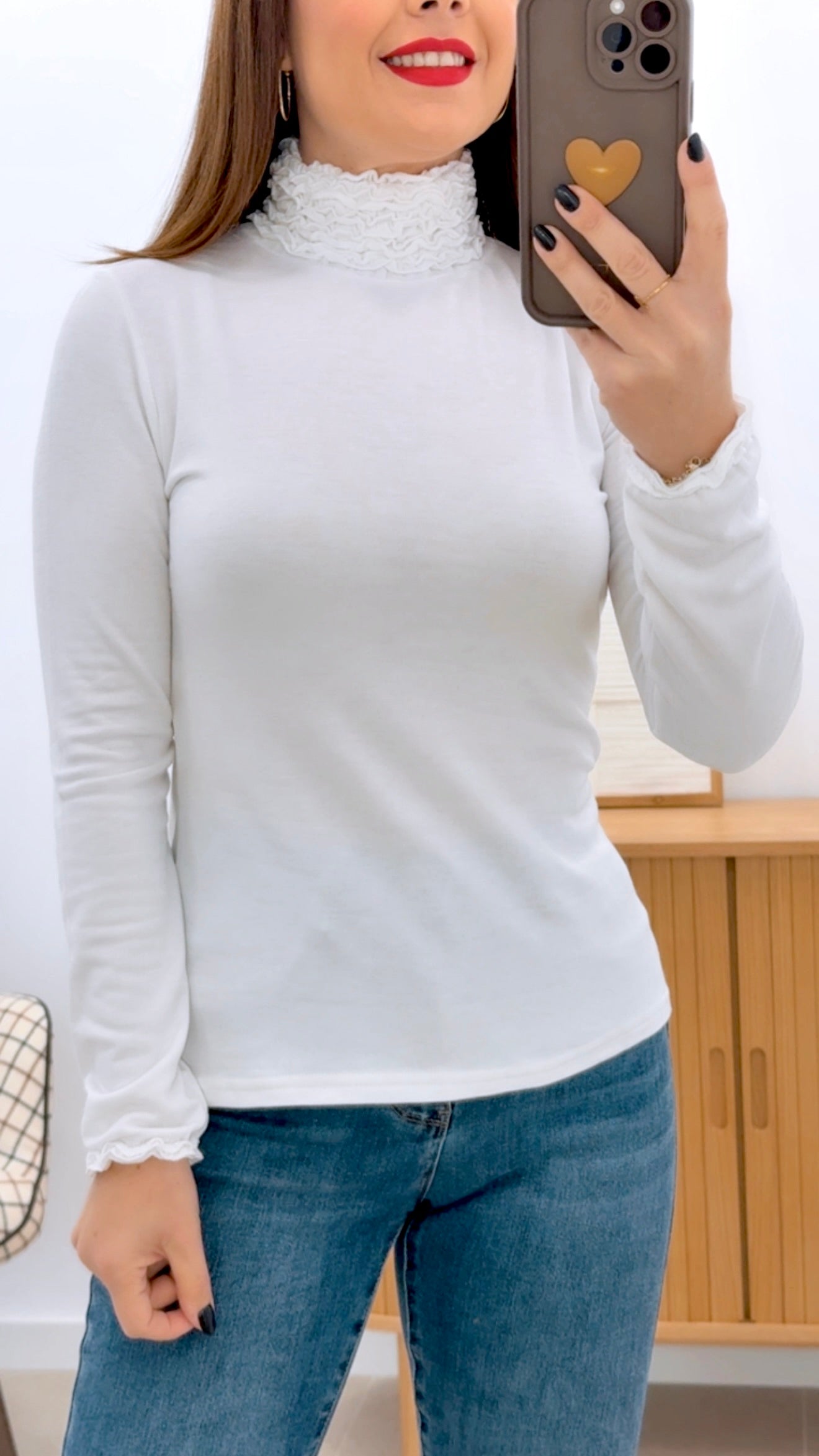 Camiseta confeccionada en viscosa de alta calidad con un toque de elasticidad que garantiza comodidad y libertad de movimiento. Destaca por su elegante cuello cisne con detalle de felpa y mangas fruncidas que añaden sofisticación al diseño. La composición de 95% viscosa y 5% elastano proporciona una caída fluida y un ajuste adaptable. Disponible en múltiples colores y dos tallas para encontrar tu opción perfecta.