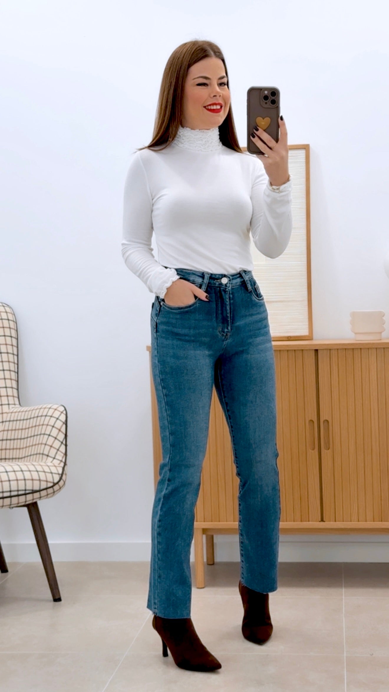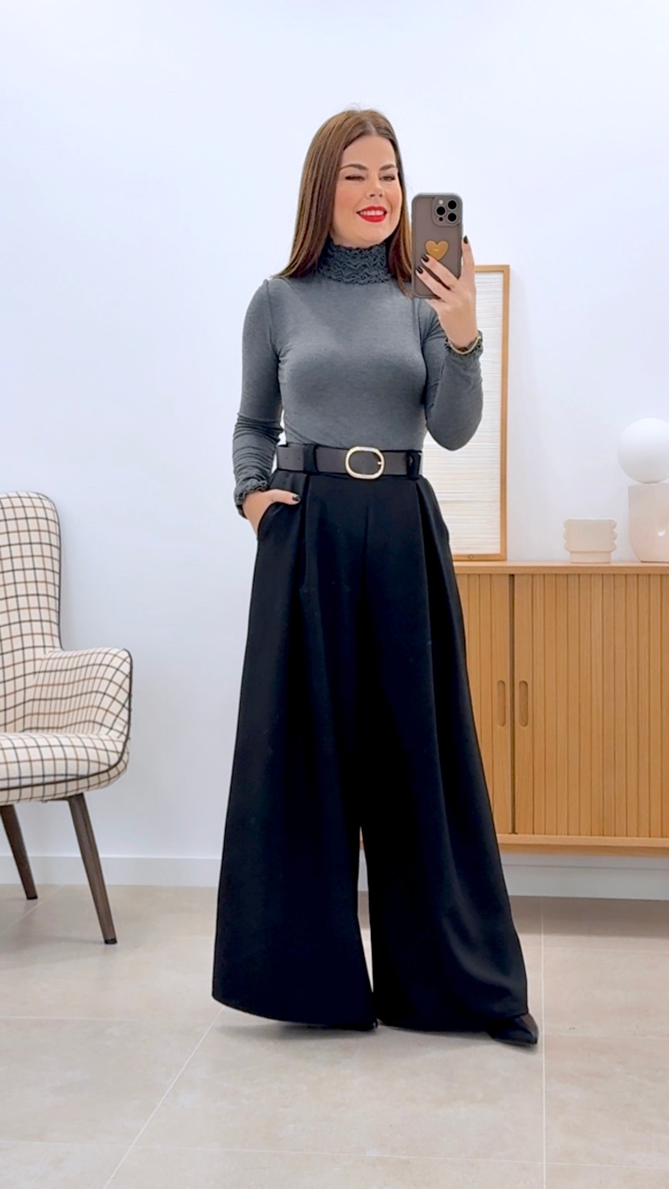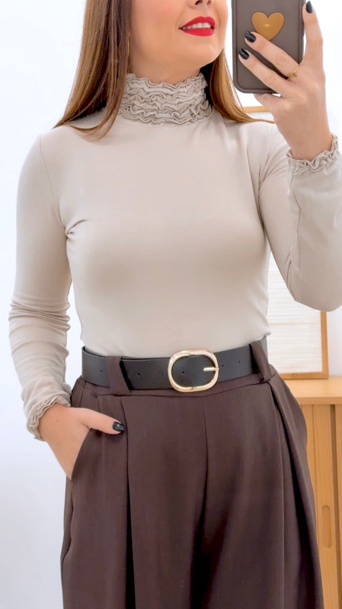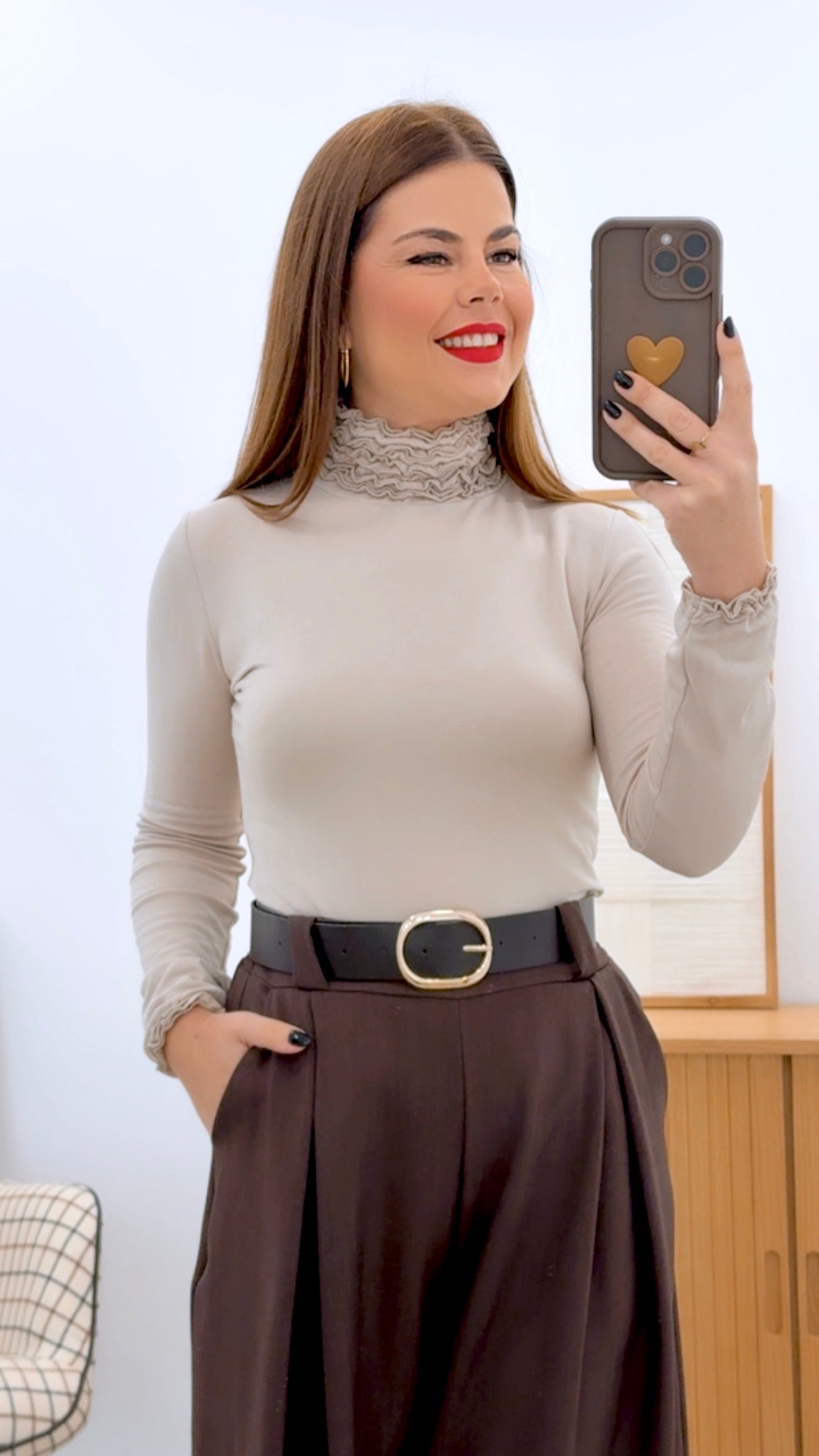 Camiseta confeccionada en viscosa de alta calidad con un toque de elasticidad que garantiza comodidad y libertad de movimiento. Destaca por su elegante cuello cisne con detalle de felpa y mangas fruncidas que añaden sofisticación al diseño. La composición de 95% viscosa y 5% elastano proporciona una caída fluida y un ajuste adaptable. Disponible en múltiples colores y dos tallas para encontrar tu opción perfecta.