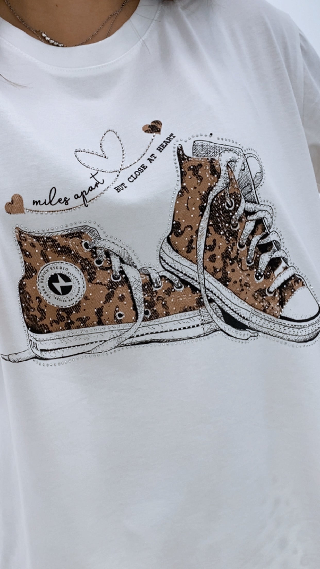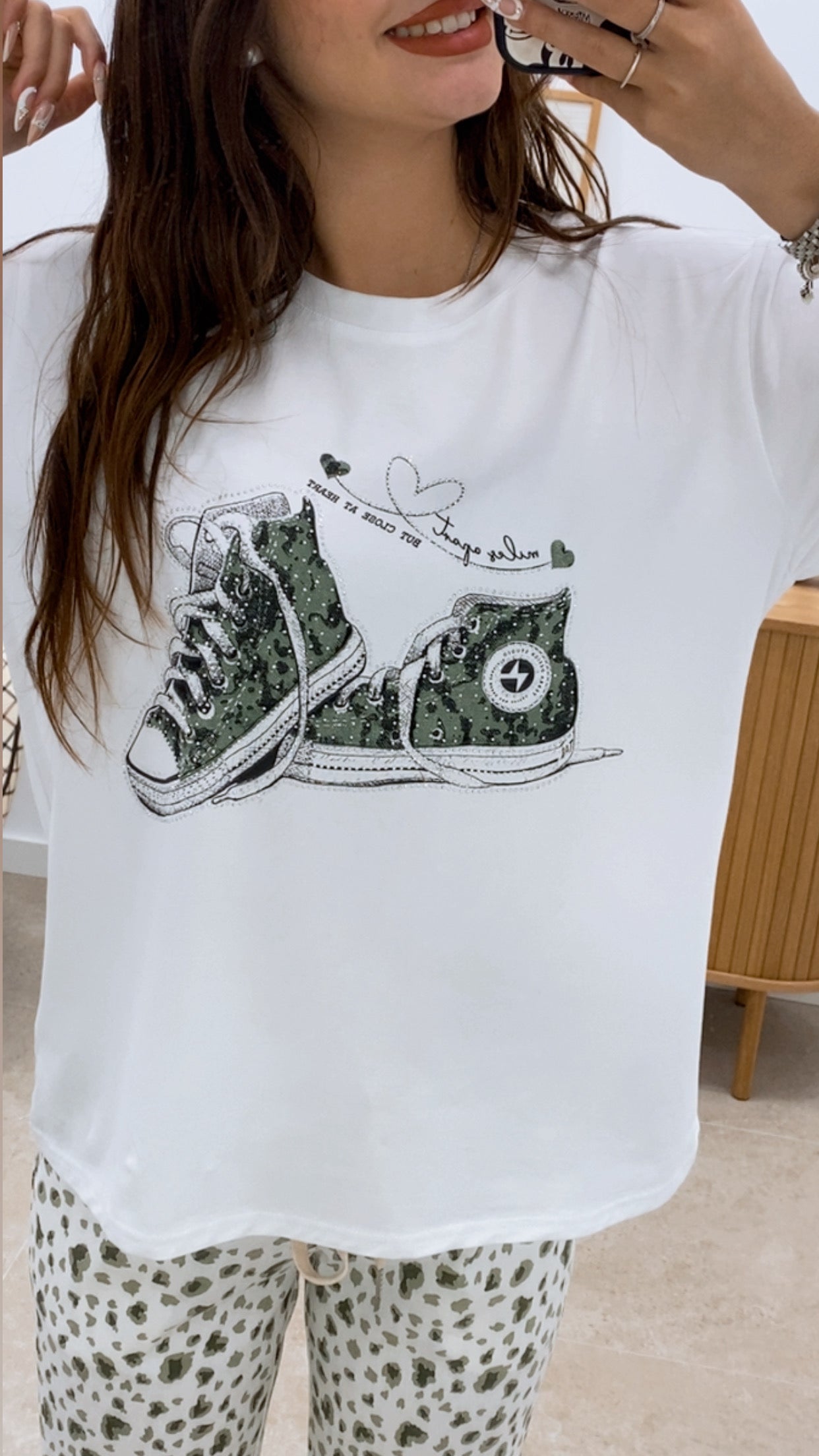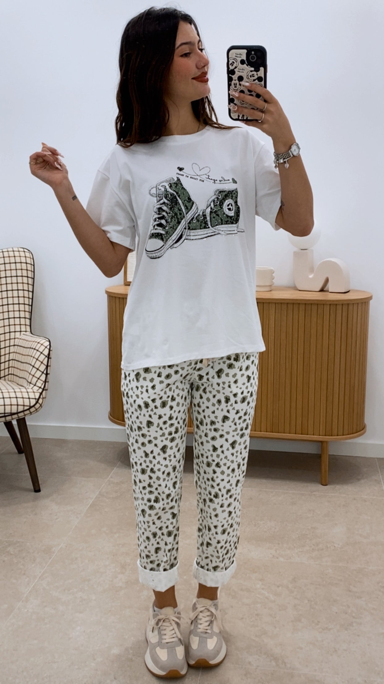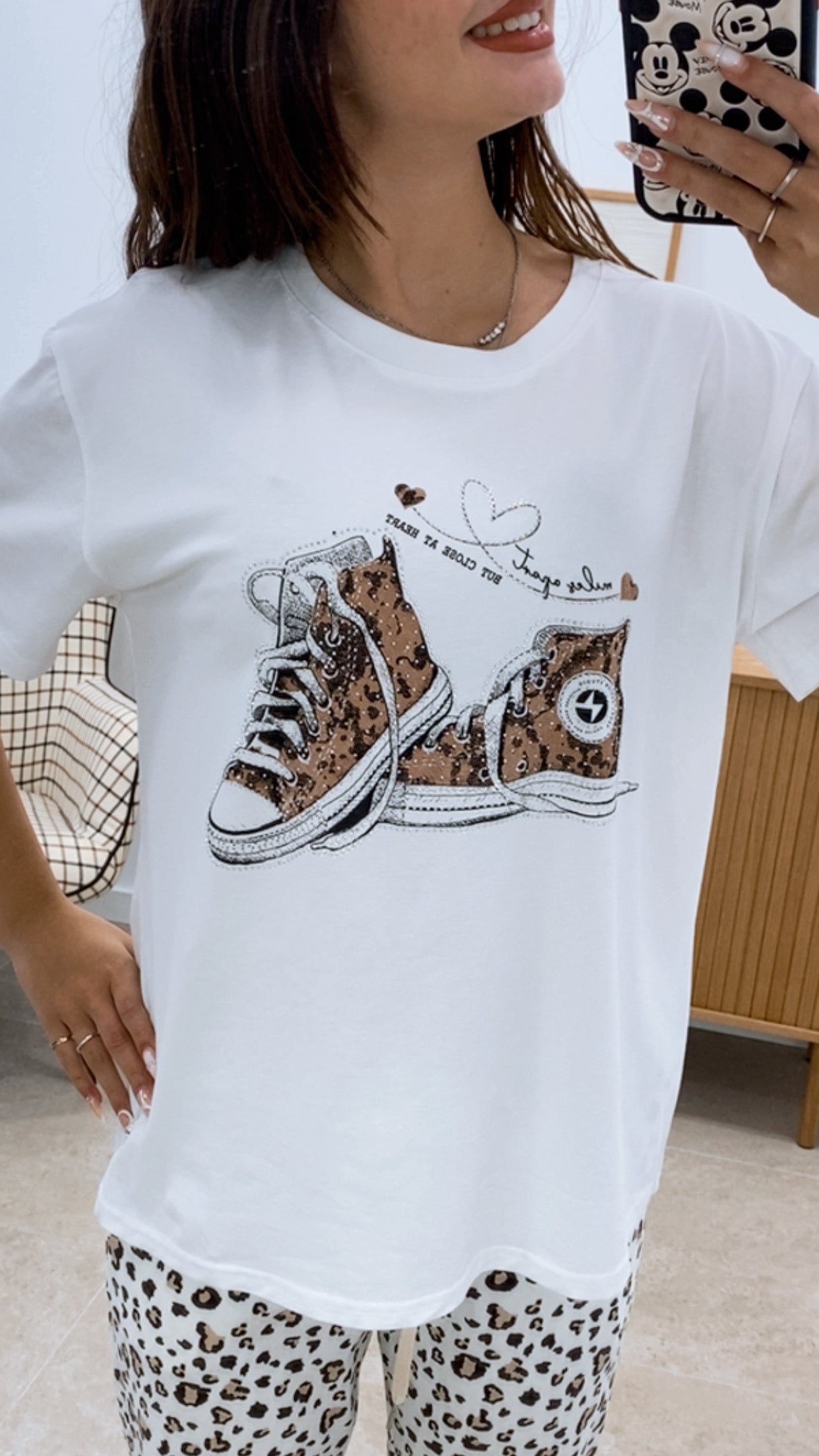 Camiseta de talla única con diseño estampado sobre fondo liso. Confeccionada en una mezcla de 95% algodón y 5% elastan que proporciona comodidad y elasticidad. Cuenta con cuello redondo y manga corta, perfecta para un uso casual y versátil. Un básico imprescindible en tu armario que combina estilo y practicidad.