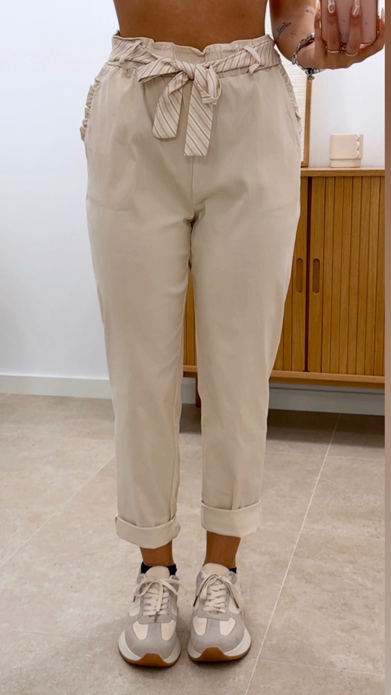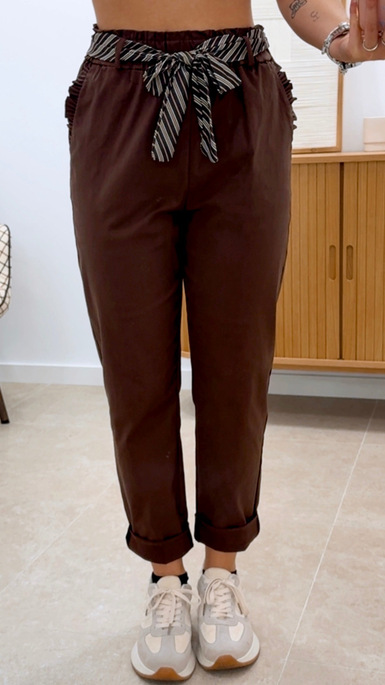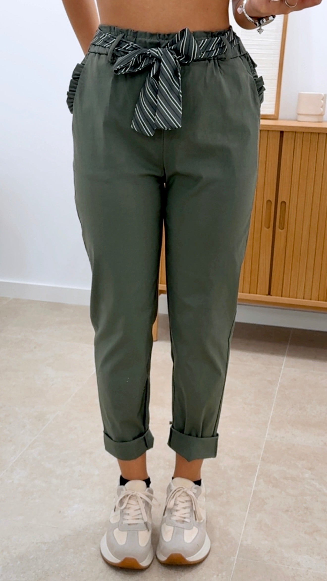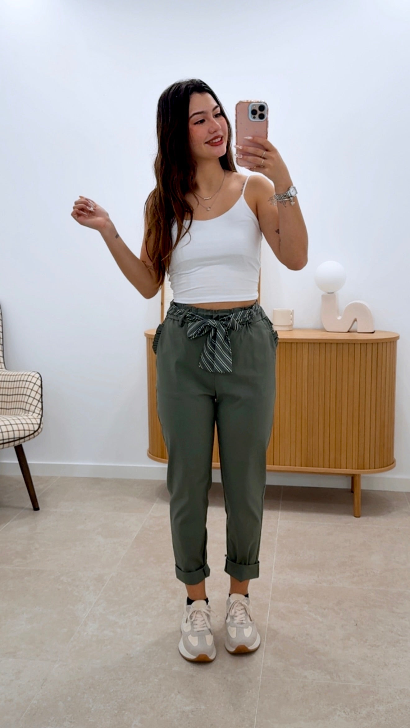 Pantalón elástico confeccionado en una suave mezcla de 75% viscosa, 22% nylon y 3% elastán que proporciona comodidad y flexibilidad. Diseño de talla única con cinturón y bolsillos decorados con volantes que añaden un toque de elegancia. Tejido de color liso que combina fácilmente con cualquier prenda de tu armario. Perfecto para un look casual y versátil.