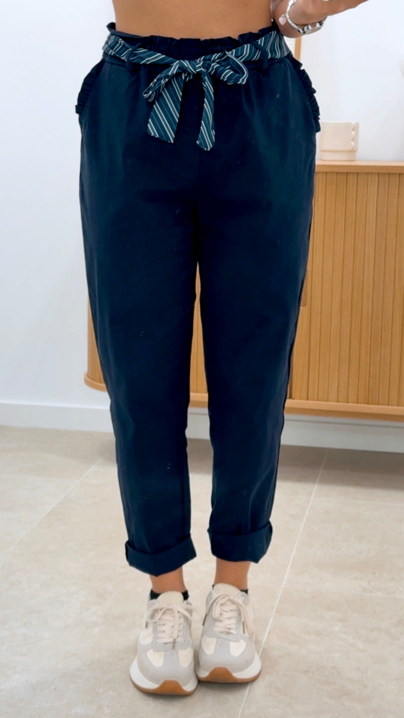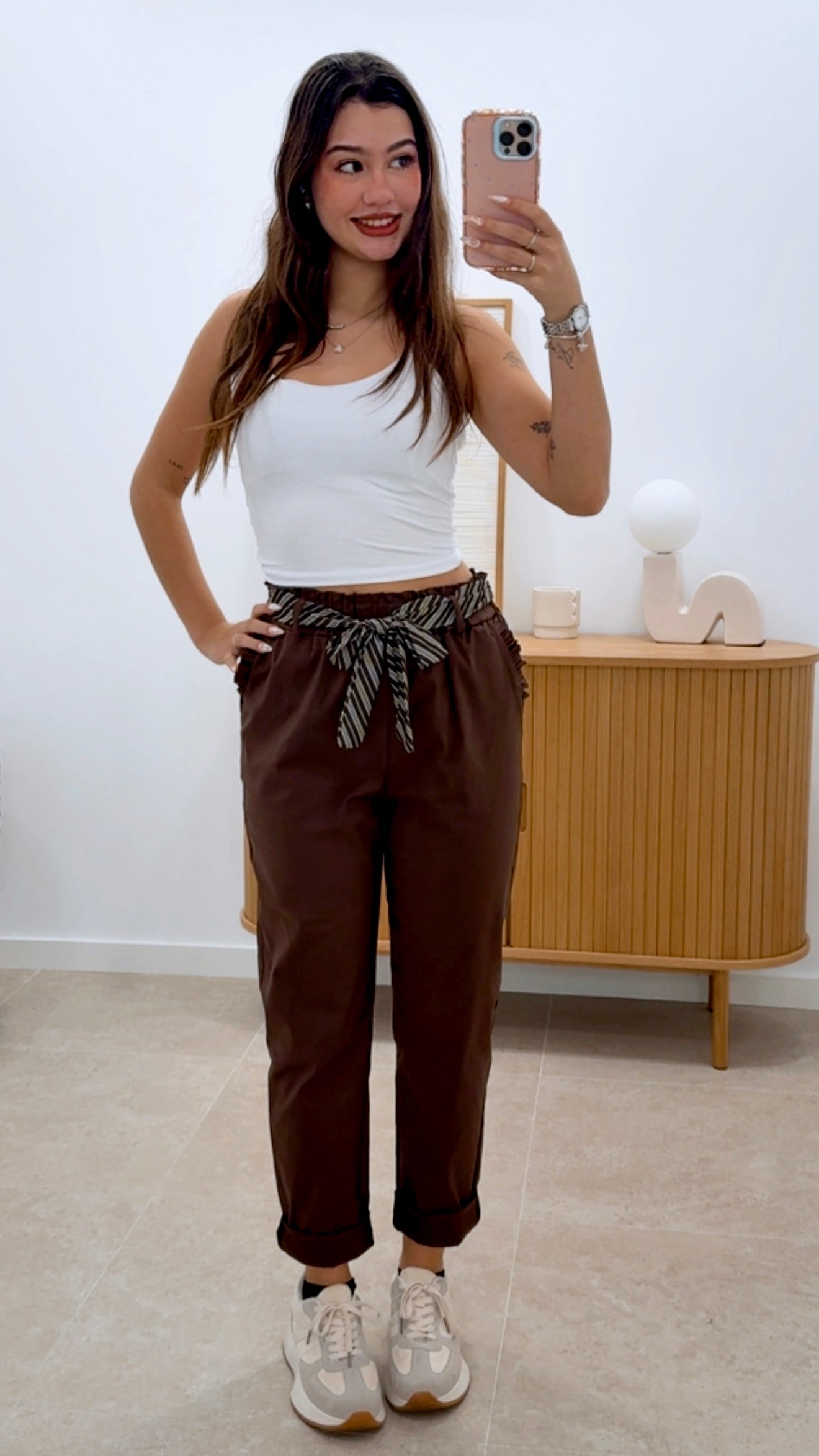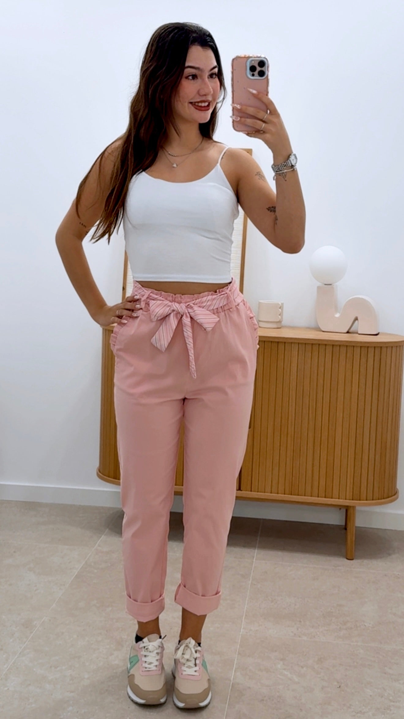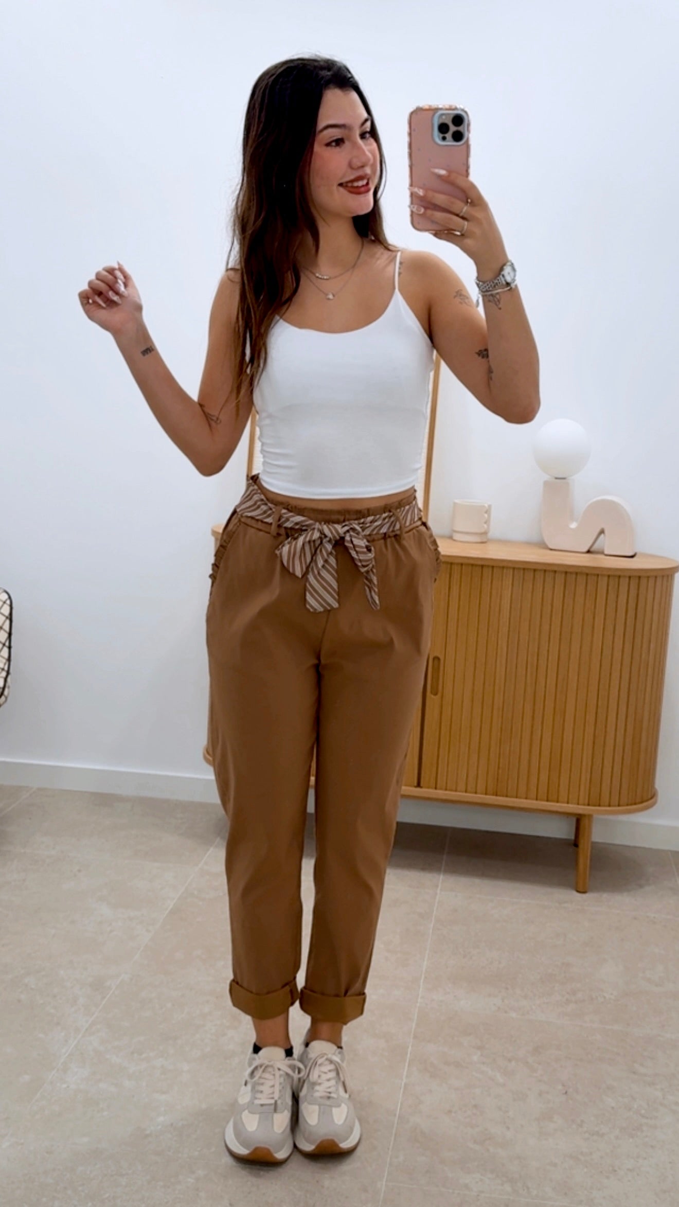 Pantalón elástico confeccionado en una suave mezcla de 75% viscosa, 22% nylon y 3% elastán que proporciona comodidad y flexibilidad. Diseño de talla única con cinturón y bolsillos decorados con volantes que añaden un toque de elegancia. Tejido de color liso que combina fácilmente con cualquier prenda de tu armario. Perfecto para un look casual y versátil.