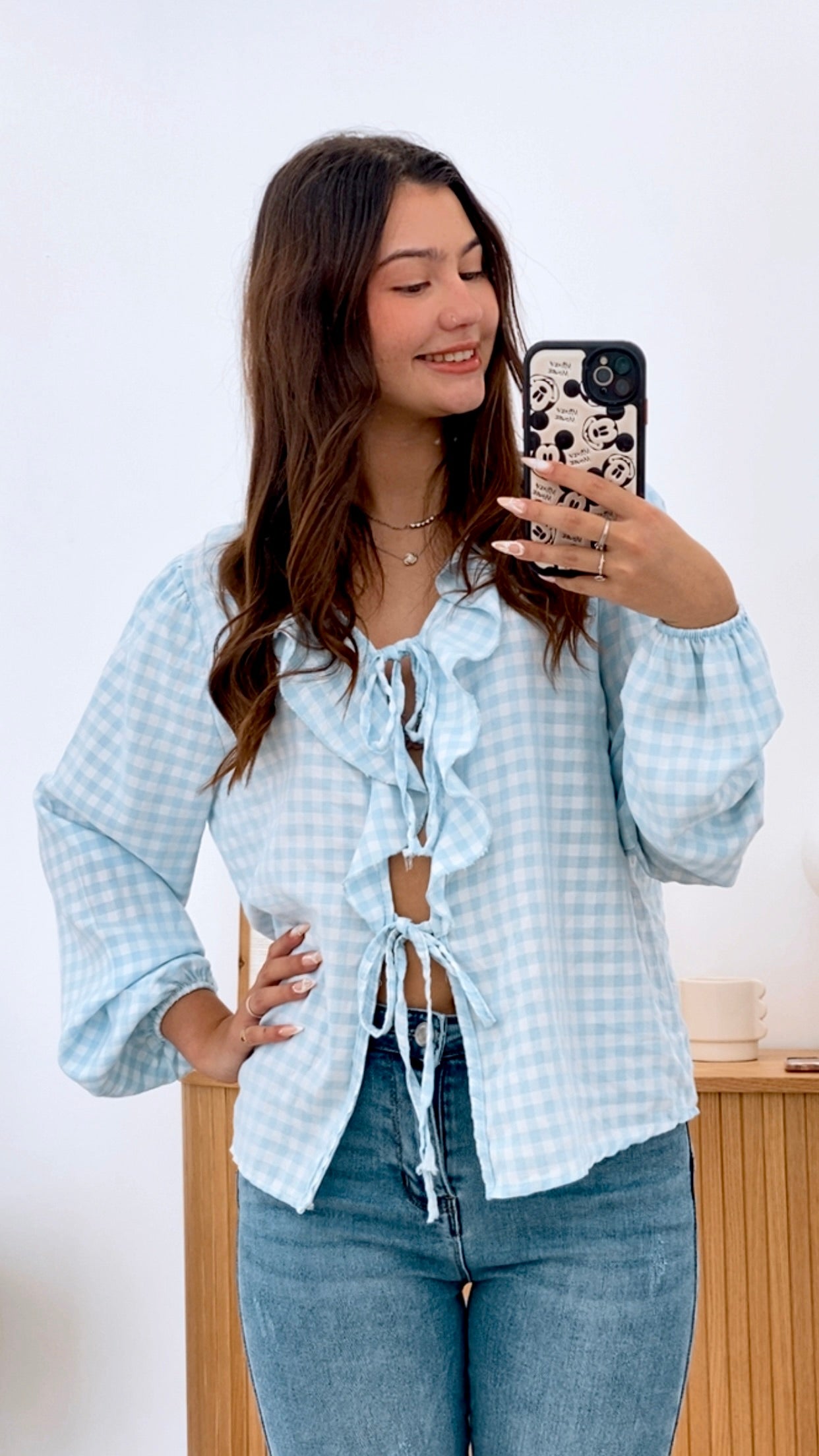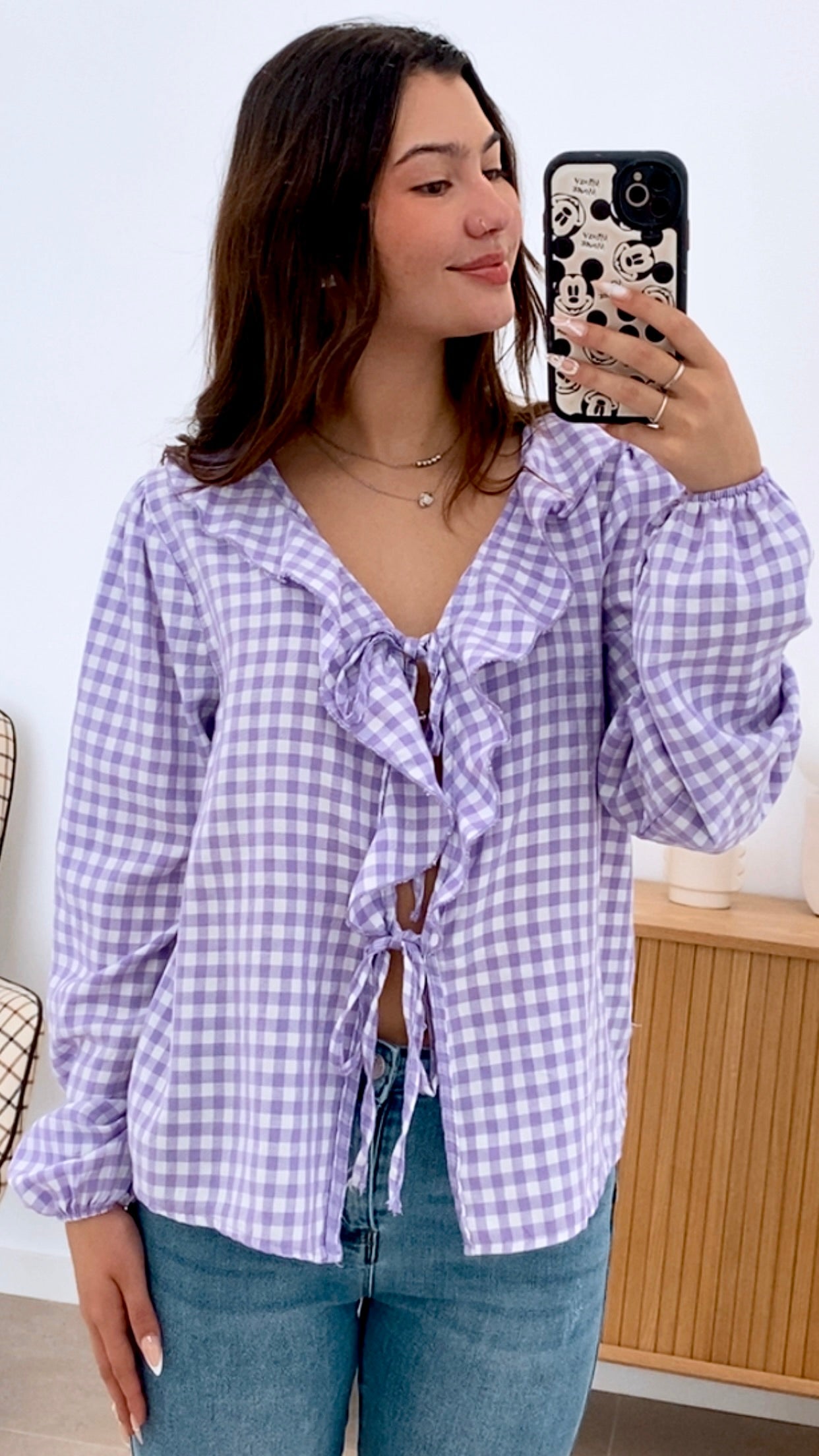 Blusa versátil en viscosa 100% que combina comodidad y estilo. Diseño con estampado vichy clásico y volante en la parte delantera, realzado por lazadas ajustables que permiten personalizar el ajuste según tus preferencias. Disponible en varios colores para adaptarse a cualquier look. Talla única, perfecta para un uso casual o más elegante.