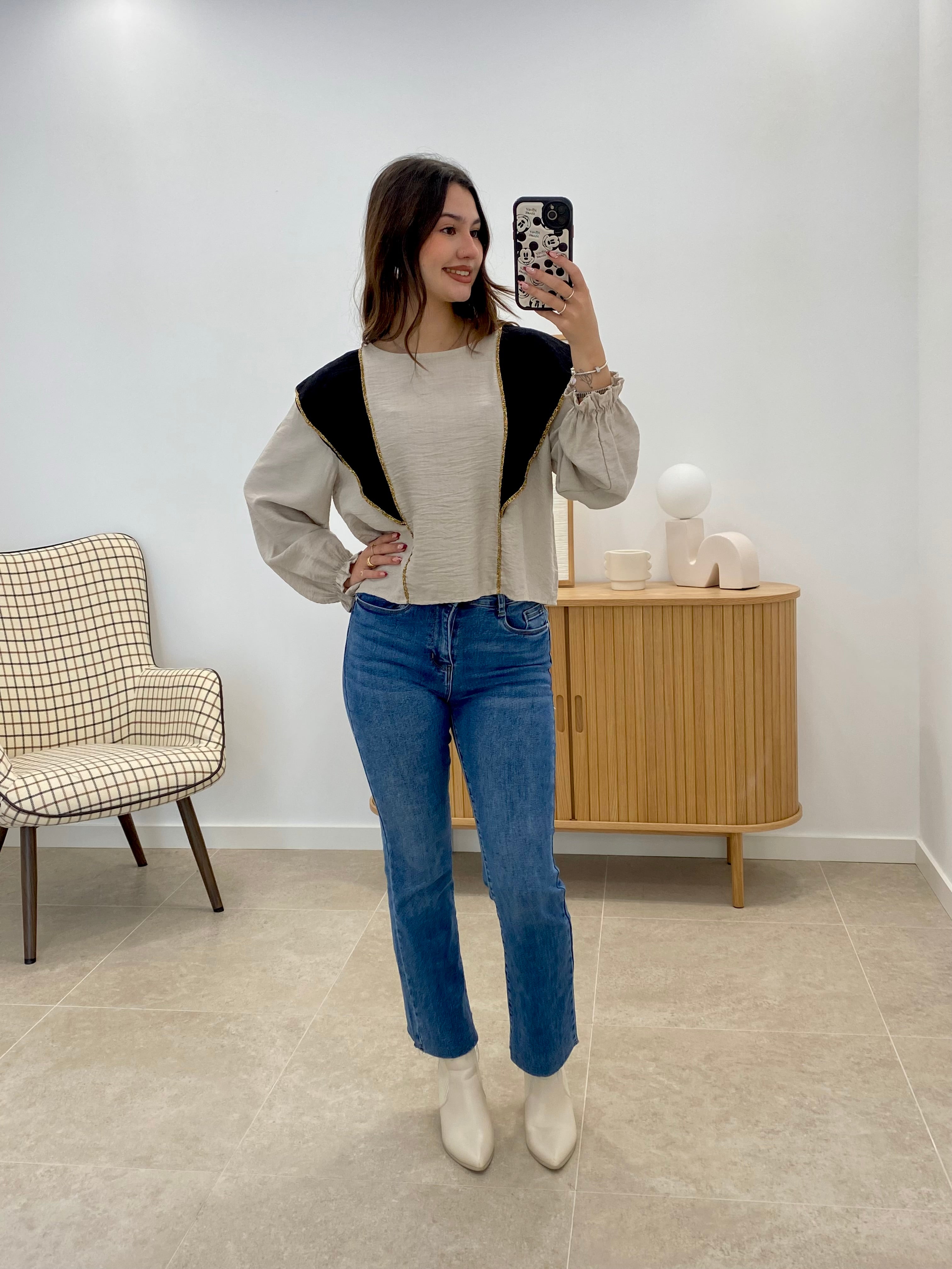 Blusa confeccionada en 100% viscosa pura que ofrece una caída elegante y un confort excepcional. El diseño bicolor combina beige y negro con volantes estratégicamente colocados que añaden movimiento y sofisticación. La viscosa proporciona transpirabilidad y una sensación suave al tacto, ideal para crear looks versátiles tanto en contextos casuales como más formales. Disponible en talla única, se adapta a diferentes siluetas gracias a su corte generoso. Una pieza versátil que se convierte en básico imprescindible del armario.