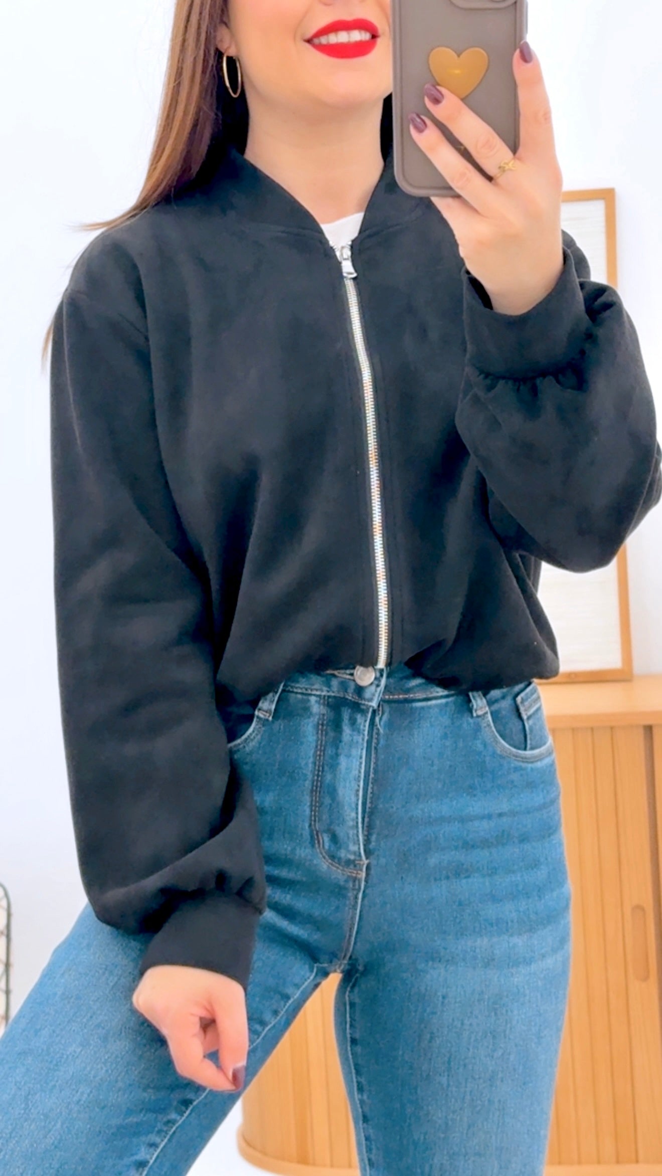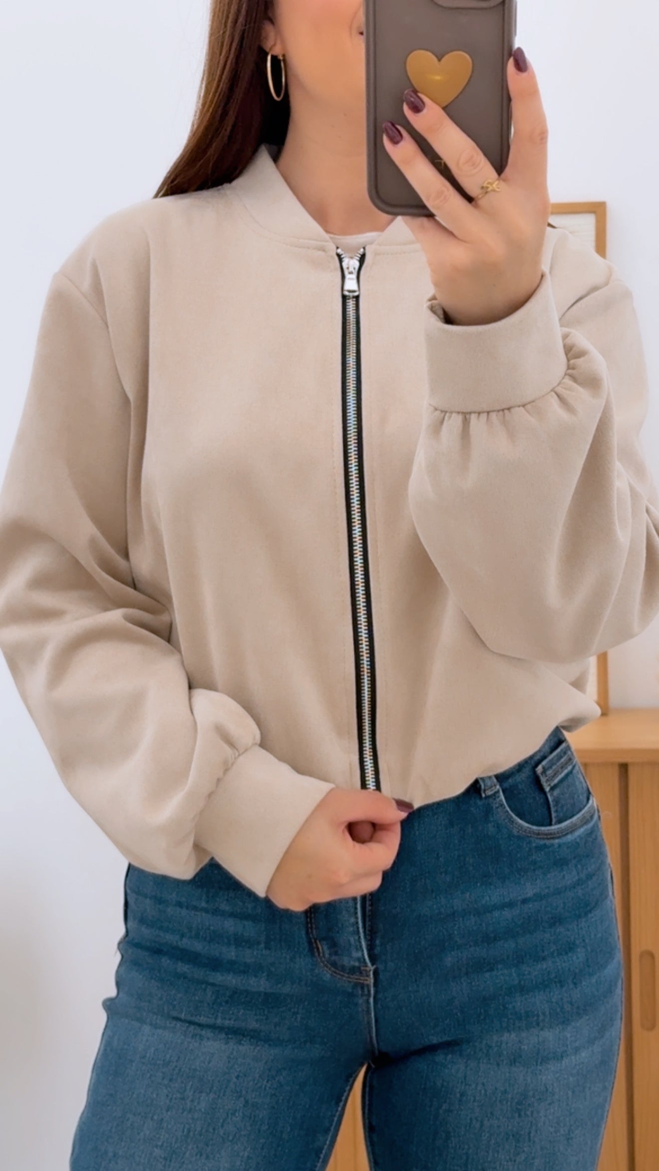 Bomber de antelina con un acabado suave y versátil que se adapta a cualquier estilo. Diseñado sin forro para mayor ligereza, cuenta con mangas largas ajustables mediante puños elásticos que permiten personalizar el ajuste según tus preferencias. El cierre frontal con cremallera facilita la apertura rápida, mientras que los bolsillos funcionales ofrecen espacio práctico para tus pertenencias. Disponible en una variada gama de colores para que encuentres la opción que mejor complemente tu guardarropa.