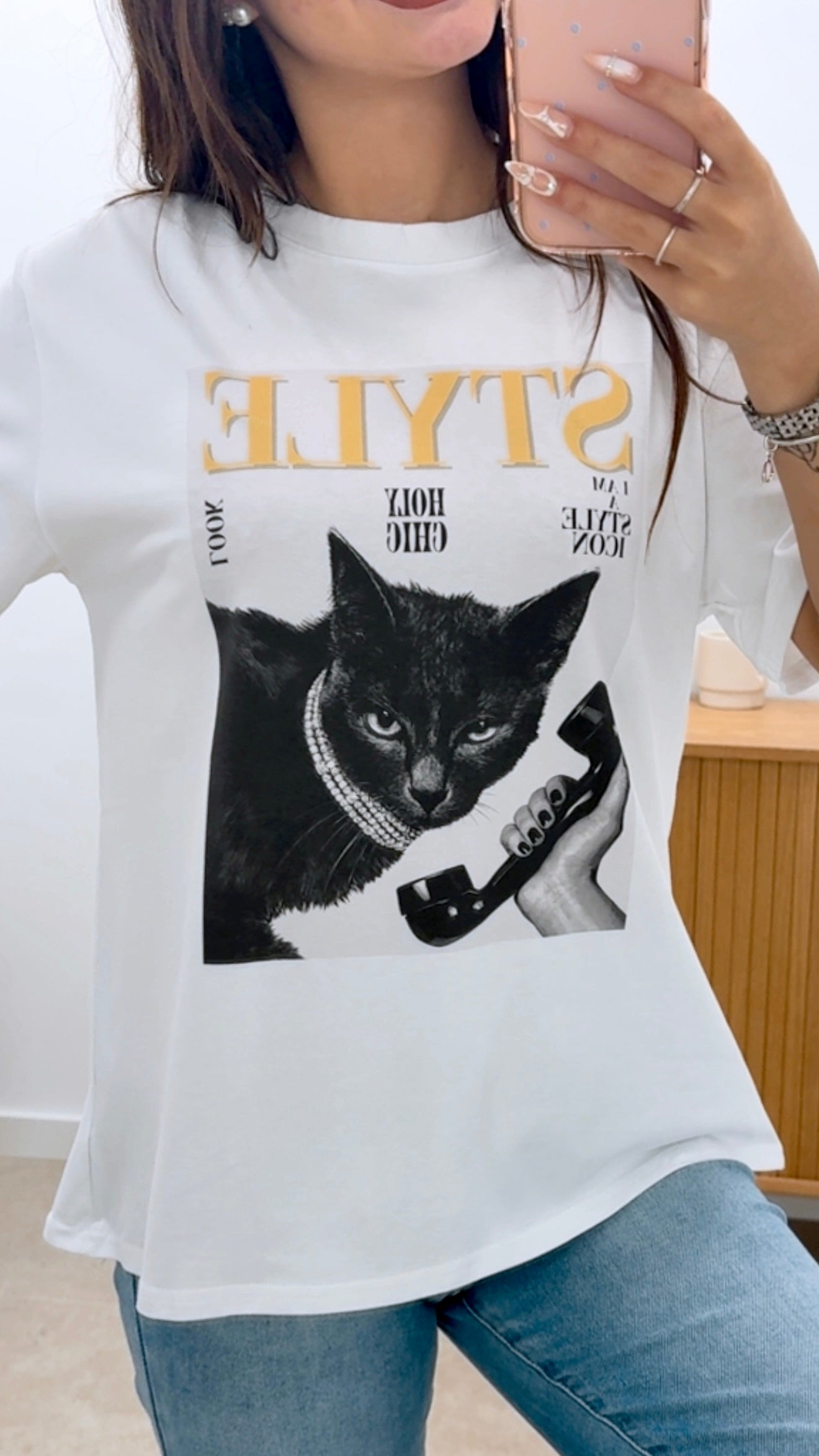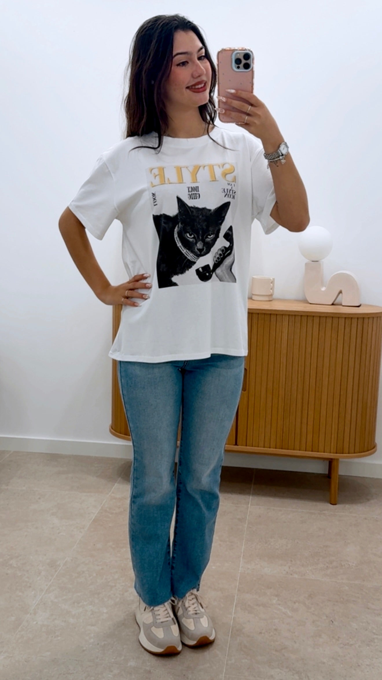 Camiseta versátil en talla única con manga corta y cuello redondo. Confeccionada en una mezcla de 95% algodón y 5% elastano que proporciona comodidad y elasticidad. Presenta un estampado distintivo sobre fondo liso que le da un toque moderno y casual. Perfecta para el día a día, combina practicidad con estilo.
