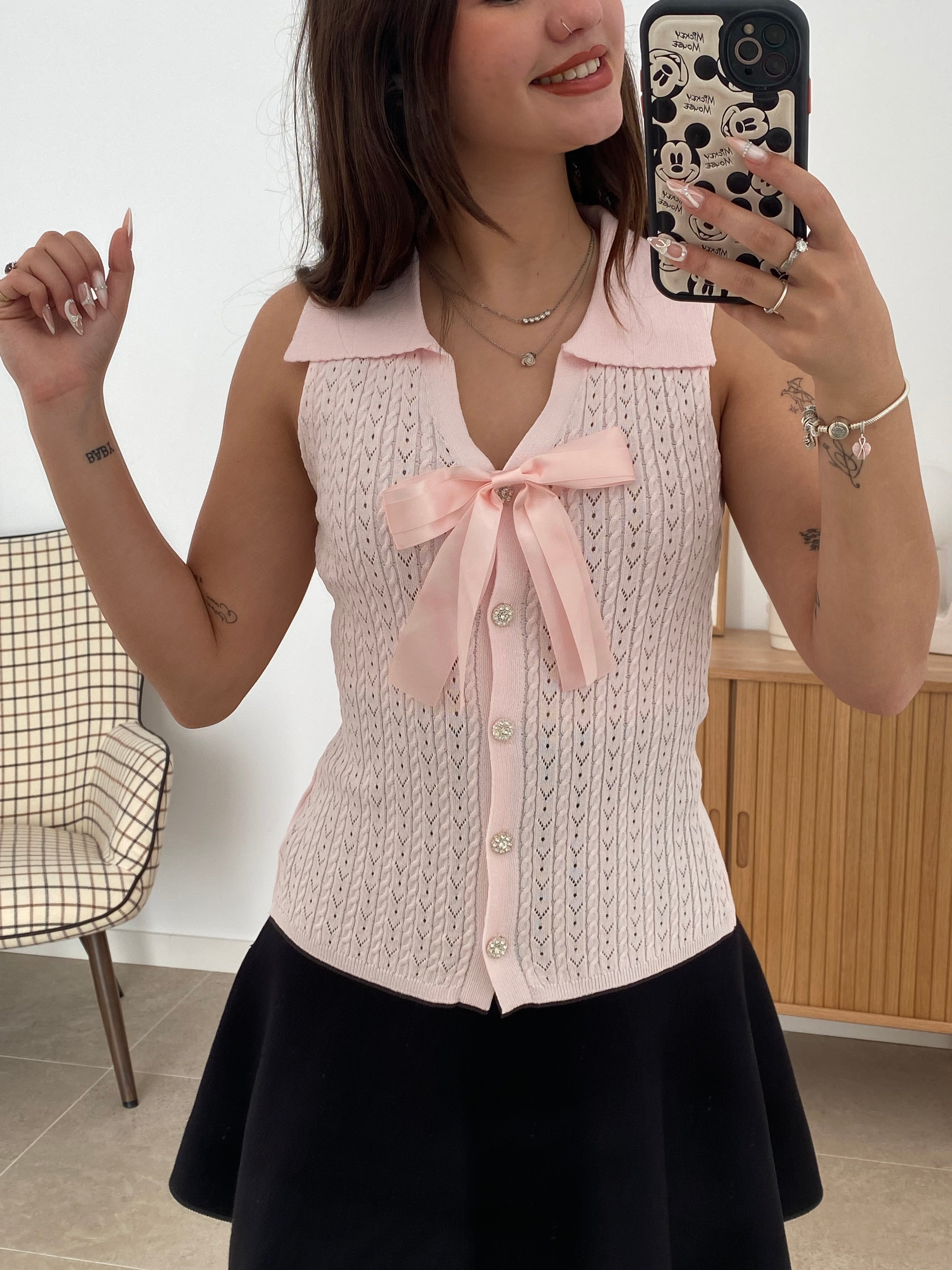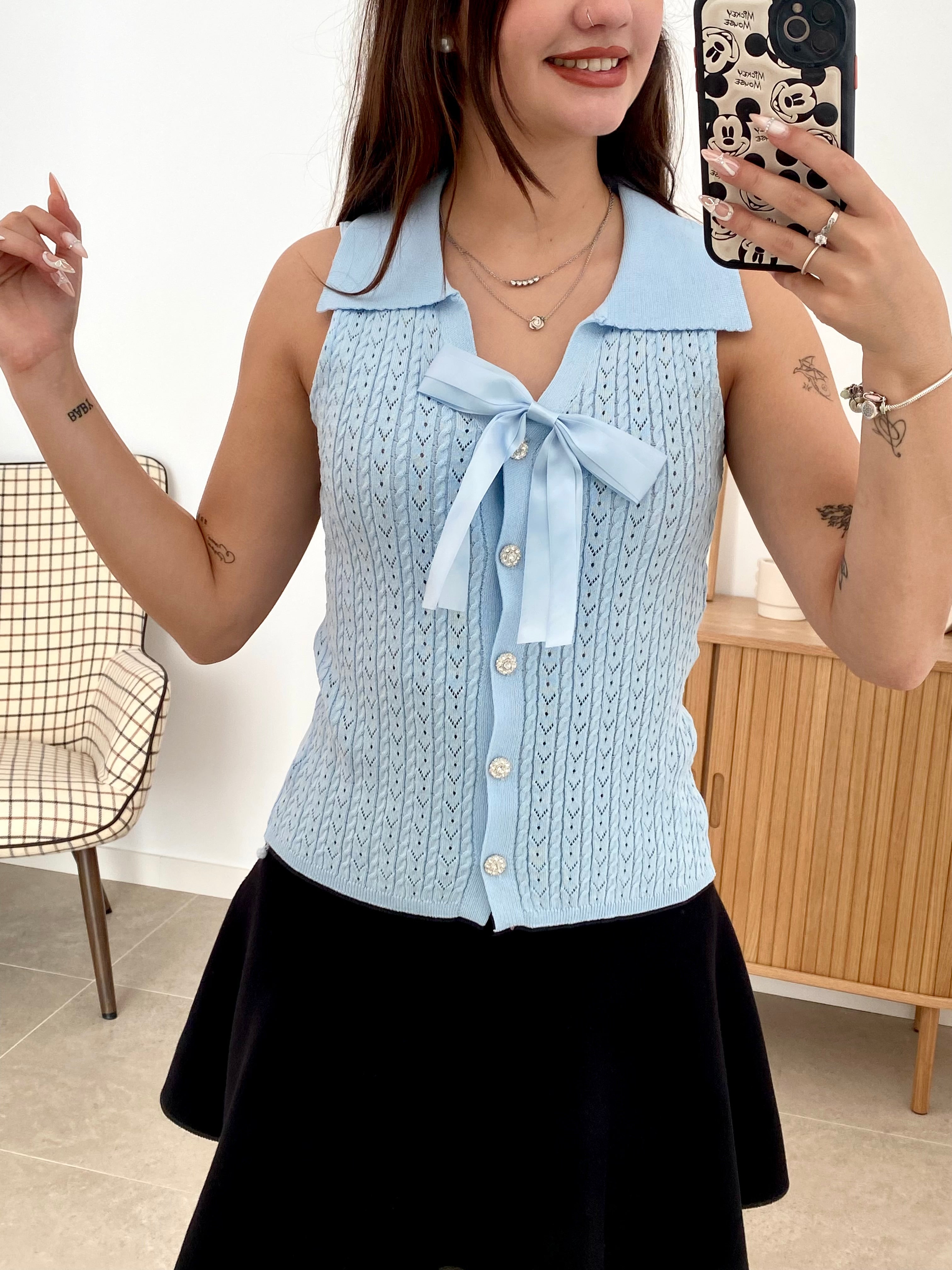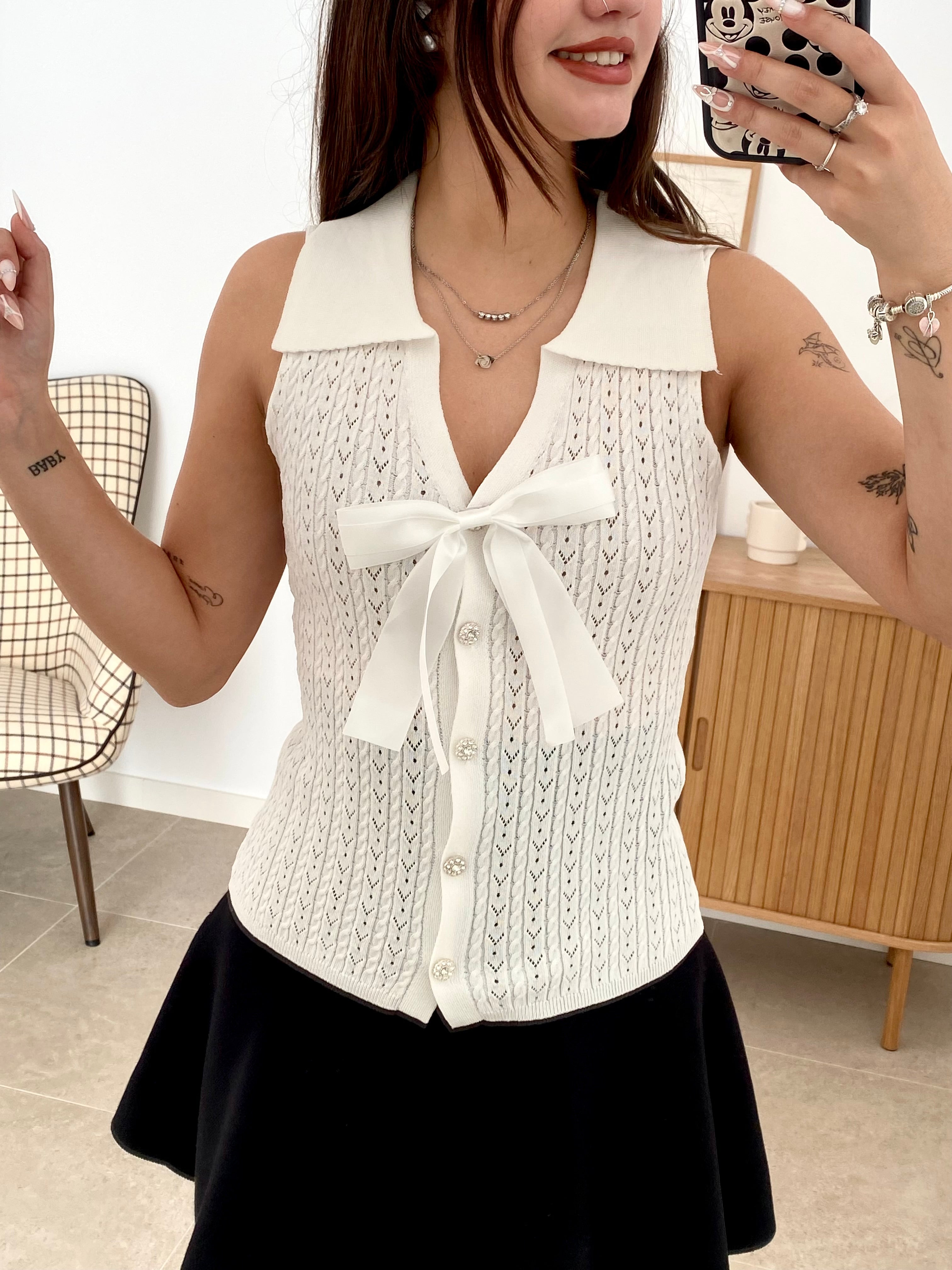 Chaleco versátil de talla única confeccionado en una mezcla de 68% viscosa y 32% poliéster que garantiza comodidad y durabilidad. Destaca por su cuello solapado de corte clásico y su lazo decorativo extraíble mediante broche, permitiéndote adaptar el look según la ocasión. Los botones brillantes añaden un toque de sofisticación a este diseño de color liso. Una pieza esencial que combina elegancia funcional con versatilidad estilística.