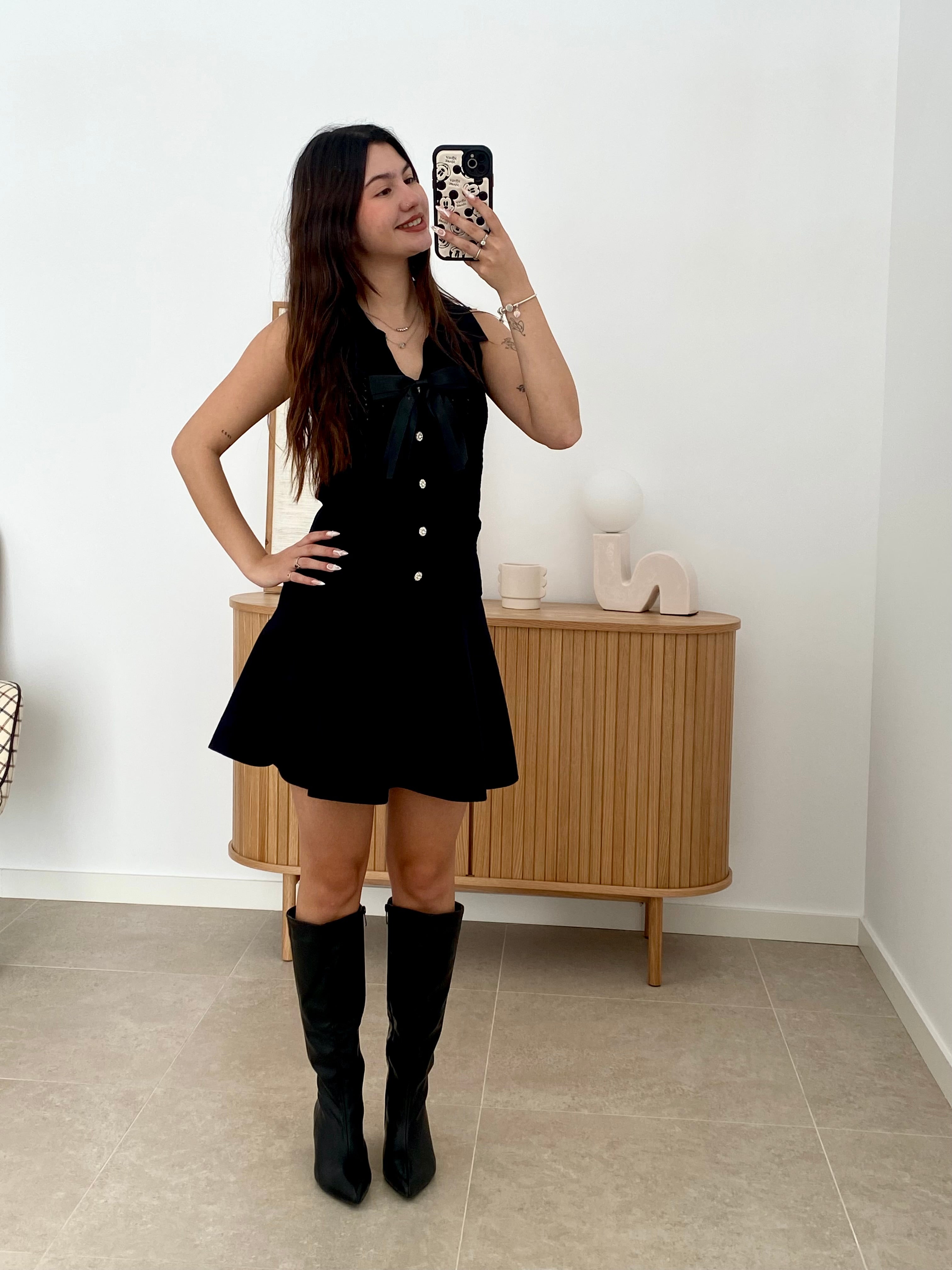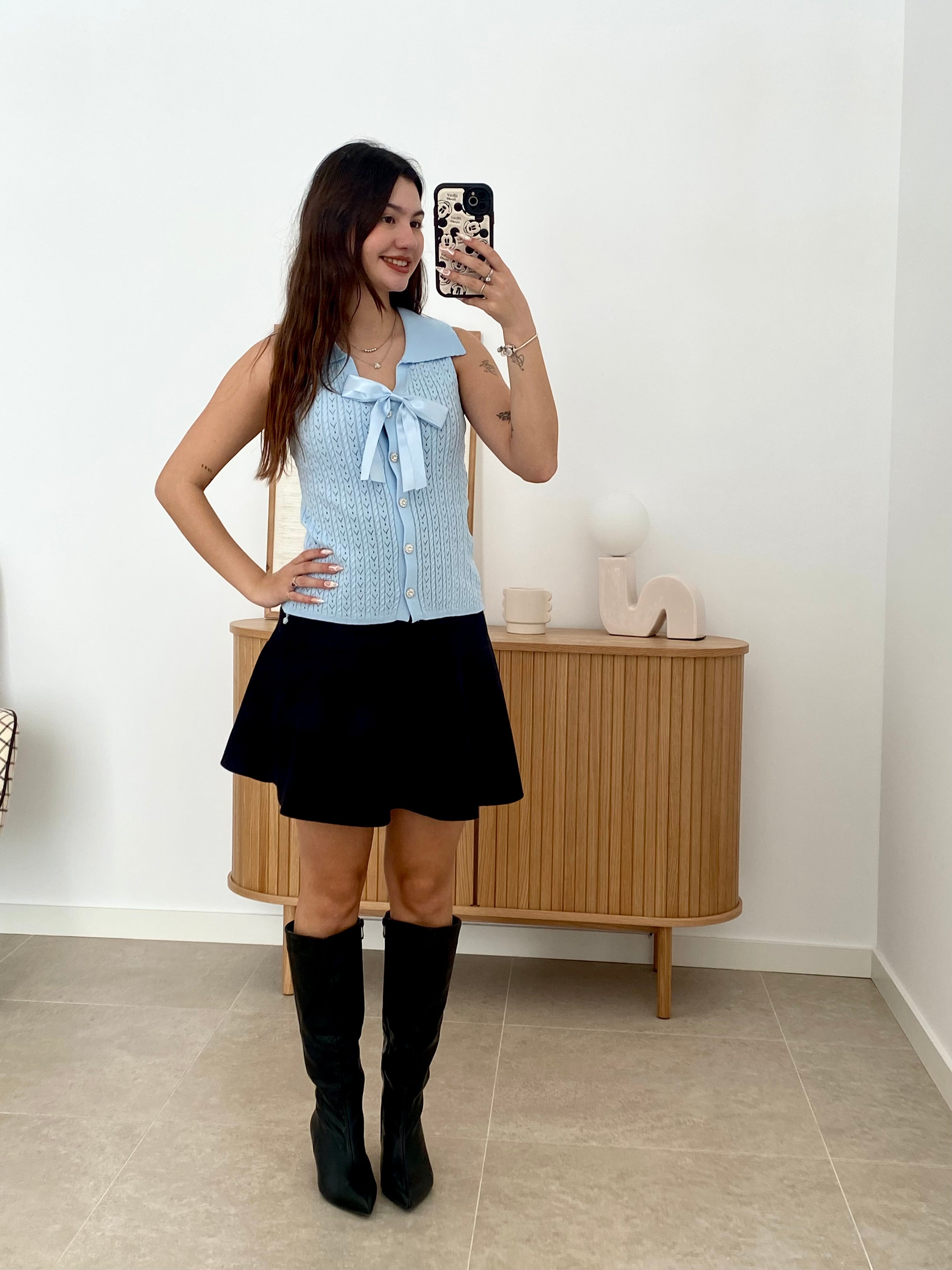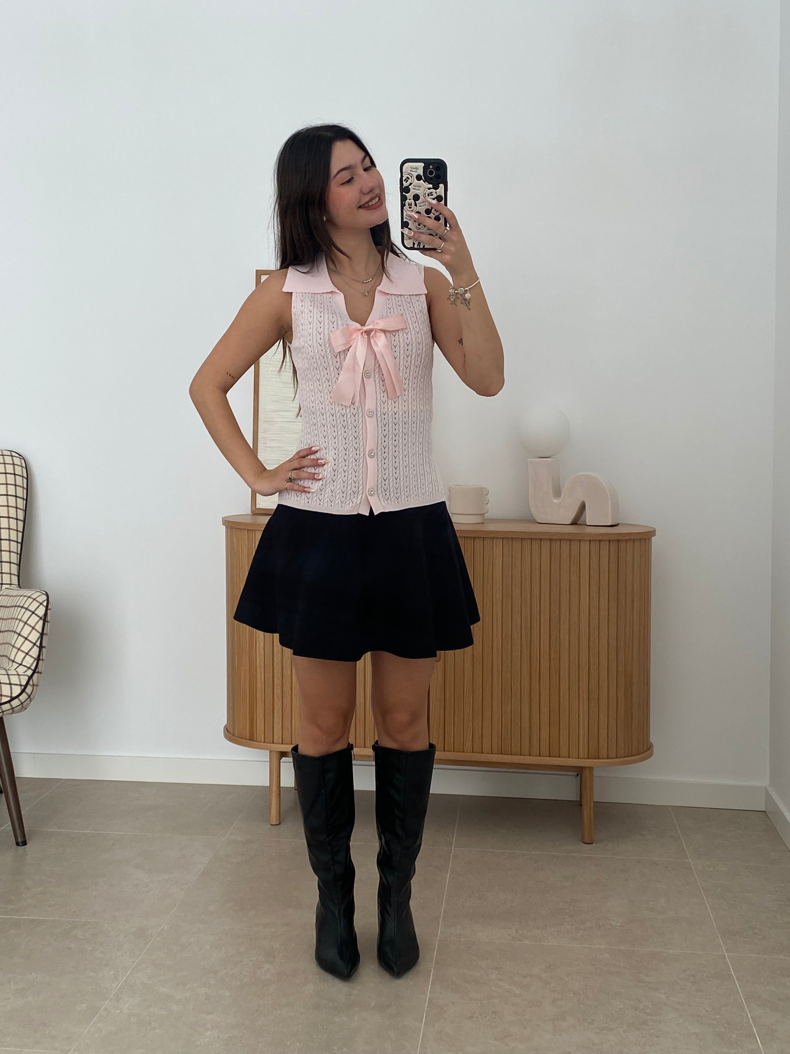 Chaleco versátil de talla única confeccionado en una mezcla de 68% viscosa y 32% poliéster que garantiza comodidad y durabilidad. Destaca por su cuello solapado de corte clásico y su lazo decorativo extraíble mediante broche, permitiéndote adaptar el look según la ocasión. Los botones brillantes añaden un toque de sofisticación a este diseño de color liso. Una pieza esencial que combina elegancia funcional con versatilidad estilística.
