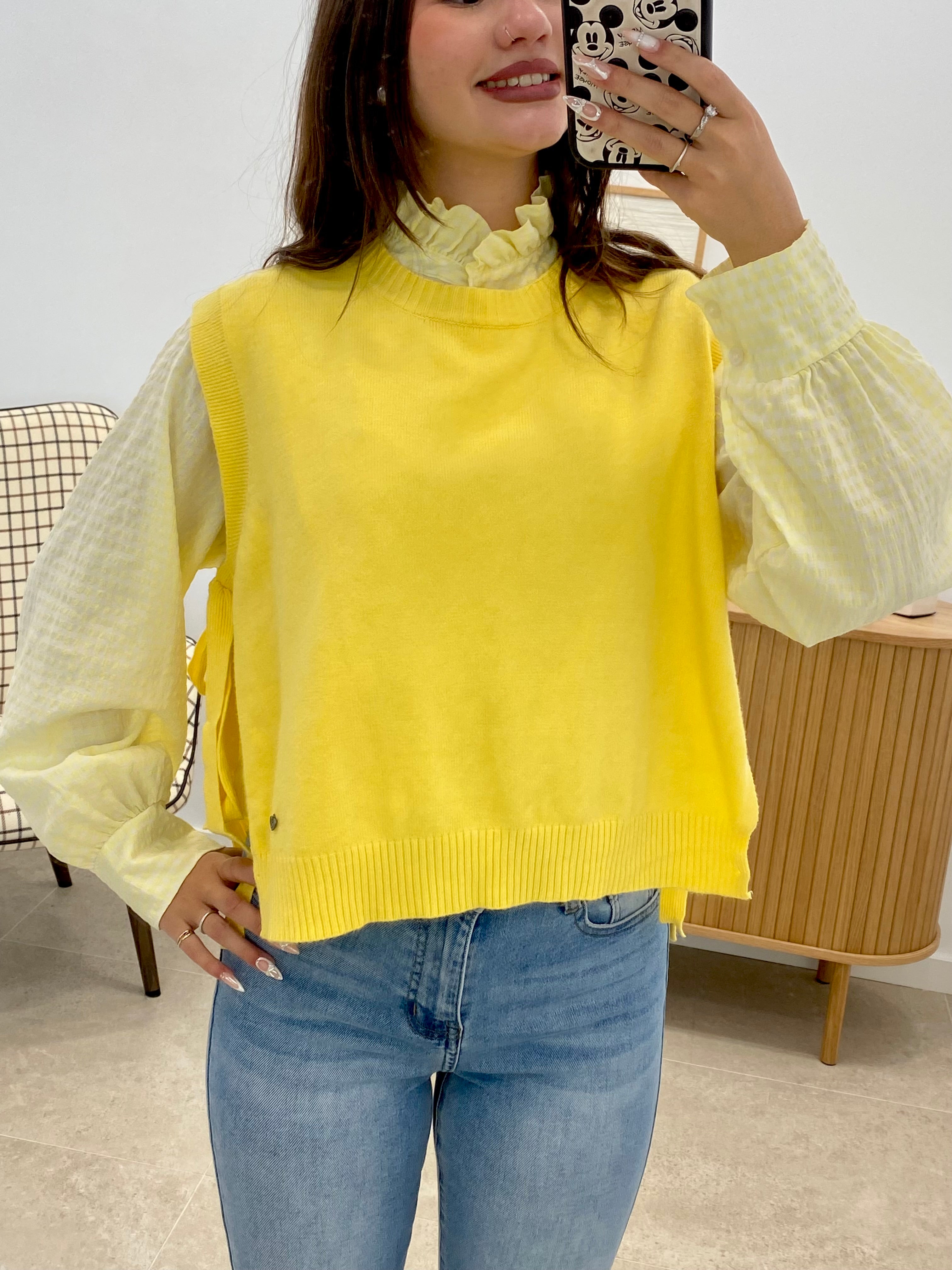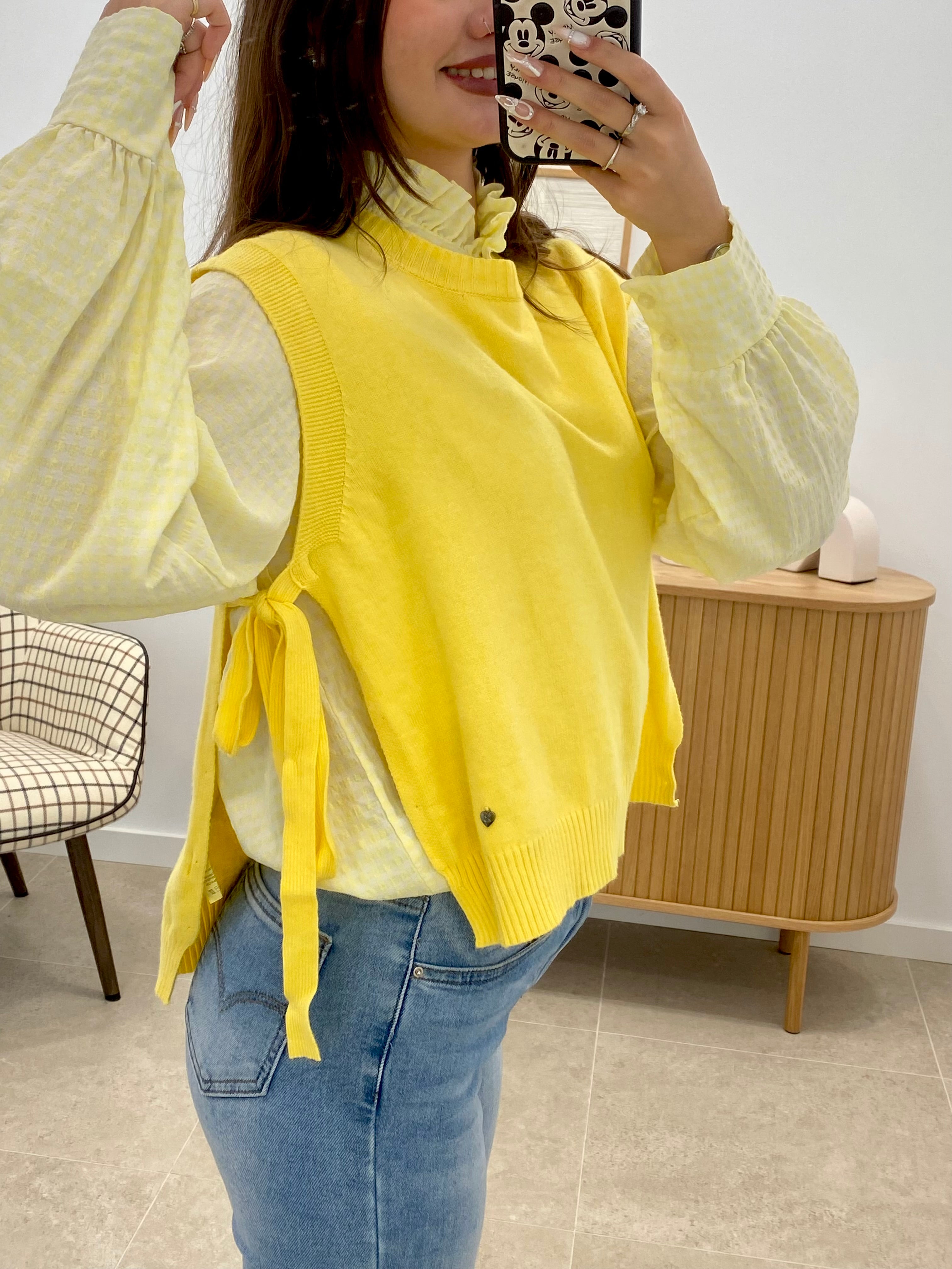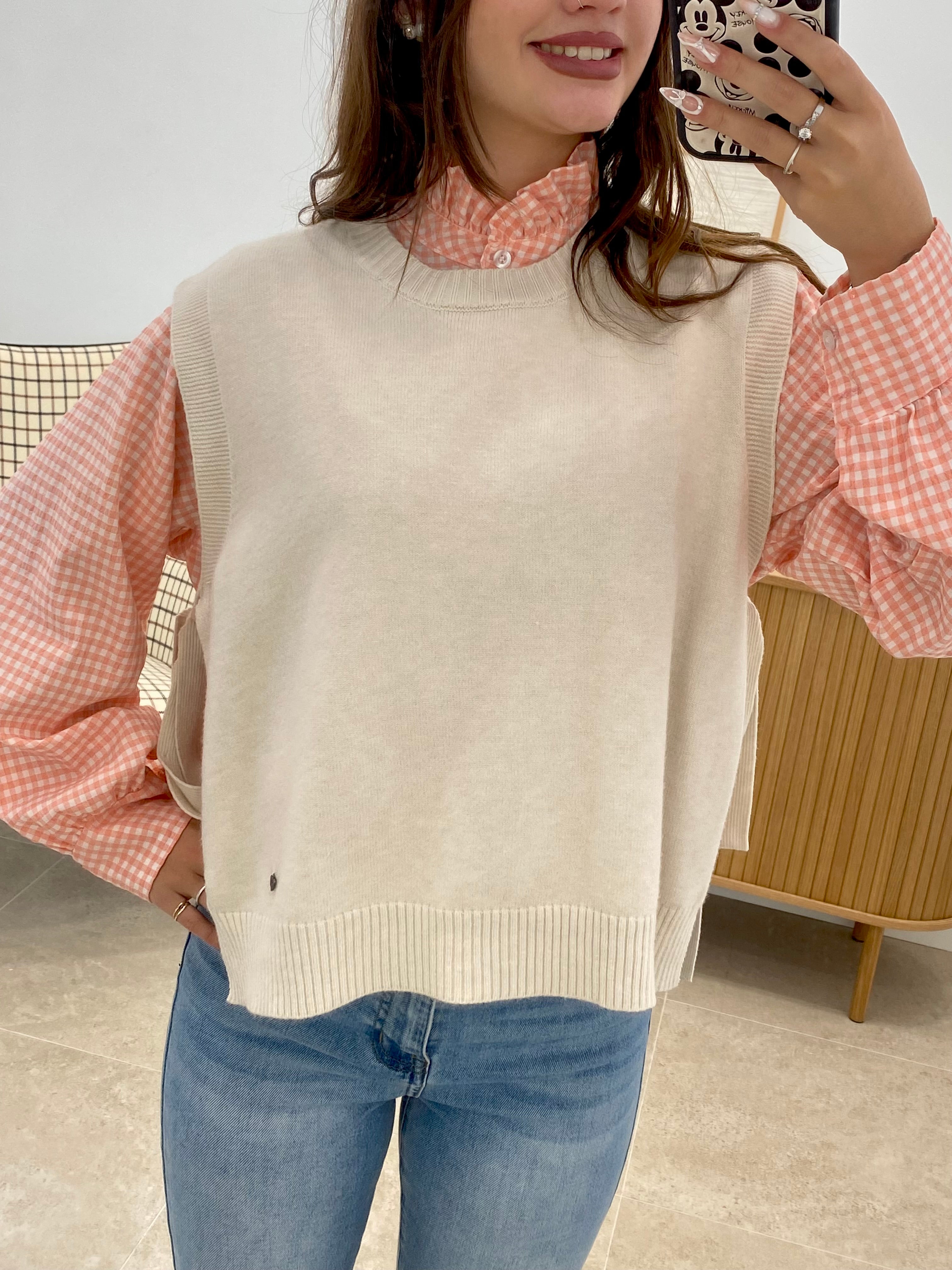 Chaleco versátil confeccionado en una mezcla de fibras premium: 50% viscosa que proporciona suavidad y transpirabilidad, complementada con 28% poliéster para durabilidad y 22% nylon que añade resistencia. Diseño minimalista en color liso con cierre ajustable mediante anudado lateral, permitiendo personalizar el ajuste según tus preferencias. Talla única adaptable. Pieza esencial para crear looks sofisticados con máxima comodidad.