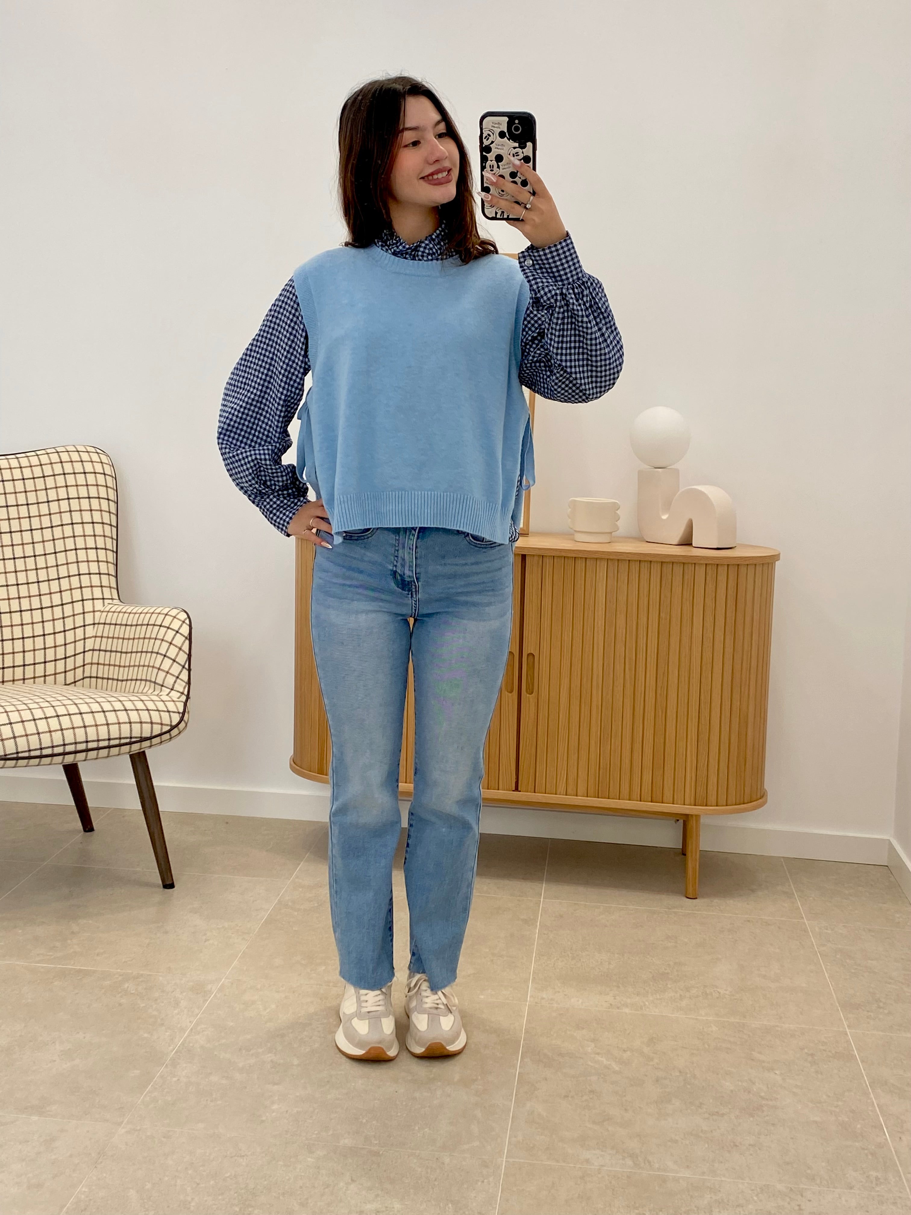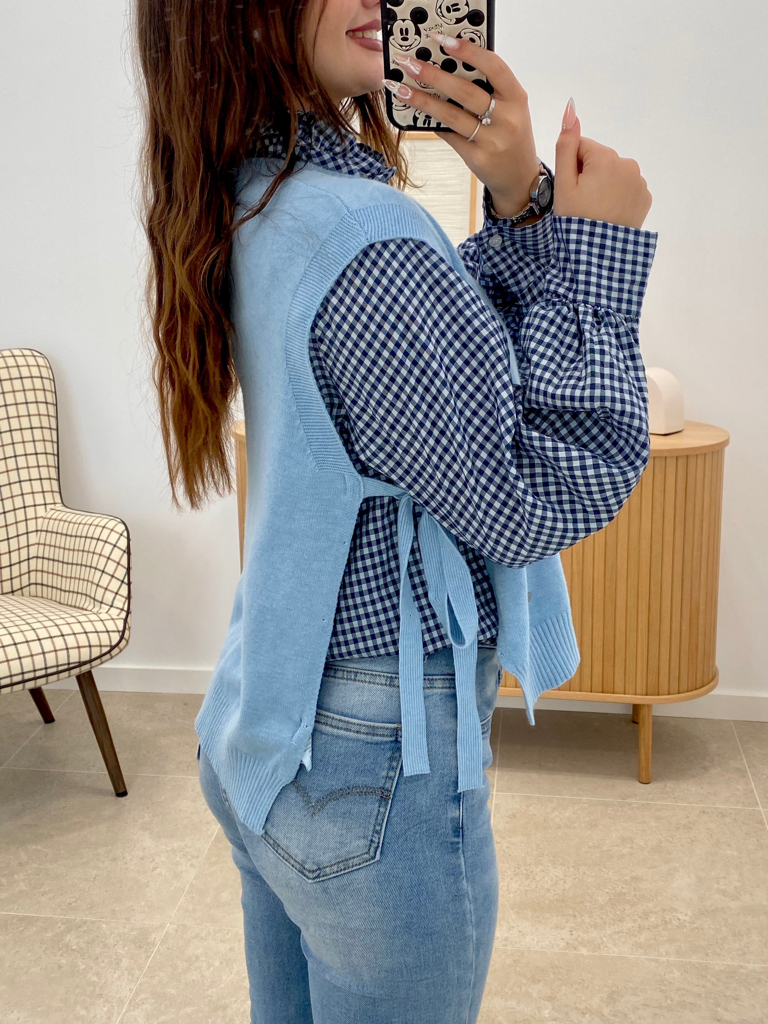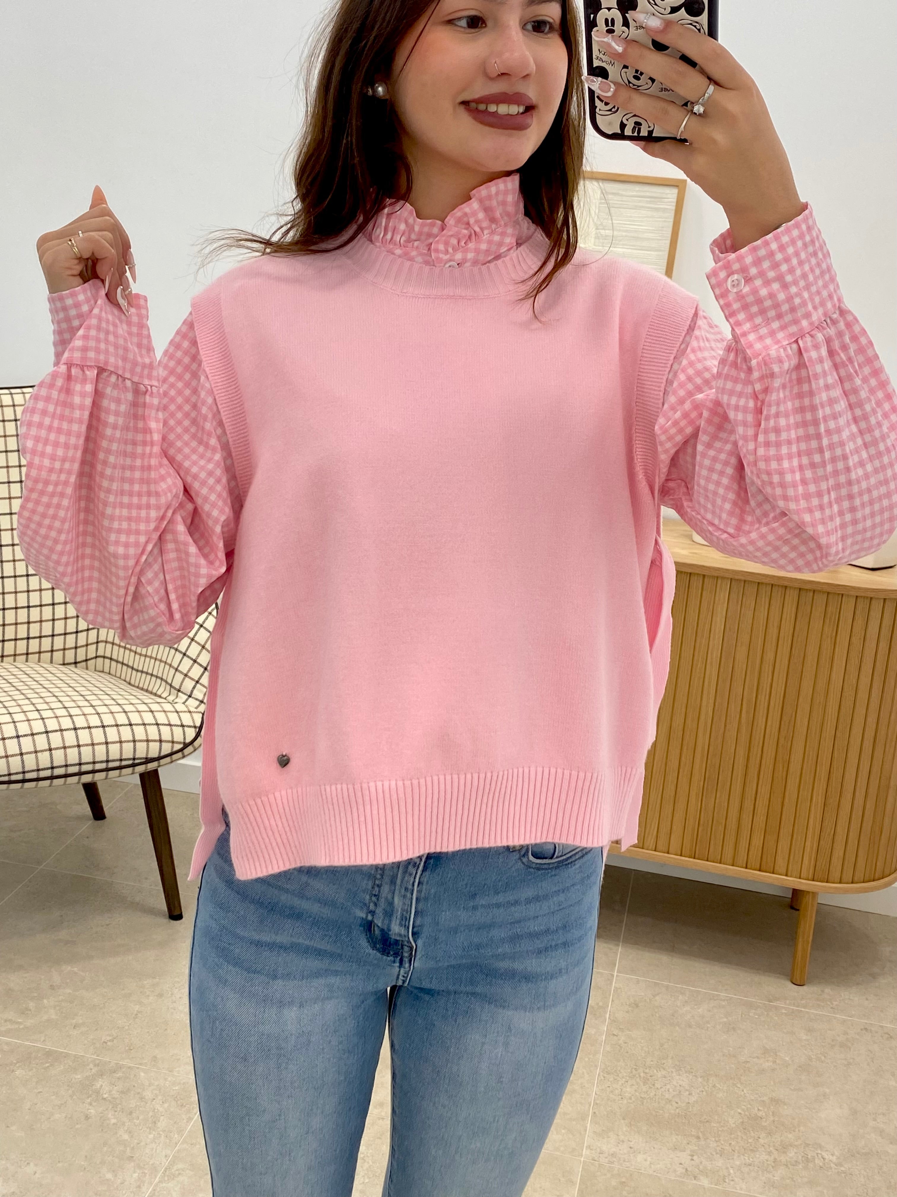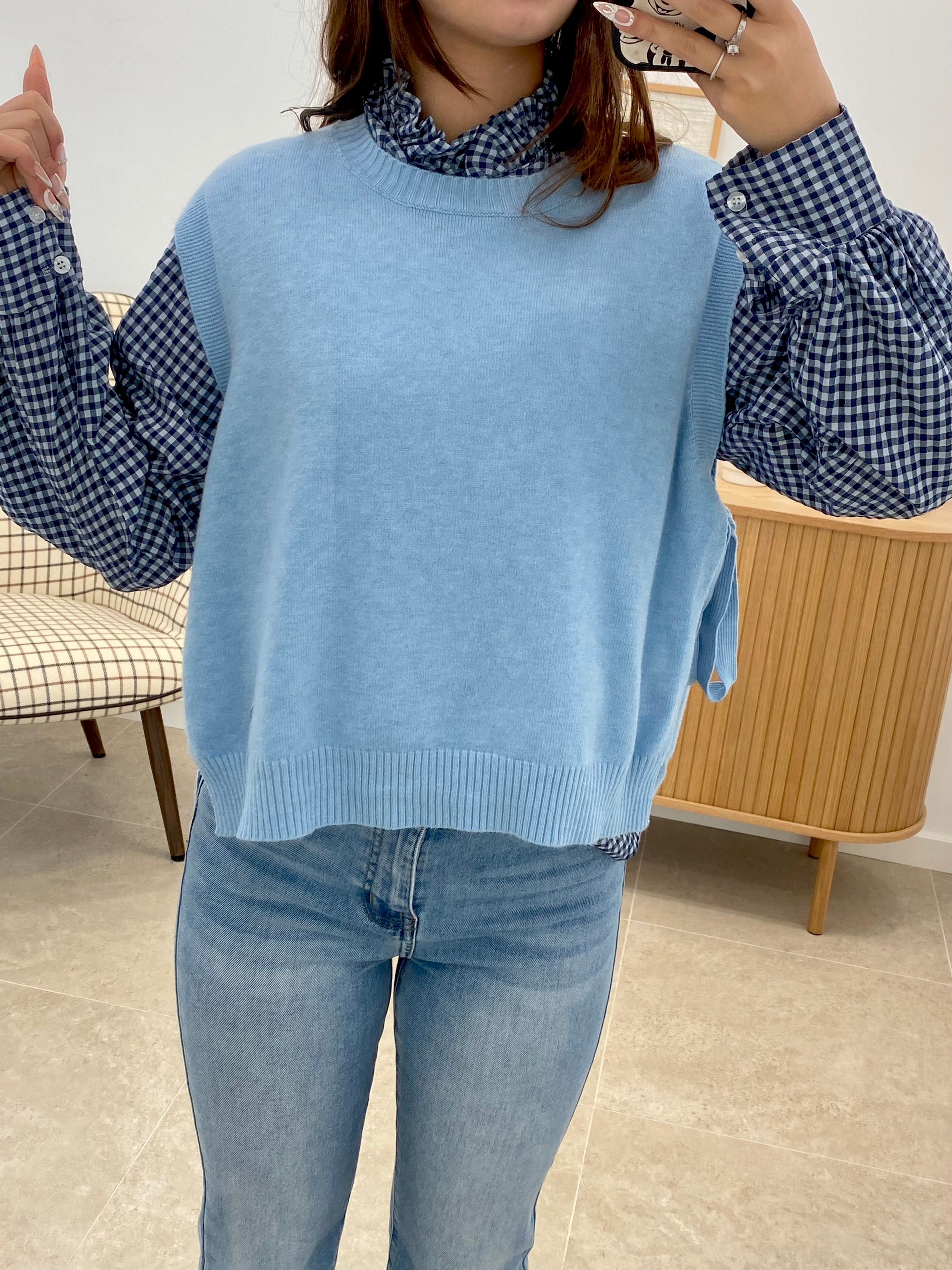 Chaleco versátil confeccionado en una mezcla de fibras premium: 50% viscosa que proporciona suavidad y transpirabilidad, complementada con 28% poliéster para durabilidad y 22% nylon que añade resistencia. Diseño minimalista en color liso con cierre ajustable mediante anudado lateral, permitiendo personalizar el ajuste según tus preferencias. Talla única adaptable. Pieza esencial para crear looks sofisticados con máxima comodidad.