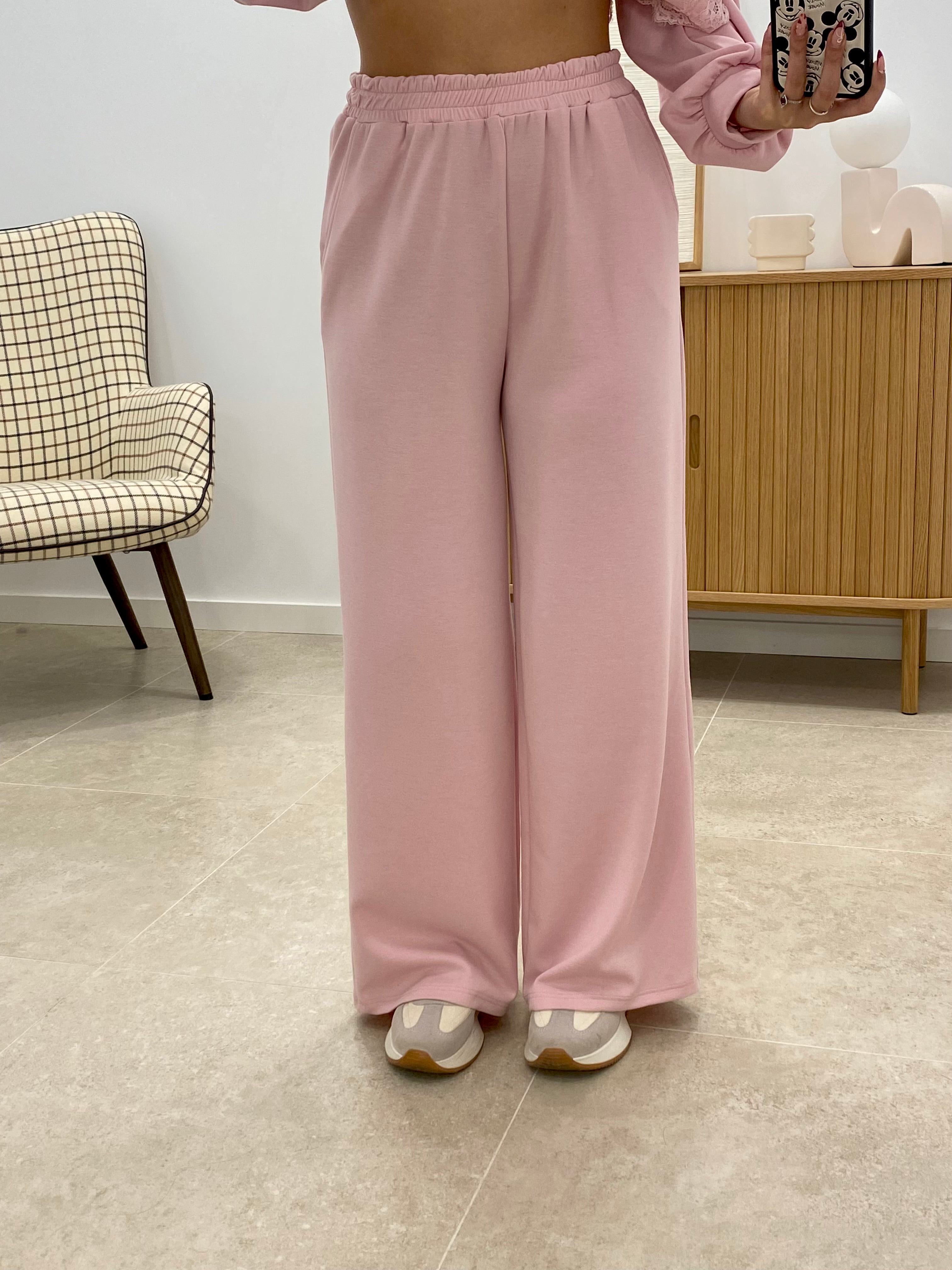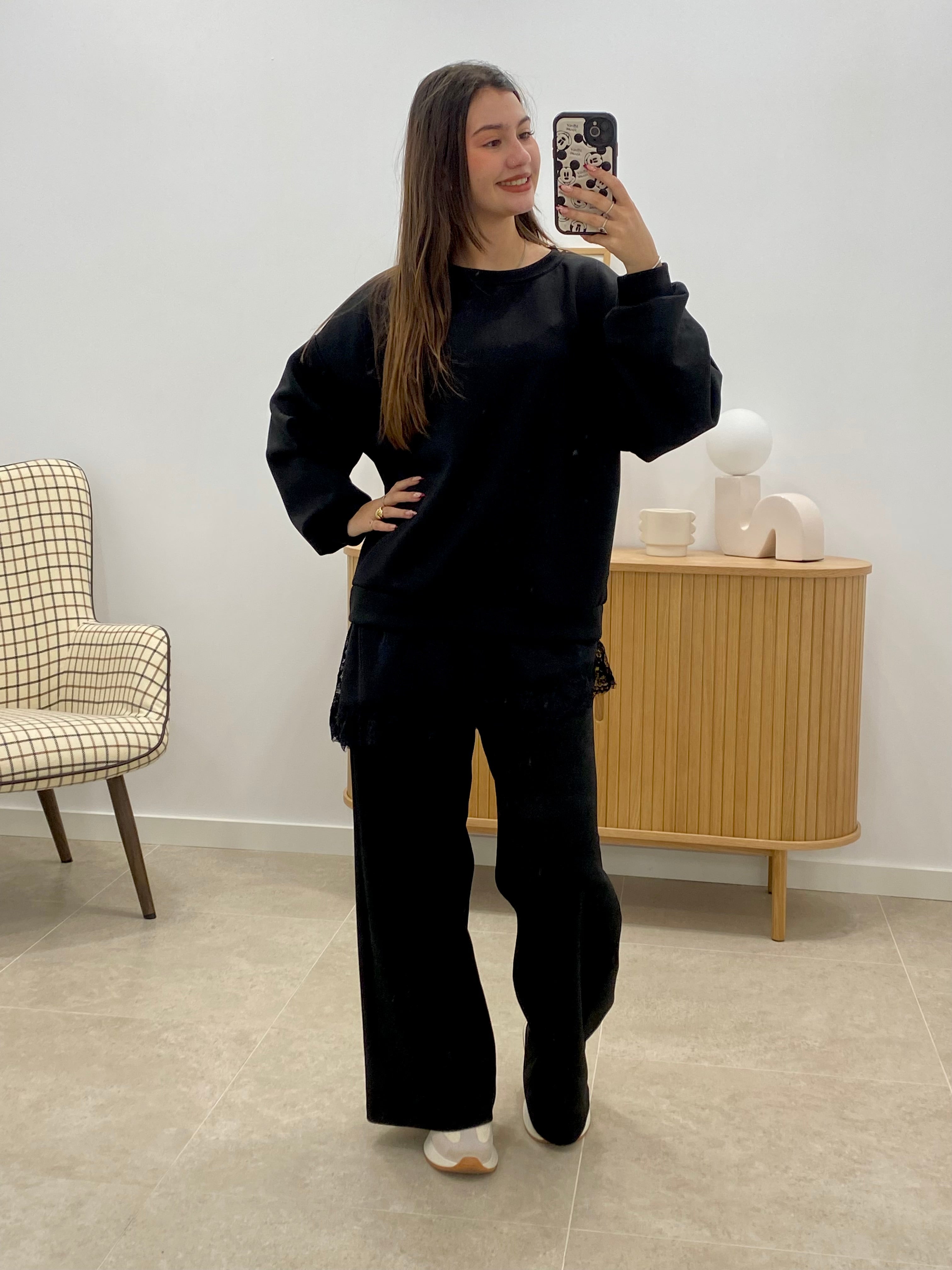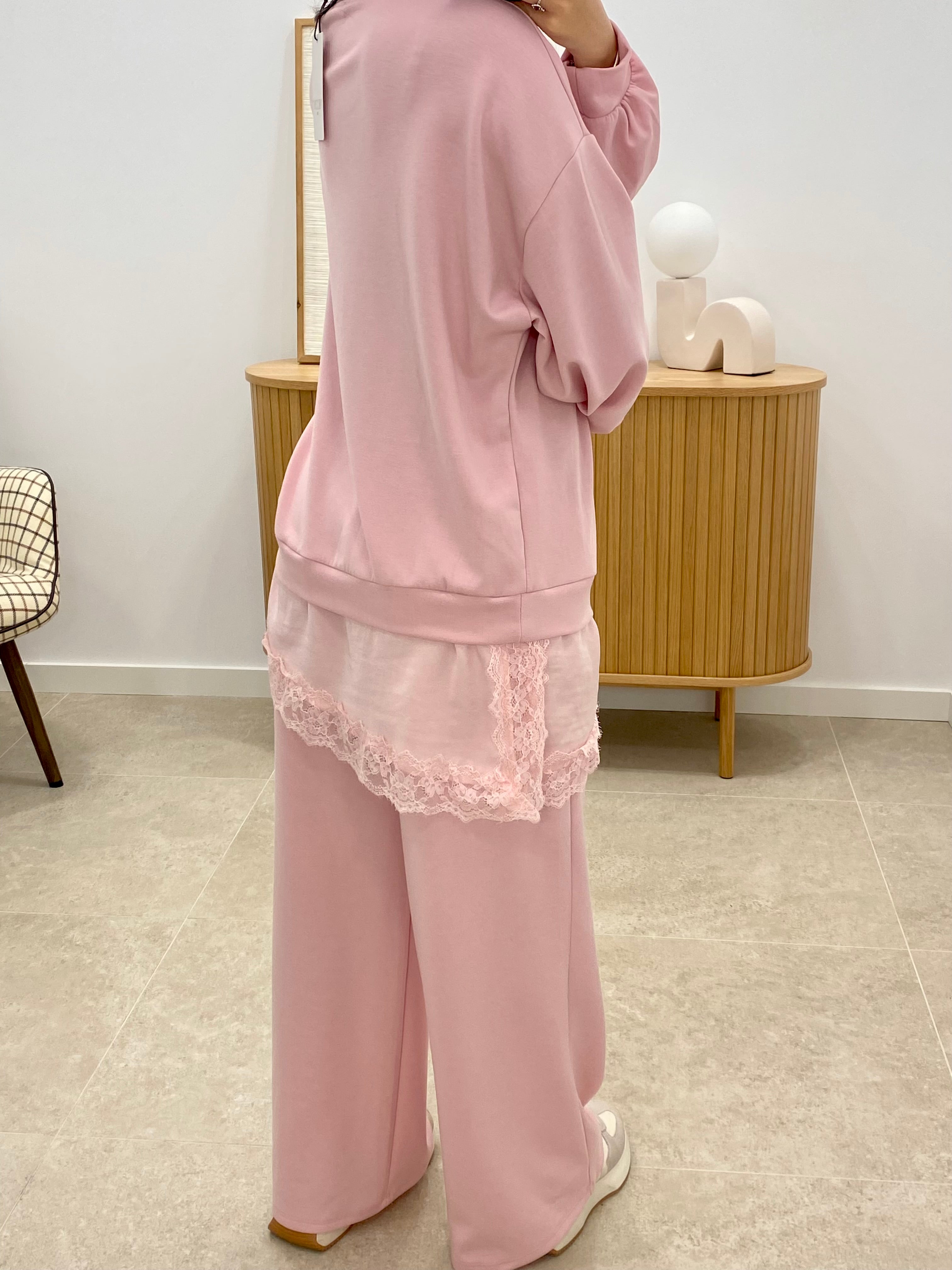 Sudadera de talla única confeccionada con una composición textil equilibrada: 50% viscosa, 25% algodón, 20% poliéster y 5% elastano. Presenta un color liso uniforme y se distingue por sus elegantes detalles de puntillas en la parte inferior, aportando un toque sofisticado y femenino. También compuesto por pantalón con cintura engomada en la cintura. La mezcla de fibras garantiza comodidad, transpirabilidad y una excelente elasticidad para un ajuste versátil. Prenda versátil ideal para un look casual con carácter.