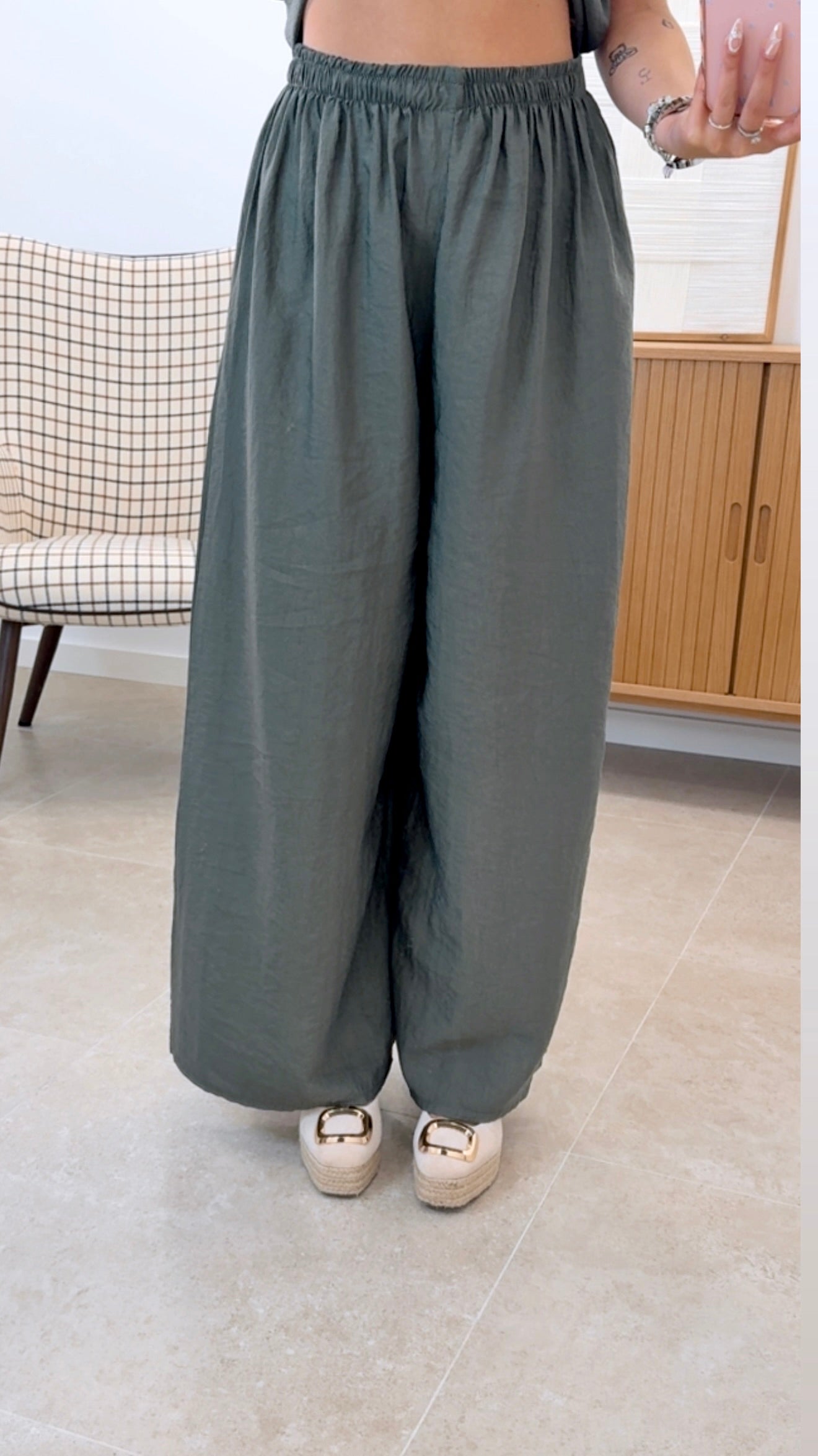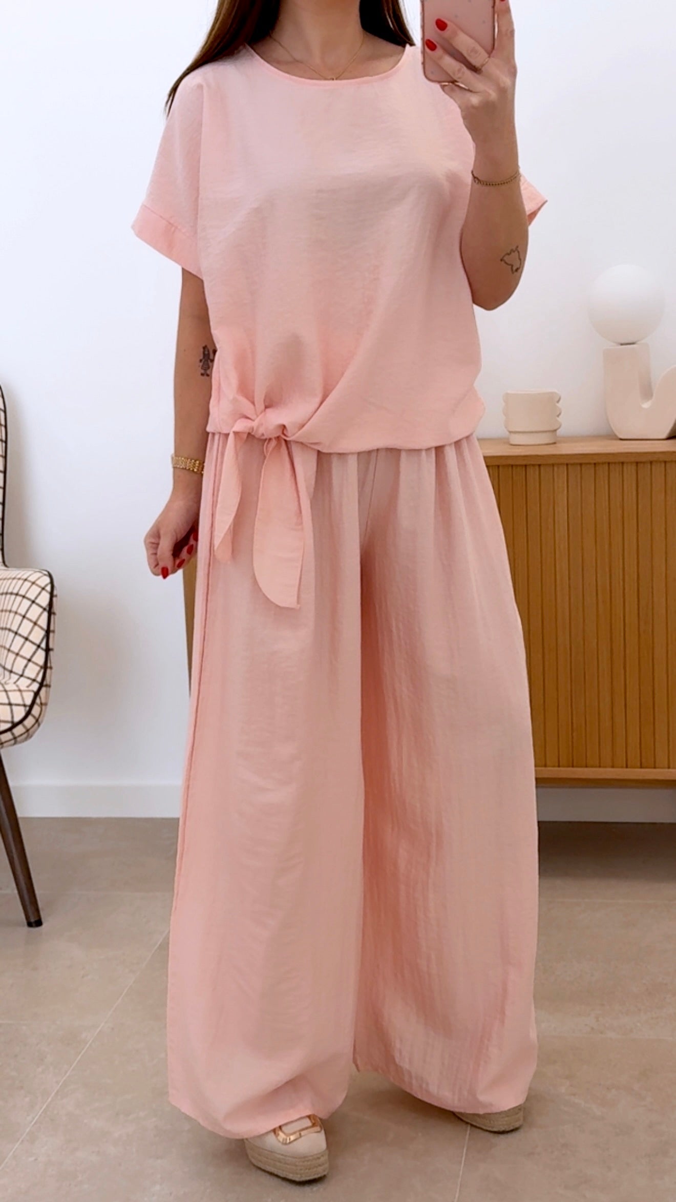 Conjunto versátil en talla única compuesto por pantalón con cintura engomada y camiseta de manga corta. Confeccionado en una mezcla de 85% viscosa y 15% nylon que proporciona suavidad y durabilidad. El diseño liso permite combinarlo fácilmente con otros artículos de tu guardarropa. Ideal para un look casual y cómodo en cualquier ocasión.