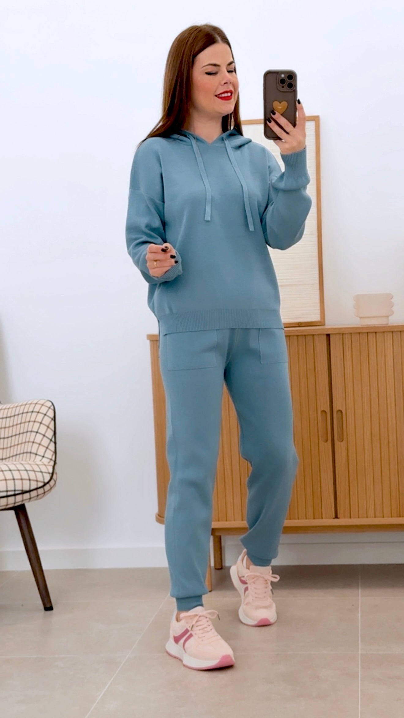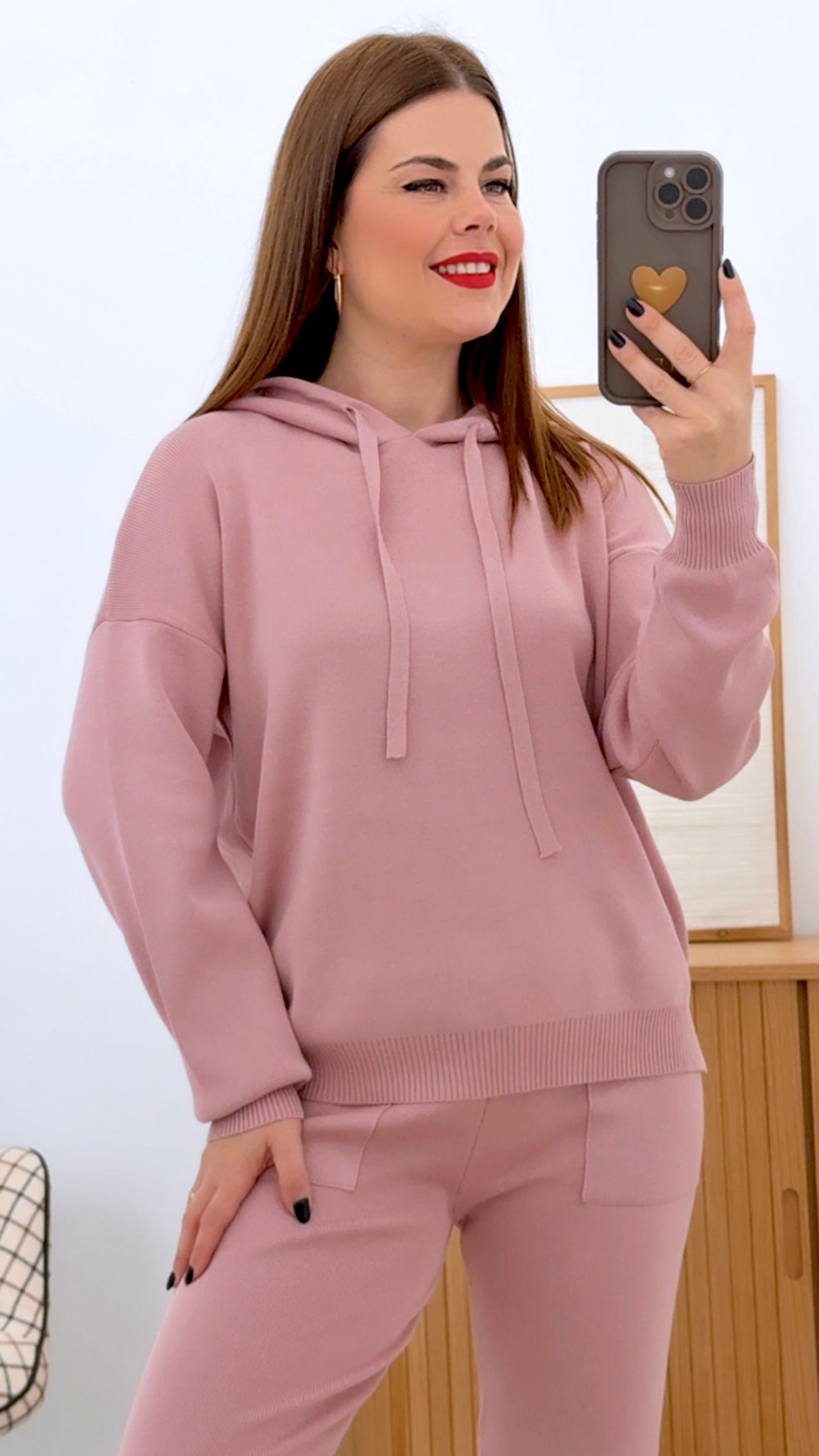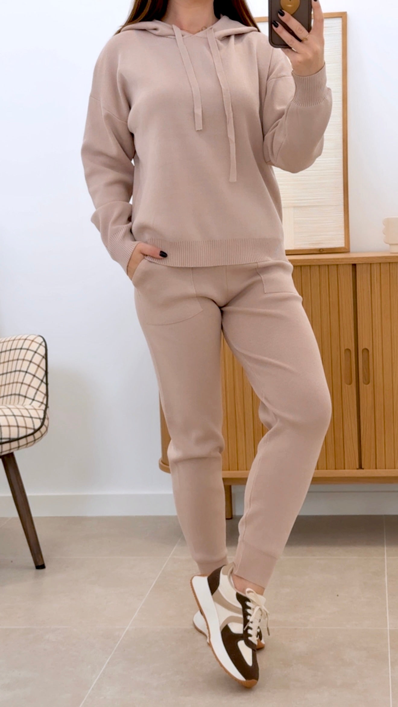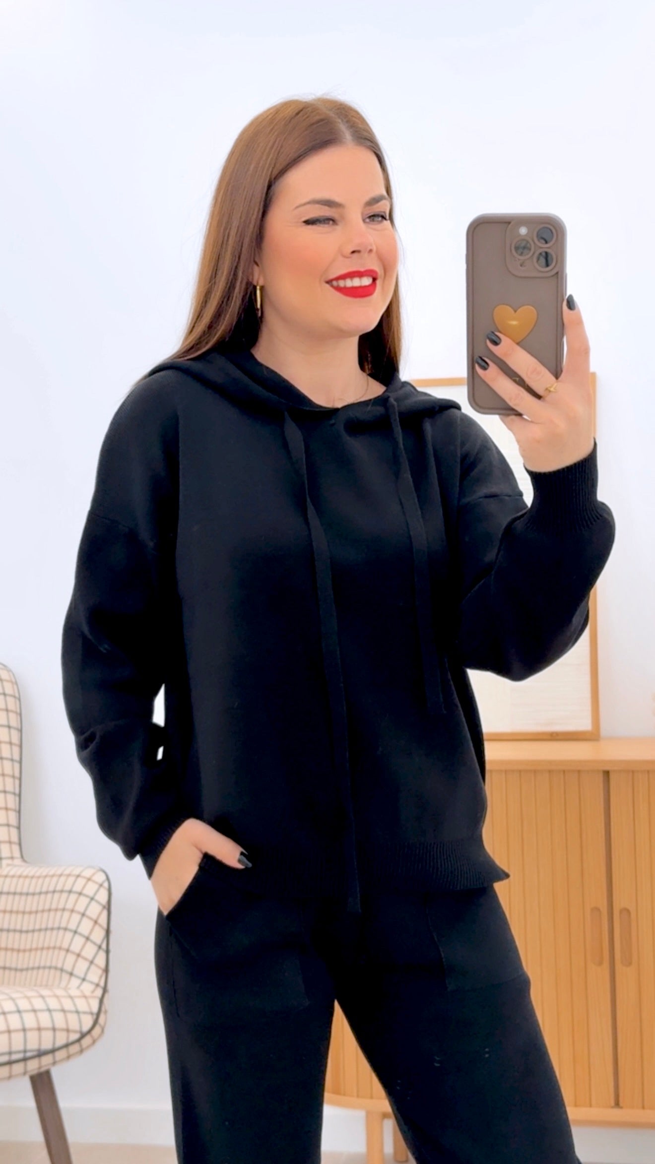 Conjunto versátil de punto compuesto por sudadera con capucha y pantalón de cintura engomada. Confeccionado en mezcla de fibras premium: 50% viscosa que proporciona suavidad y transpirabilidad, complementada con 25% nylon para mayor resistencia y 25% poliéster para durabilidad. Disponible en color liso. Prenda cómoda y funcional.