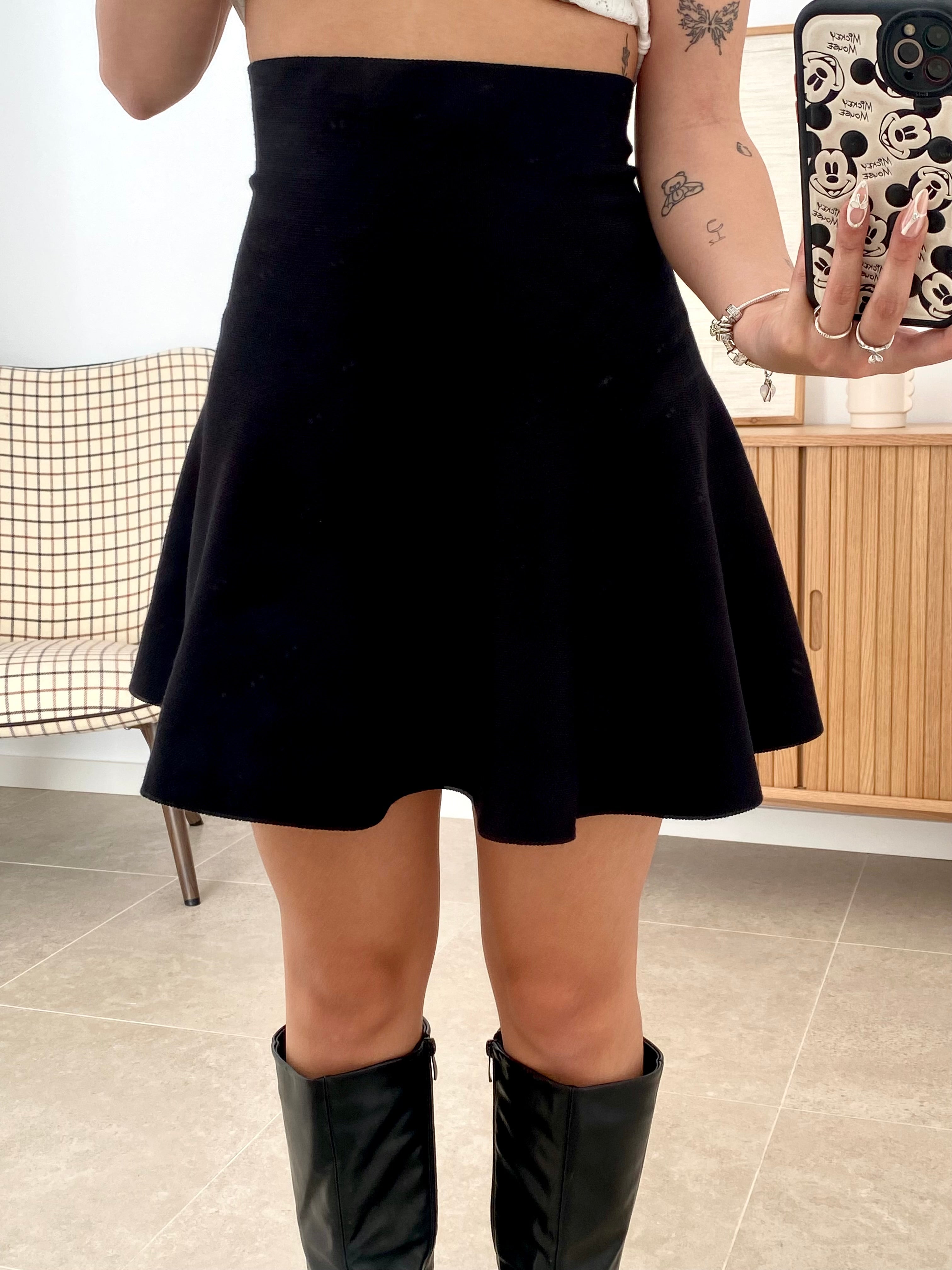 Falda de punto confeccionada en tejido elástico que combina comodidad y elegancia. Diseño ajustado a la cintura con vuelo en la parte inferior que favorece la silueta. Disponible en diferentes tallas, su composición de 70% viscosa, 20% poliamida y 10% elastán proporciona una excelente elasticidad y adaptabilidad al cuerpo. El tejido respira naturalmente y mantiene su forma tras múltiples lavados, ideal para un uso versátil tanto en looks casuales como más elaborados.