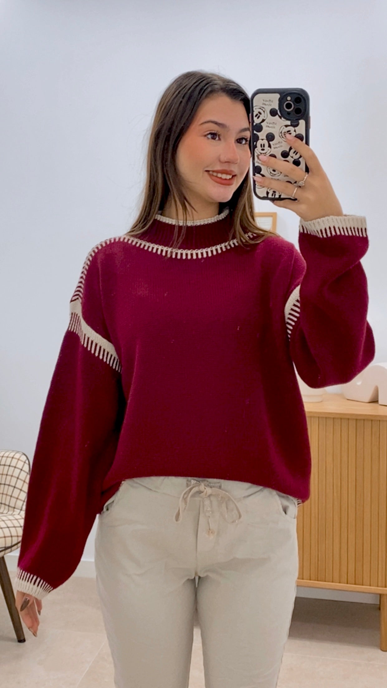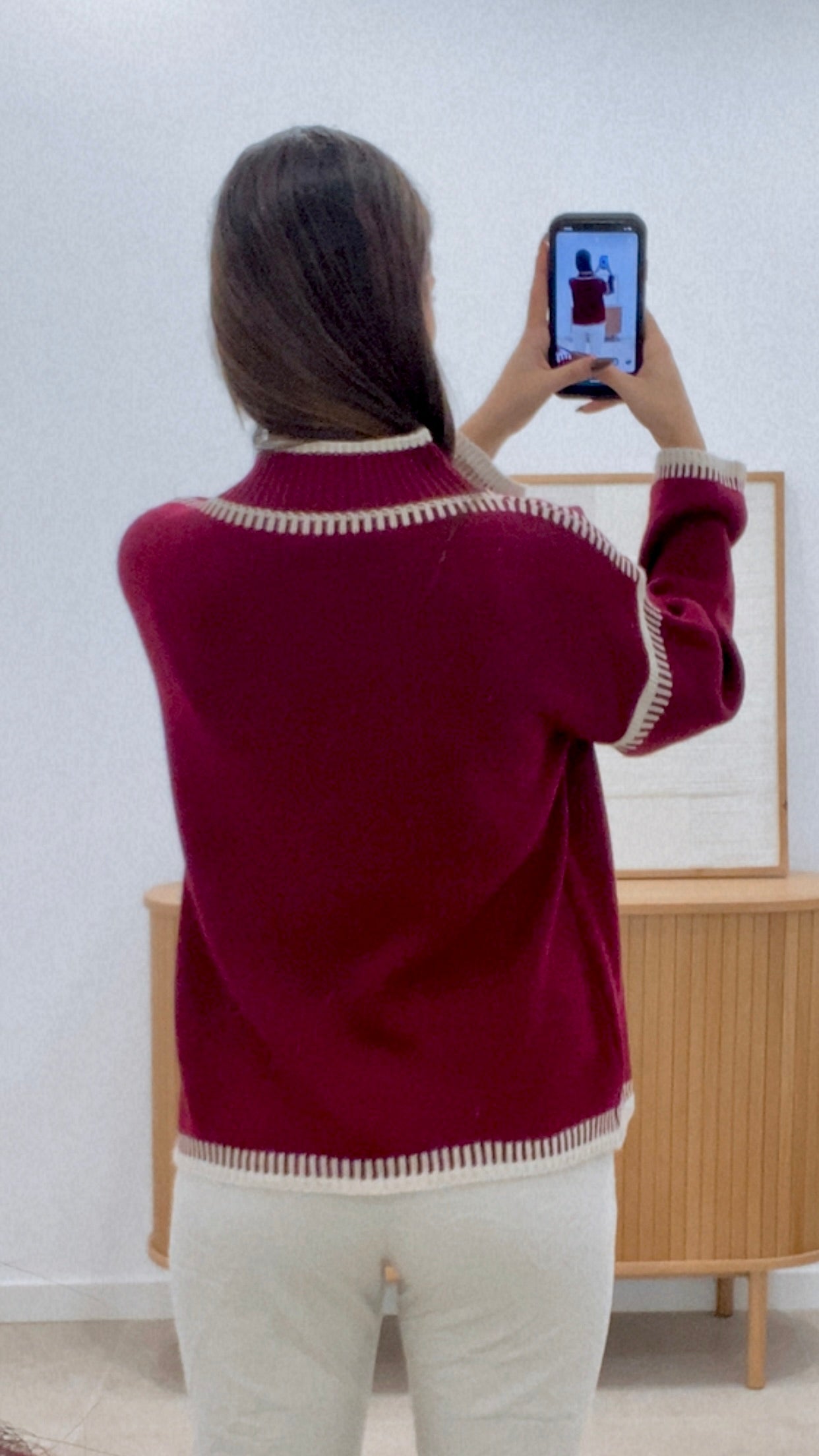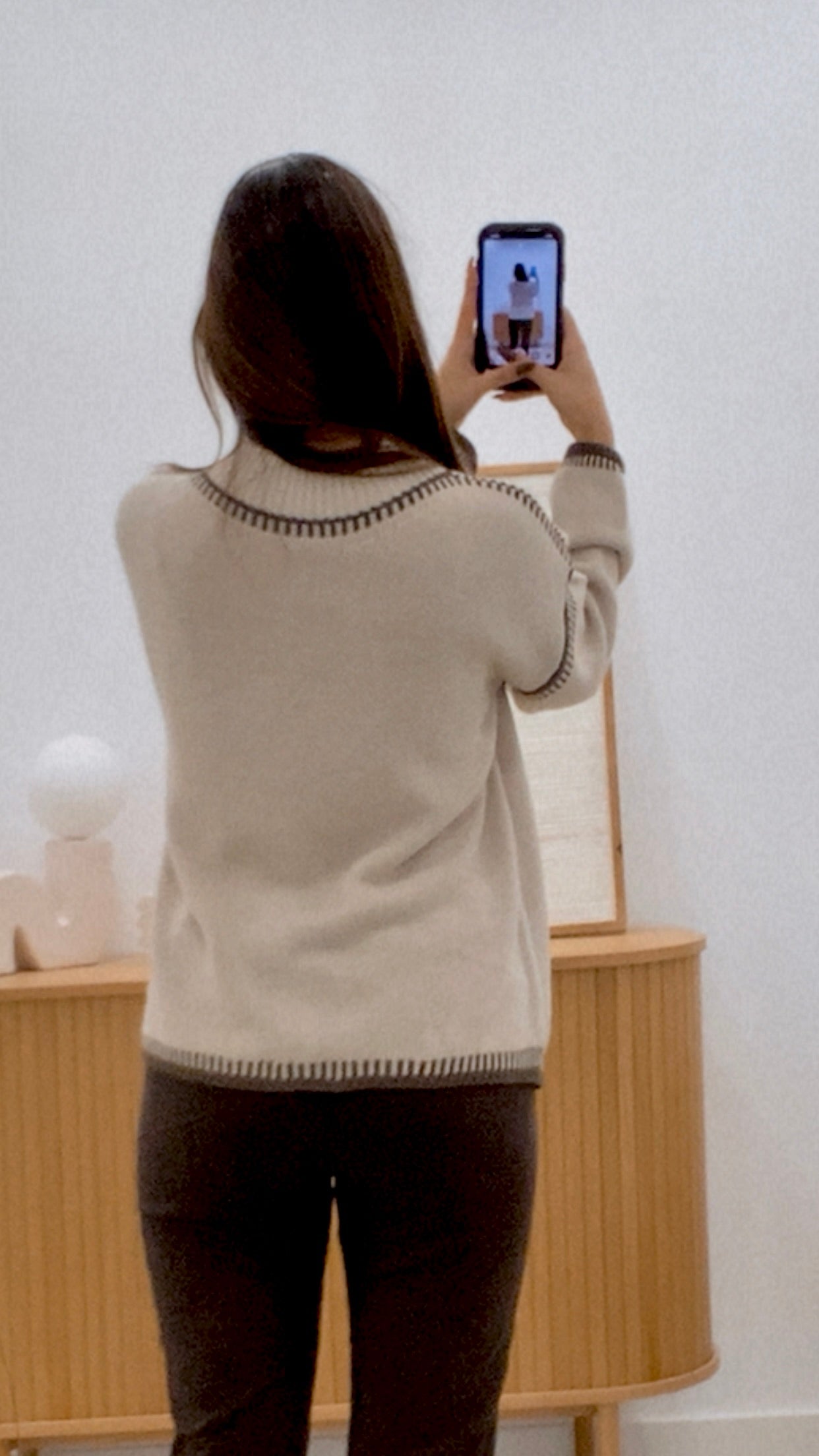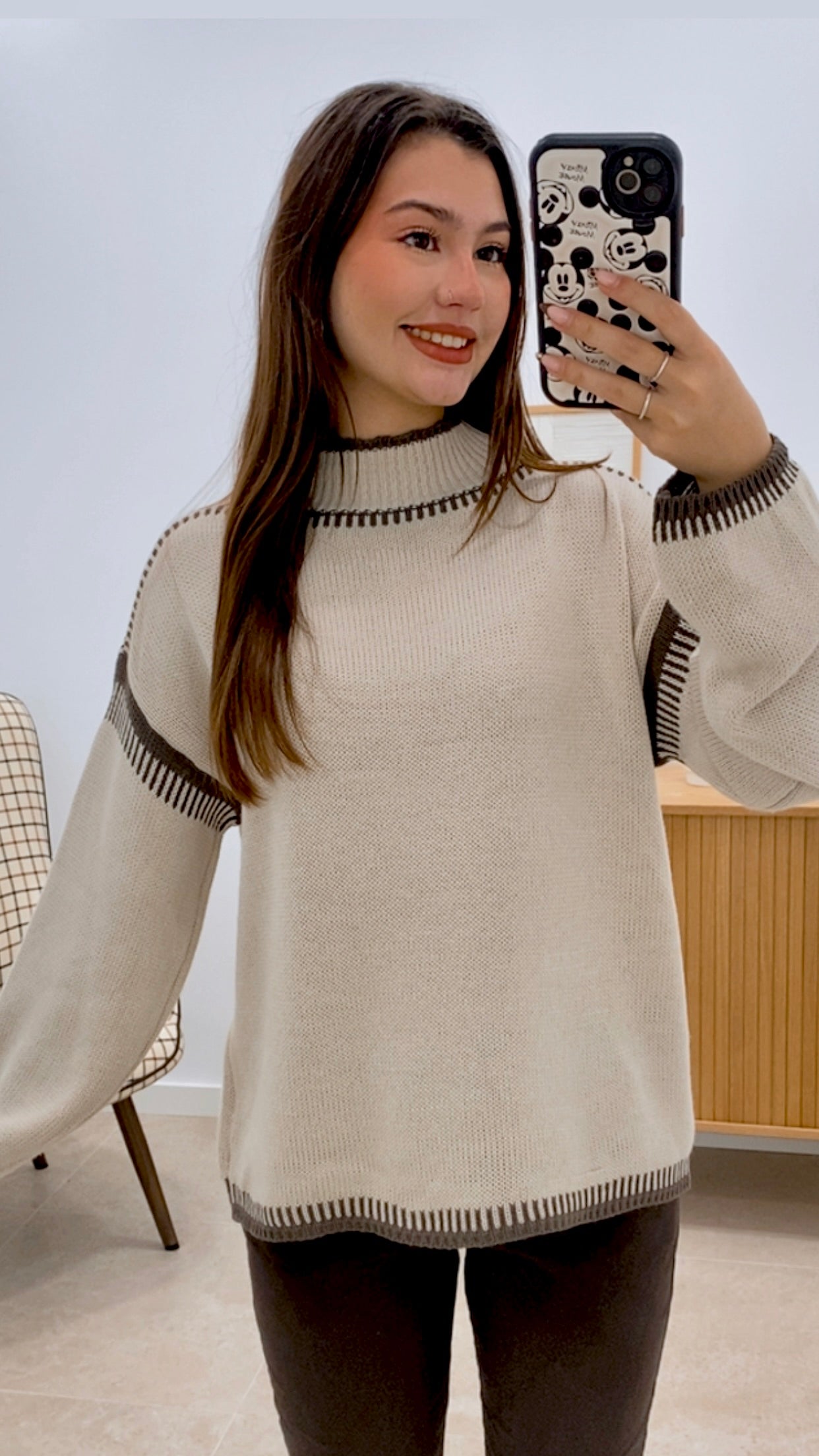 Suéter de punto en acrílico de alta calidad con un diseño bicolor que combina dos tonalidades en contraste. Confeccionado con costuras visibles que aportan un toque contemporáneo y sofisticado al diseño. La composición 100% acrílica garantiza durabilidad, facilidad de cuidado y comodidad térmica. Disponible en talla única, adaptándose a diferentes siluetas. Prenda versátil ideal para crear looks casuales o semi-formales con facilidad.