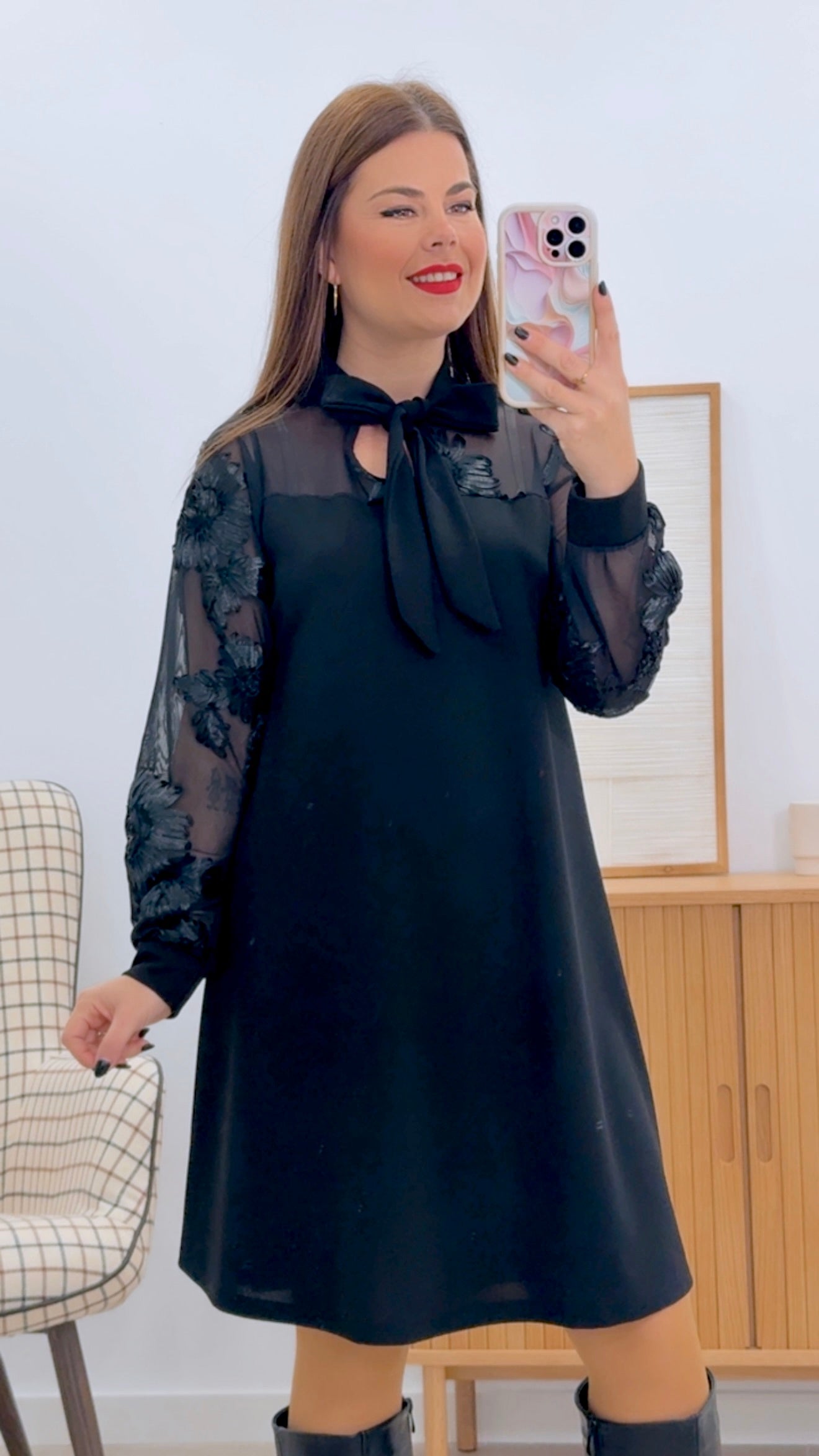 VESTIDO FLOTRA en talla única que combina elegancia y comodidad. Confeccionado con un 95% poliéster y 5% elastan, ofrece una excelente elasticidad y durabilidad. Destaca por sus mangas y parte superior transparentes, creando un efecto visual sofisticado que permite jugar con capas. La composición de la tela garantiza un mantenimiento sencillo y una prenda versátil para diferentes ocasiones.