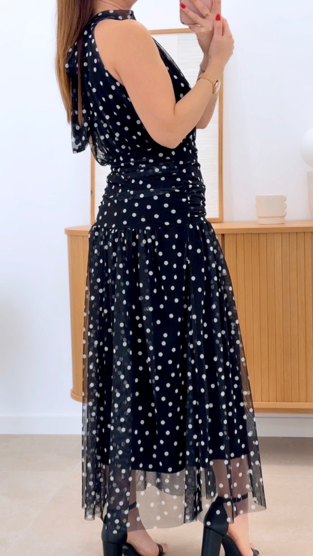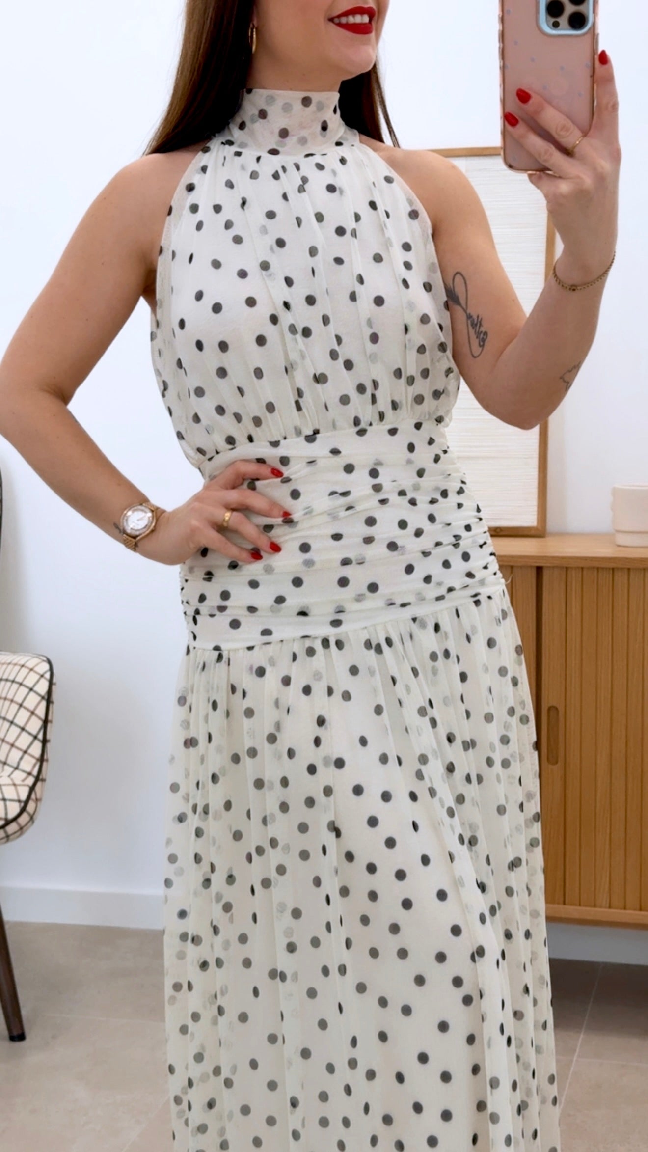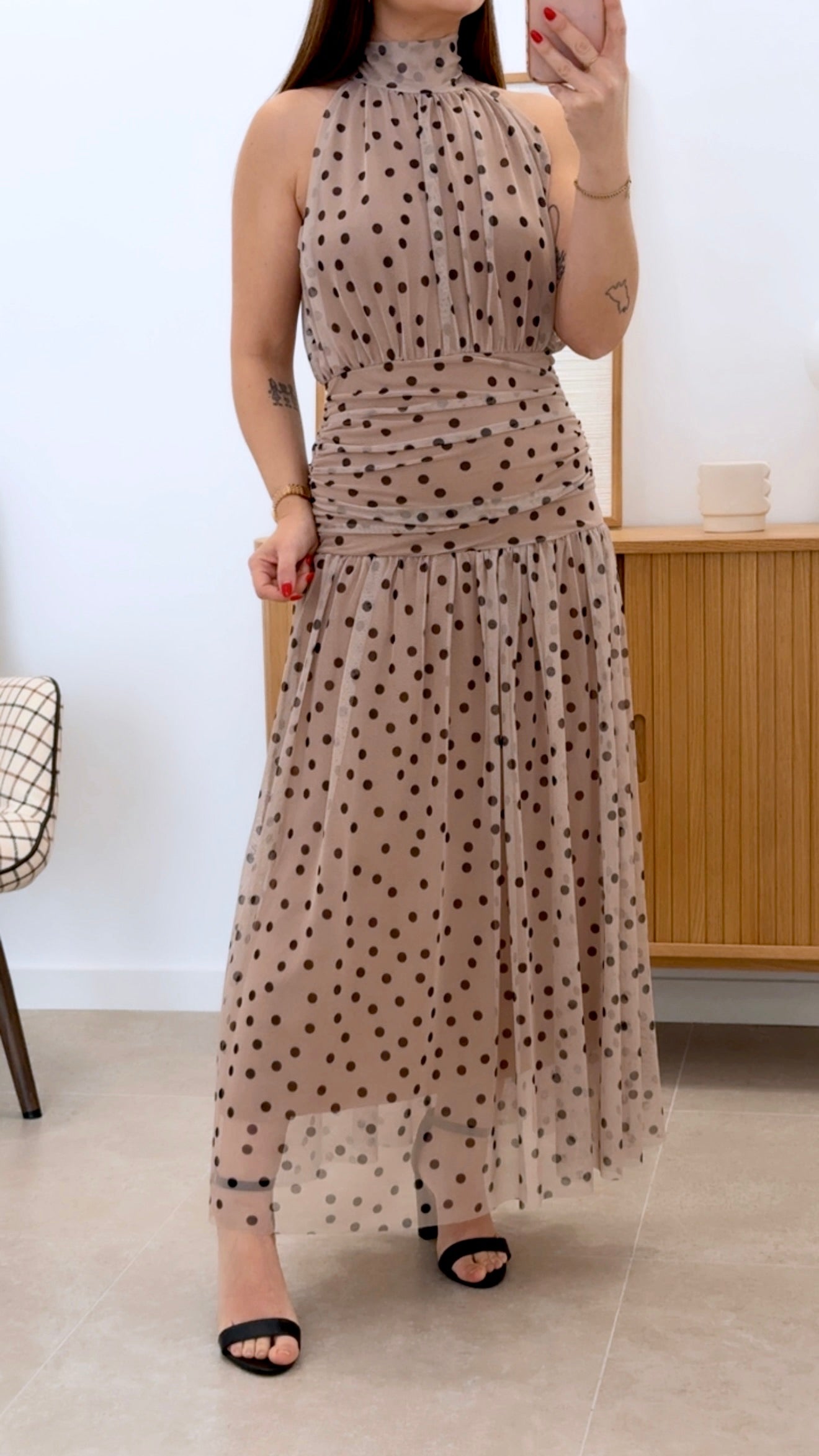 Vestido largo sin mangas en talla única que combina colores con un diseño de lunares. Cuenta con cintura fruncida para un ajuste favorecedor y forro interno para mayor comodidad. Confeccionado en 100% poliéster y 100% viscosa, ofrece durabilidad y una caída elegante. Pieza versátil perfecta para ocasiones especiales o uso diario.