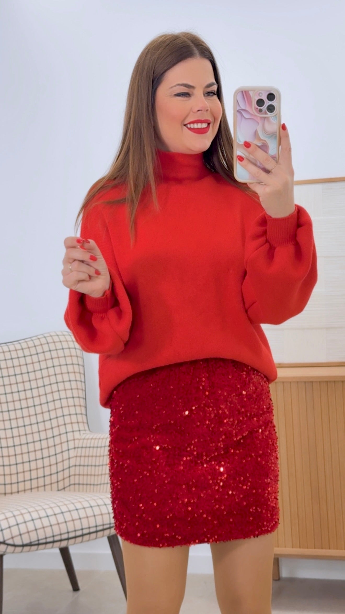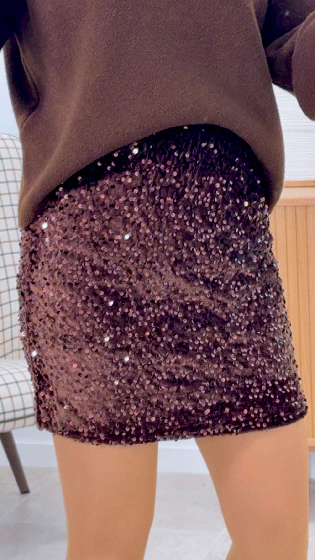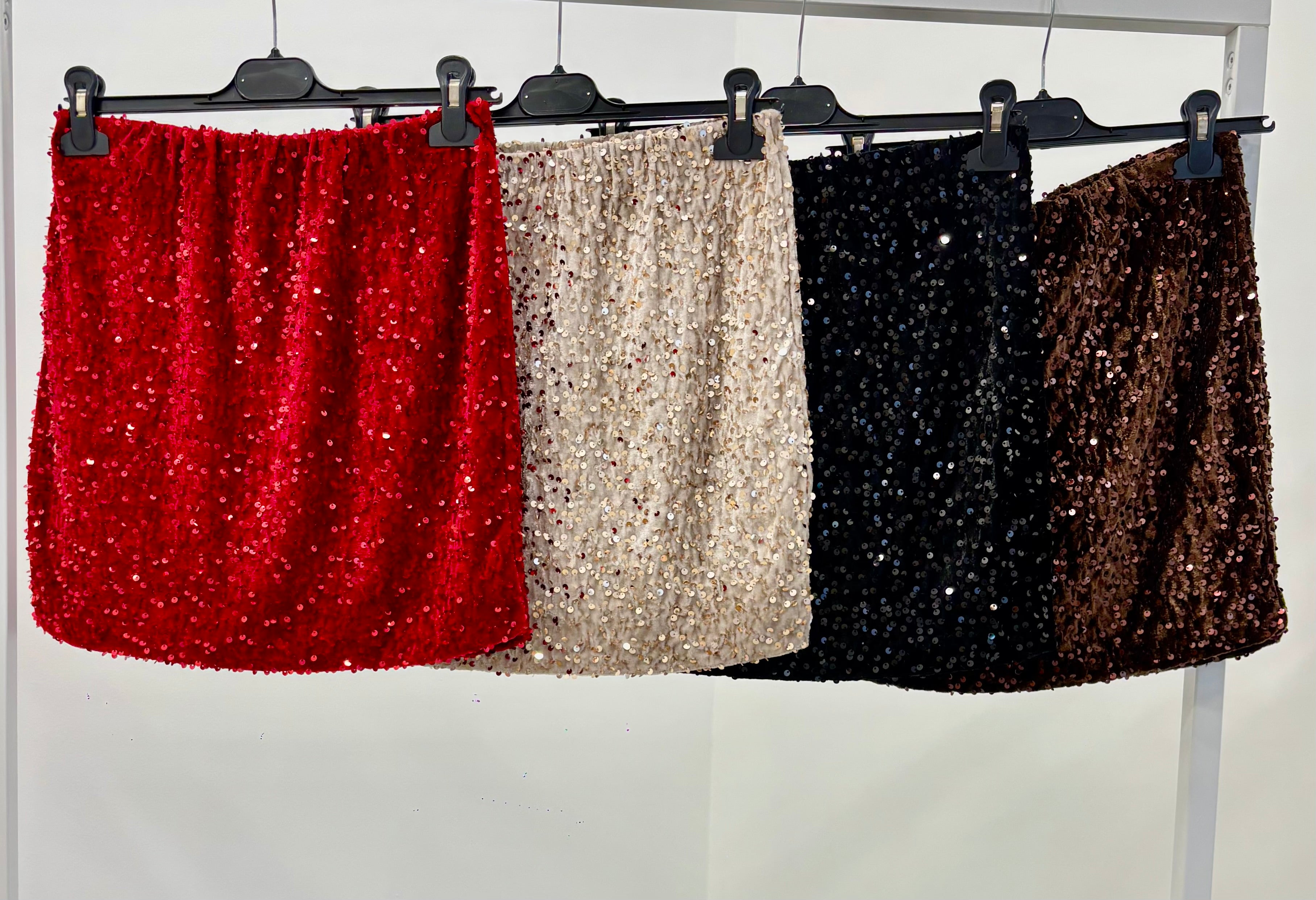 Falda corta confeccionada en 100% poliéster de alta calidad con acabado de lentejuelas que captura la luz con cada movimiento. Diseño versátil en color liso con cintura engomada que proporciona comodidad y un ajuste seguro durante todo el día. Disponible en talla única, es la pieza perfecta para crear looks festivos o de noche con un toque de brillo y sofisticación.