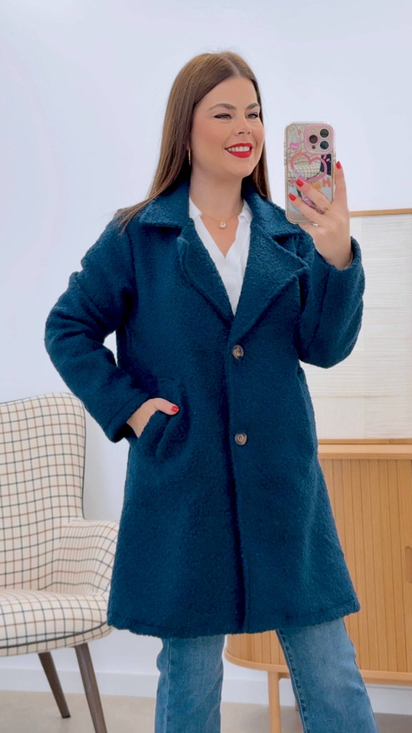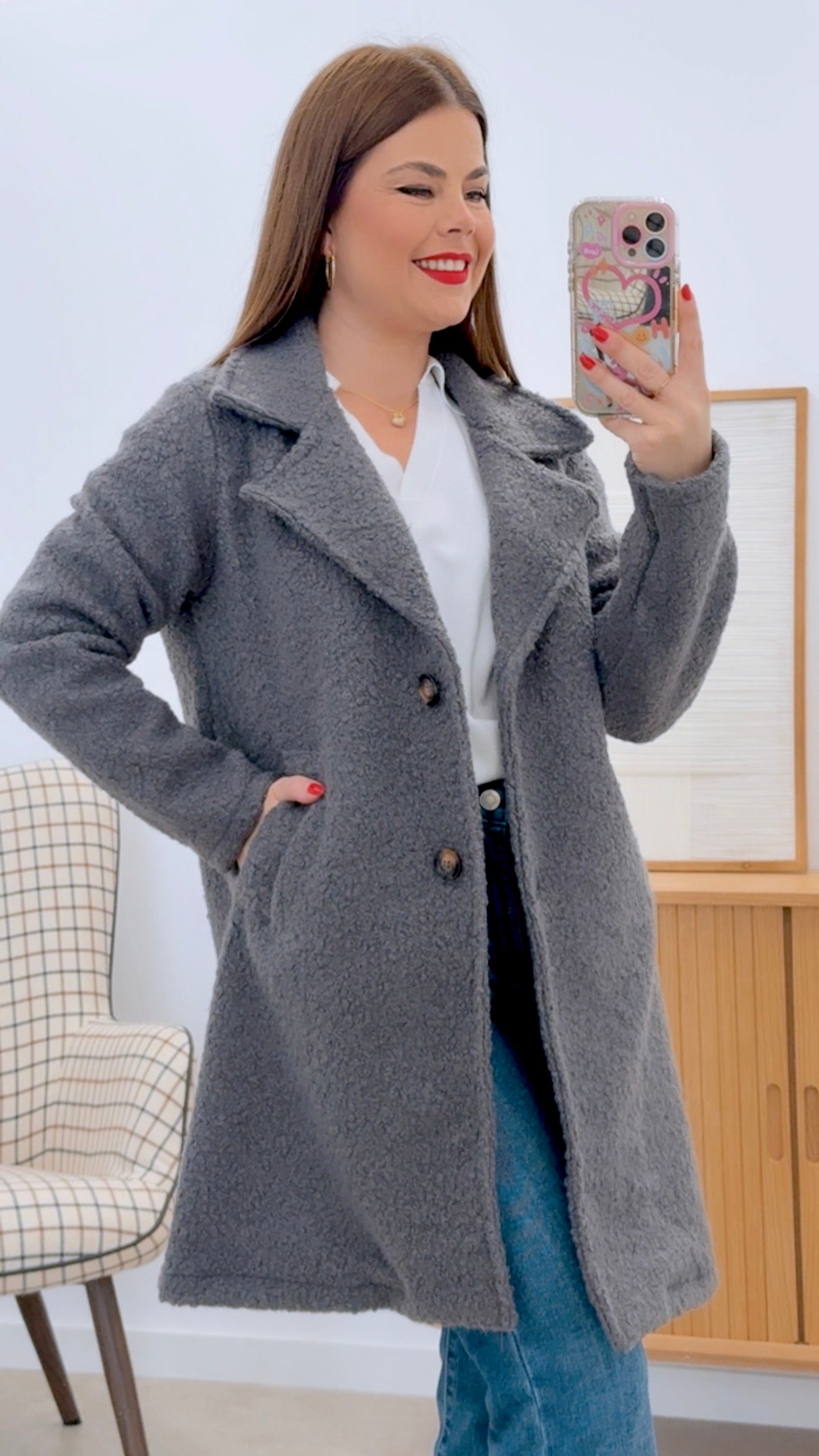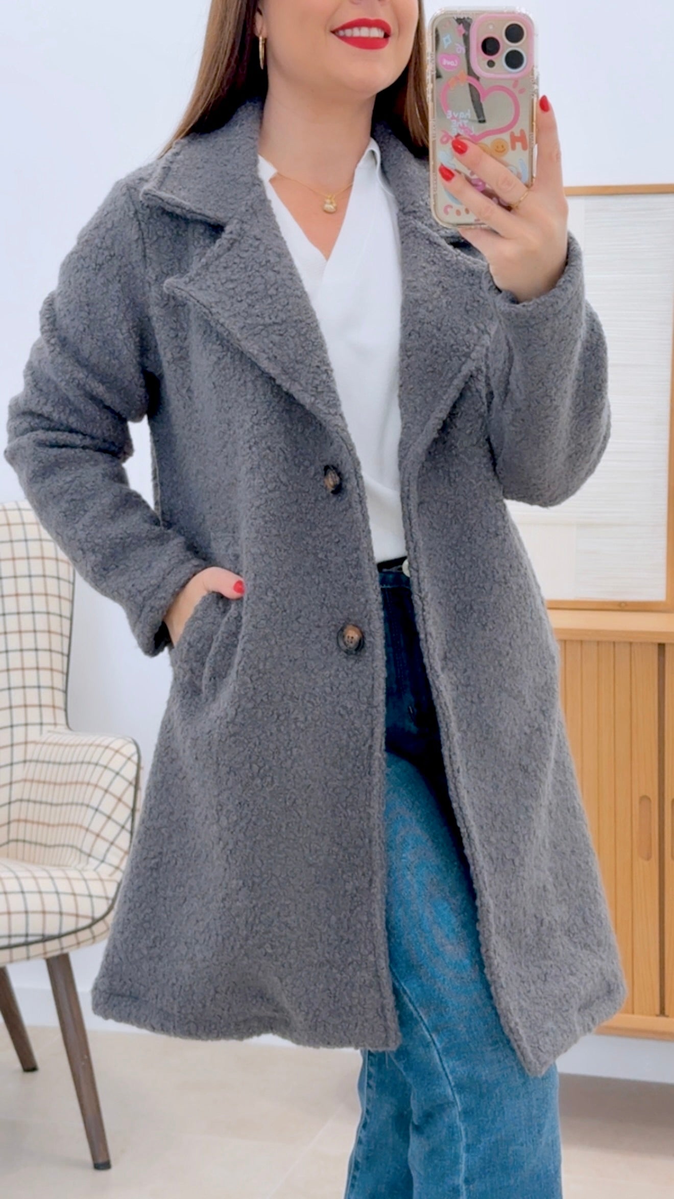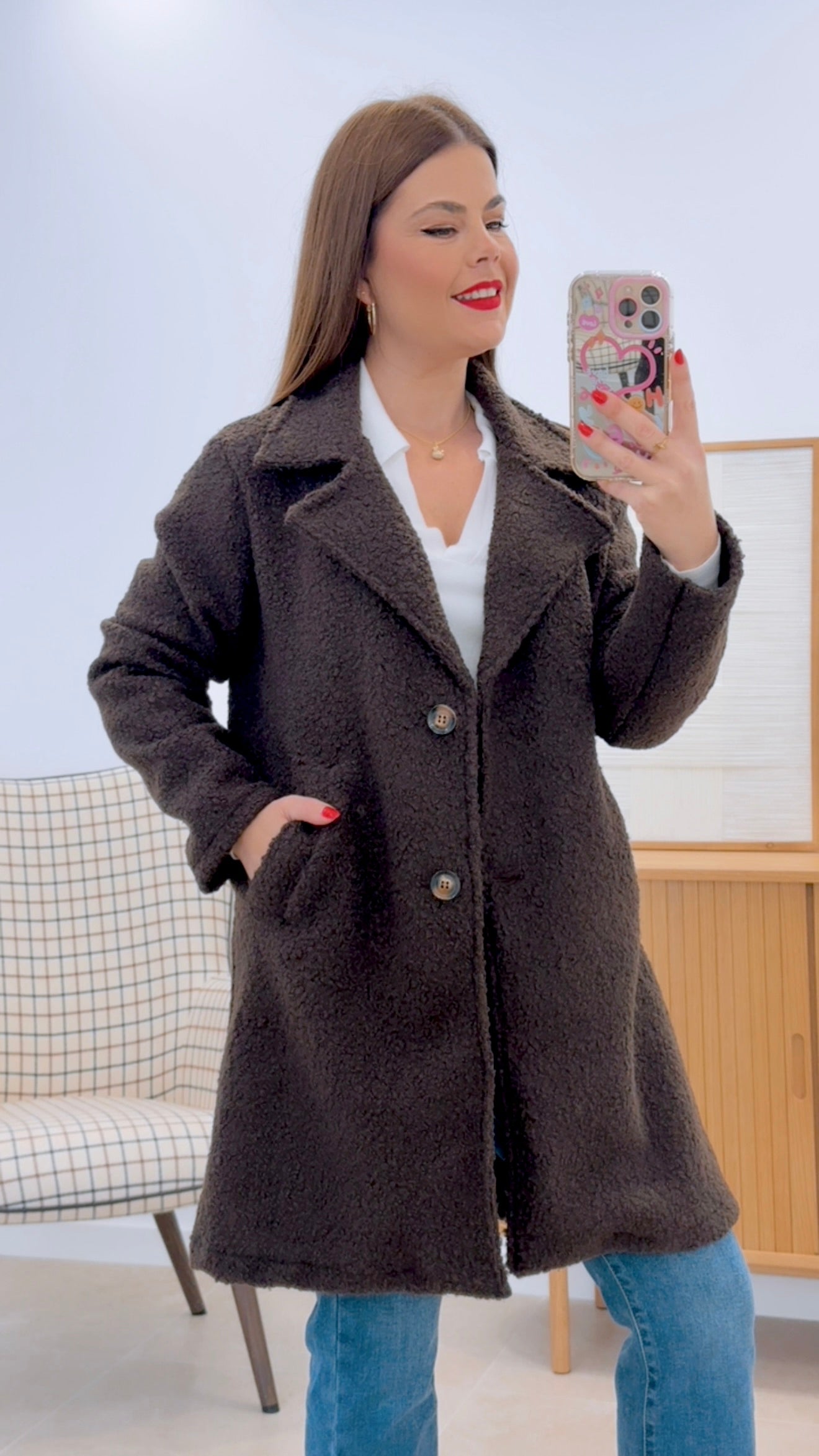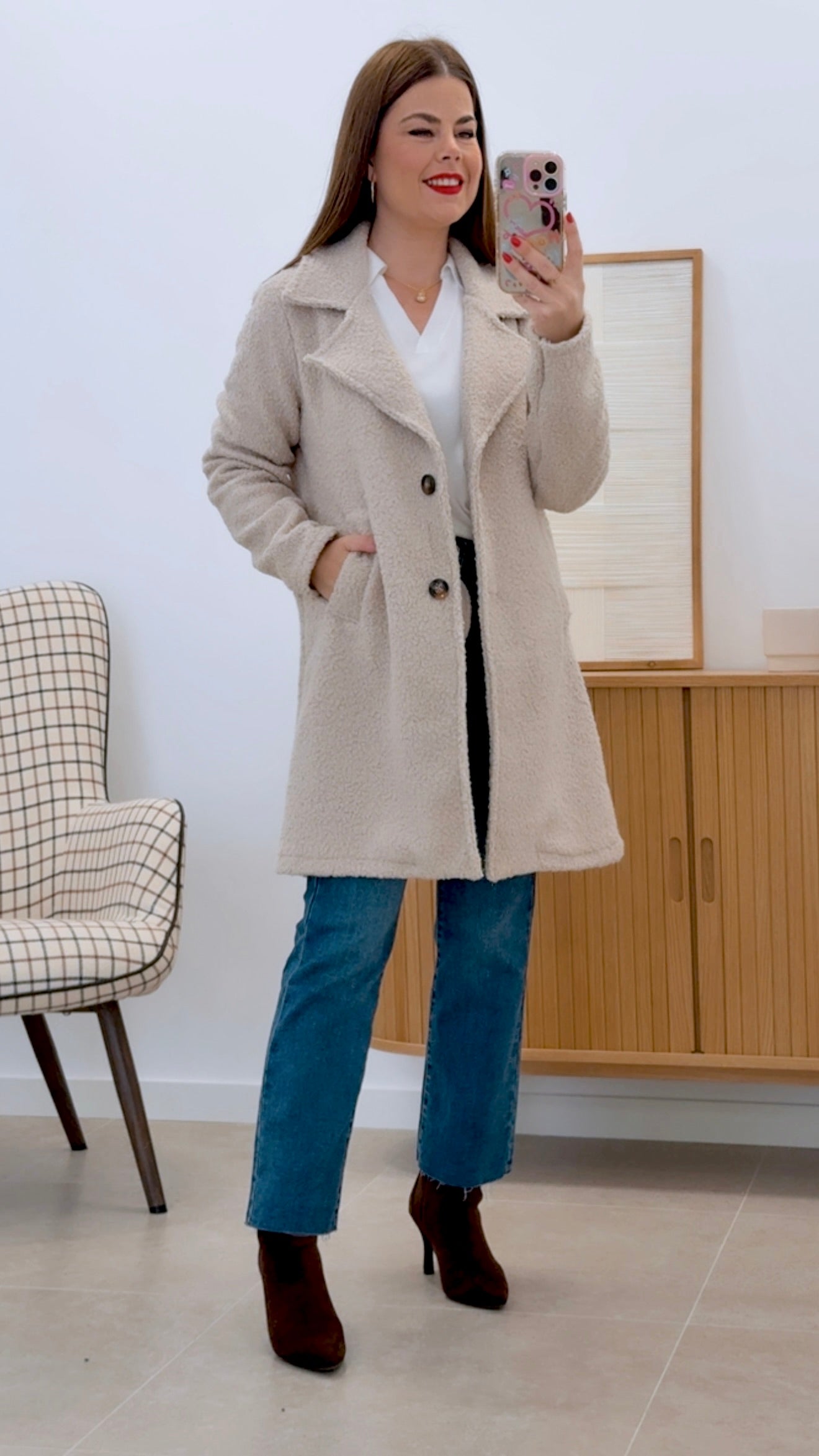 ABRIGO MIERE Abrigo de manga 3/4 confeccionado en tejido efecto borrego que repele el agua, proporcionando protección contra la humedad sin comprometer la comodidad. Diseño sin forro interior que garantiza mayor elasticidad y libertad de movimiento. Cuenta con bolsillos funcionales, cuello solapado distintivo y cierre de botones. Su color liso uniforme se complementa con el acabado texturizado del tejido externo, creando un contraste visual sofisticado. Prenda versátil ideal para transiciones de estación, combinando estilo contemporáneo con practicidad.
