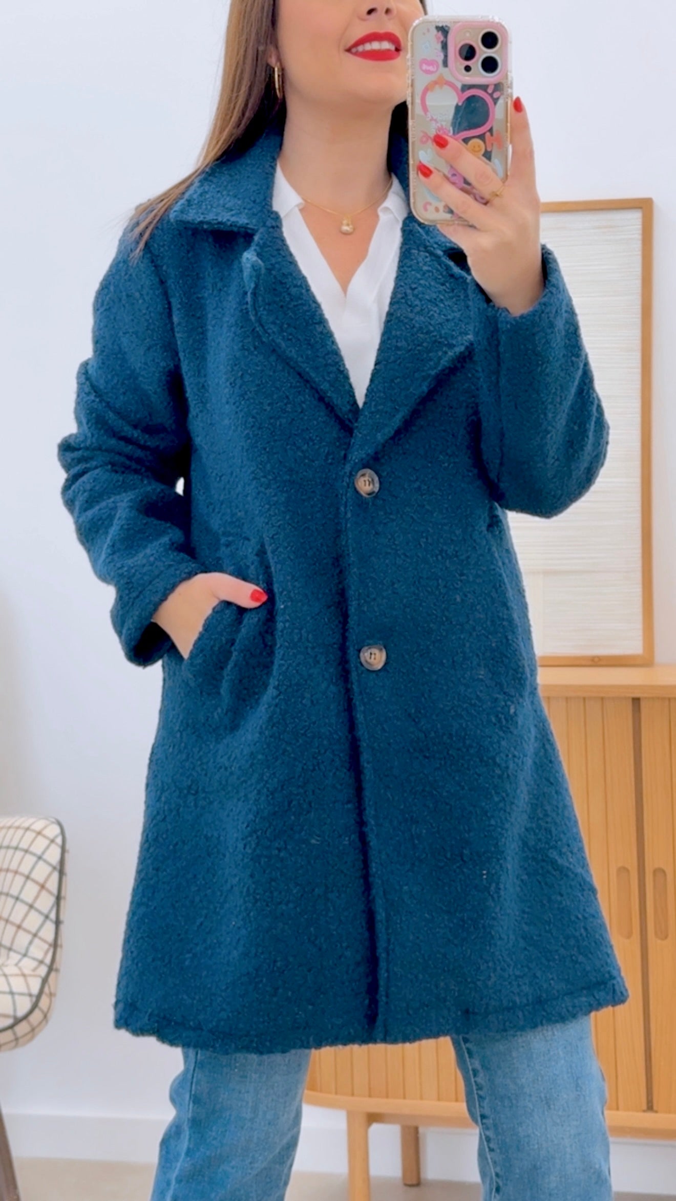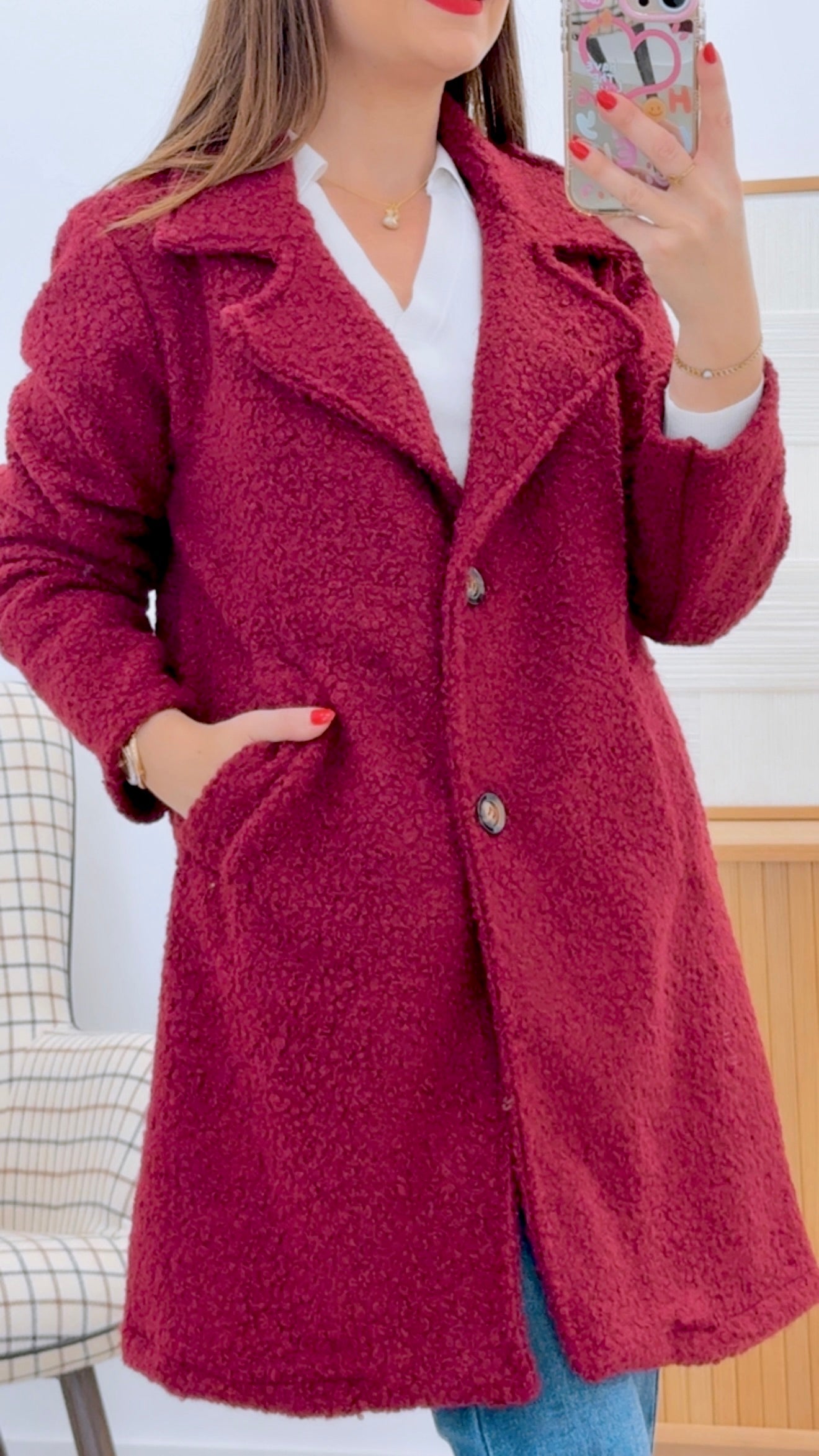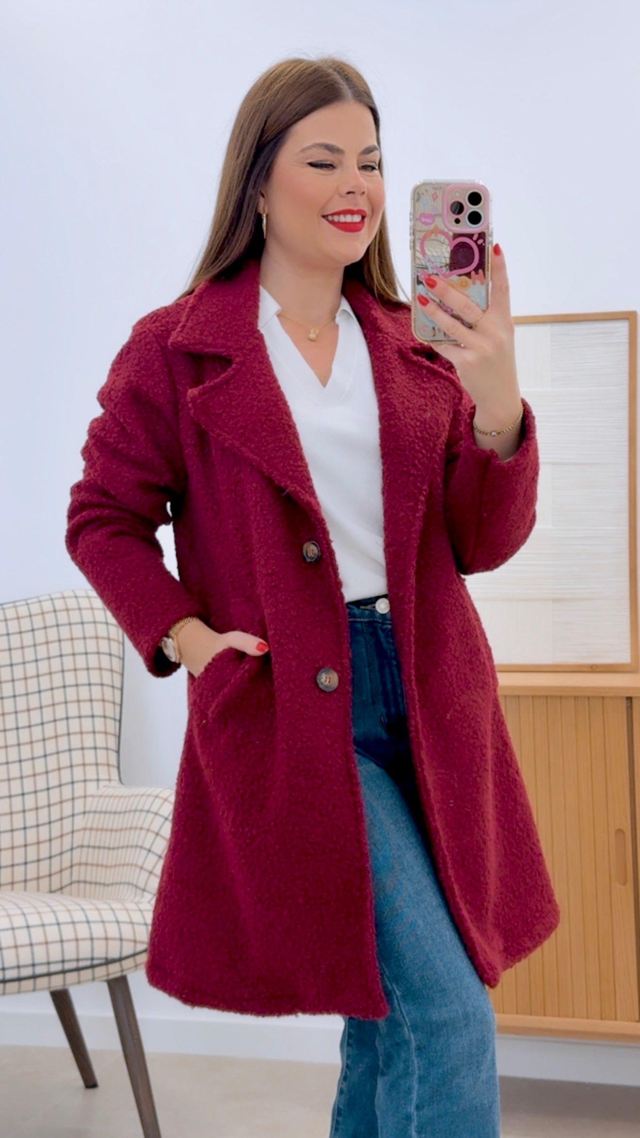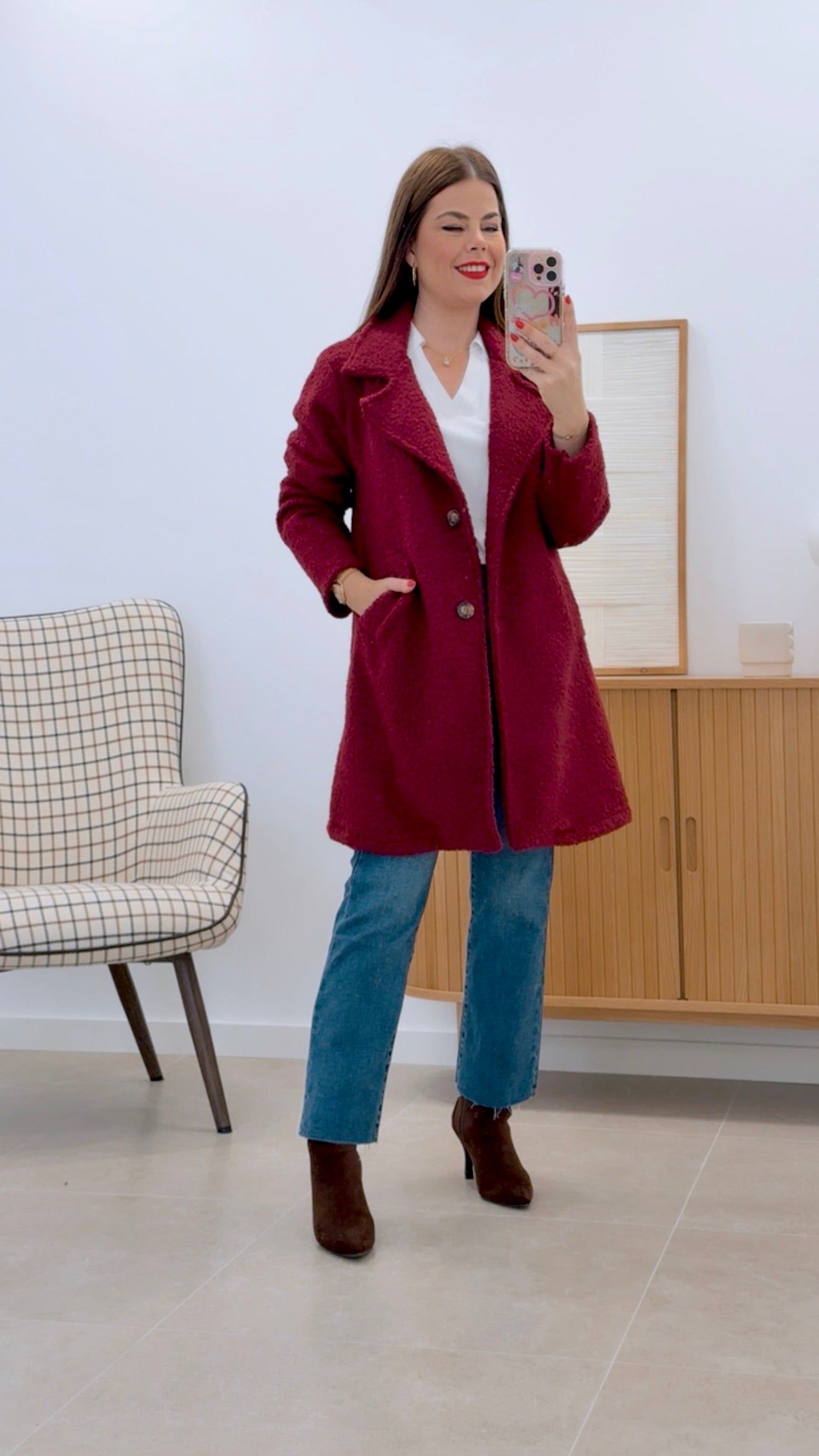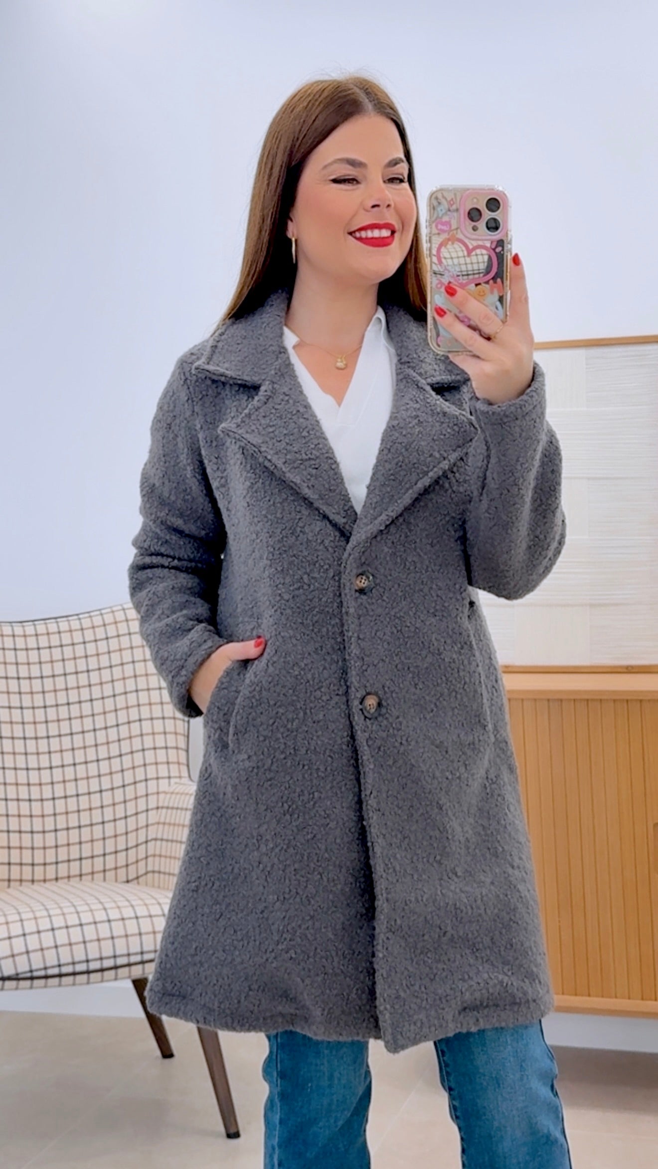 ABRIGO MIERE Abrigo de manga 3/4 confeccionado en tejido efecto borrego que repele el agua, proporcionando protección contra la humedad sin comprometer la comodidad. Diseño sin forro interior que garantiza mayor elasticidad y libertad de movimiento. Cuenta con bolsillos funcionales, cuello solapado distintivo y cierre de botones. Su color liso uniforme se complementa con el acabado texturizado del tejido externo, creando un contraste visual sofisticado. Prenda versátil ideal para transiciones de estación, combinando estilo contemporáneo con practicidad.