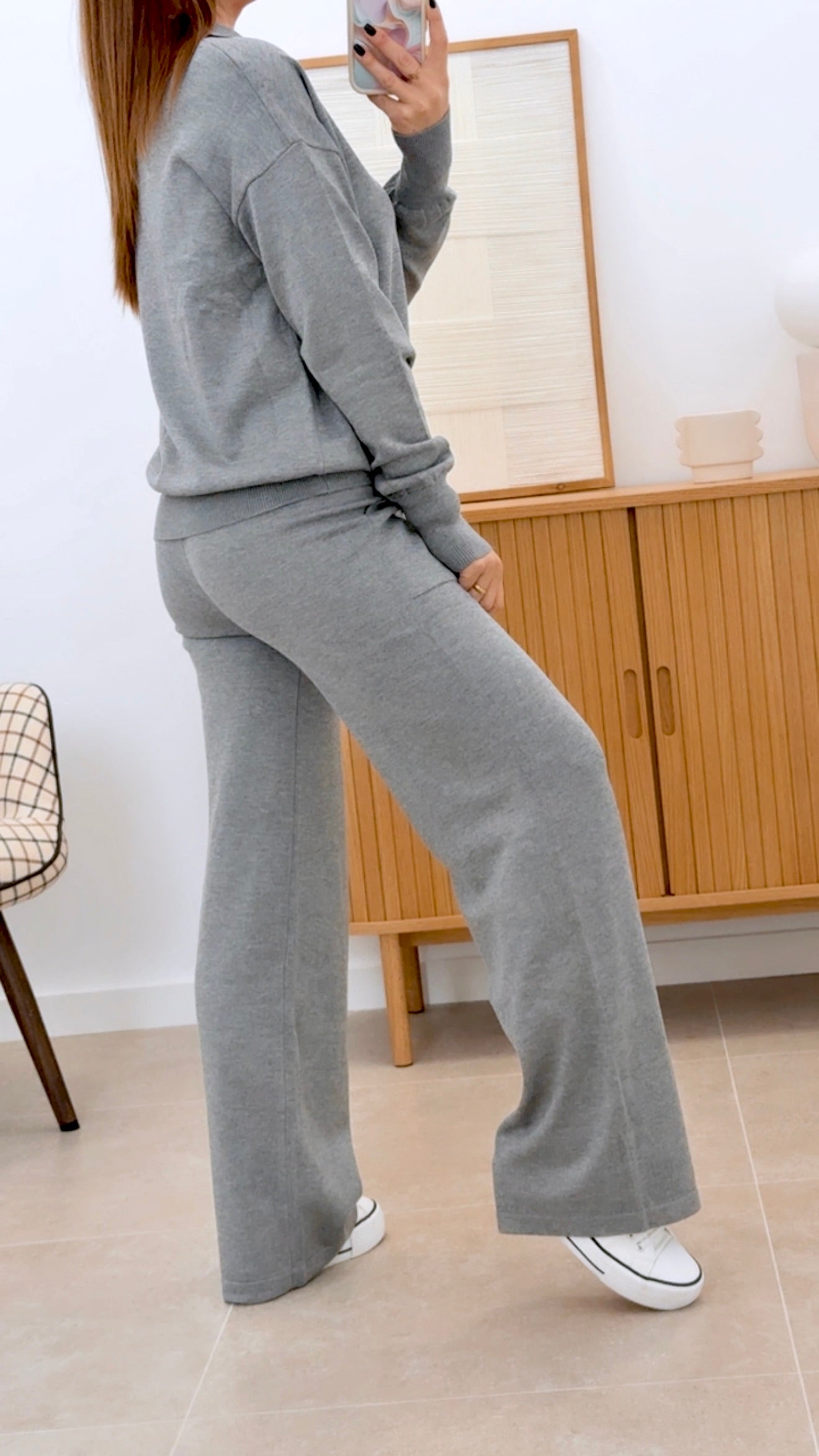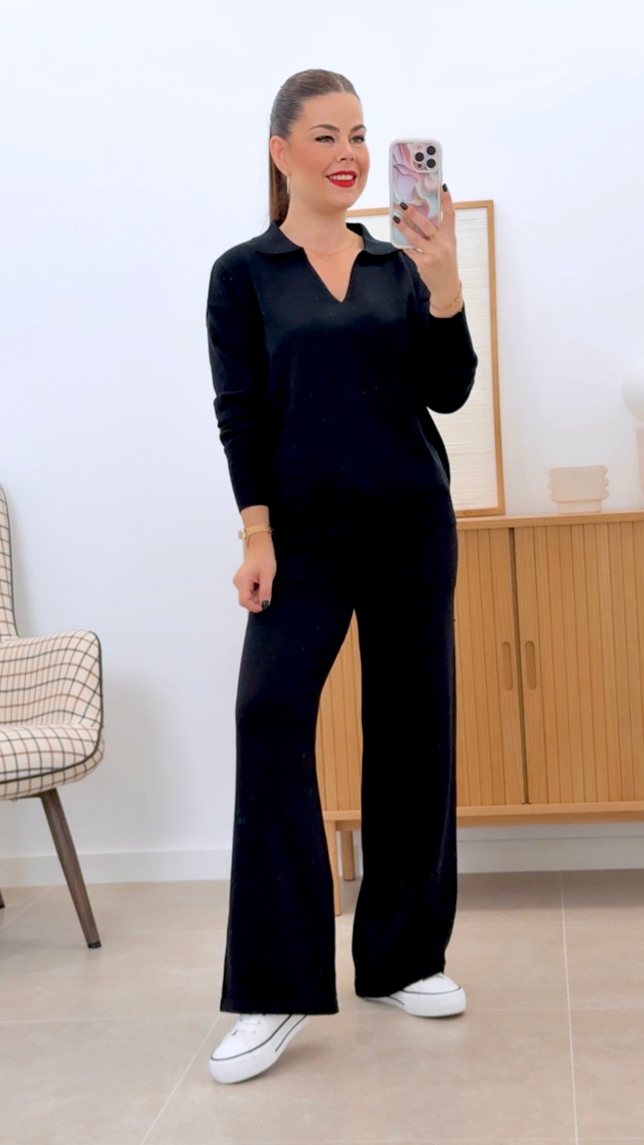 Conjunto versátil de punto compuesto por sudadera con cuello efecto polo y pantalón de cintura engomada. Confeccionado en mezcla de fibras premium: 50% viscosa que proporciona suavidad y transpirabilidad, complementada con 25% nylon para mayor resistencia y 25% poliéster para durabilidad. Disponible en color liso. Prenda cómoda y funcional.