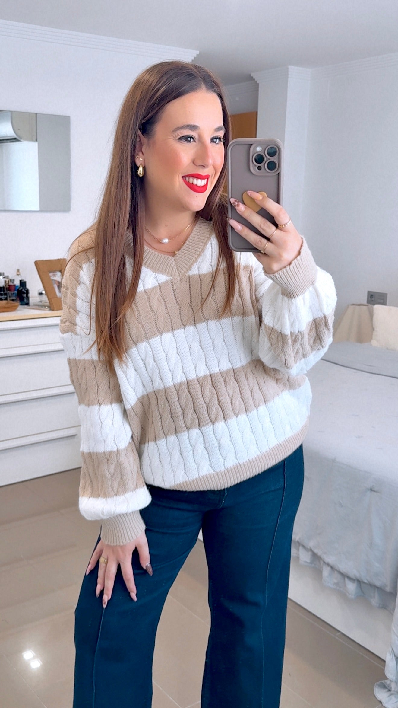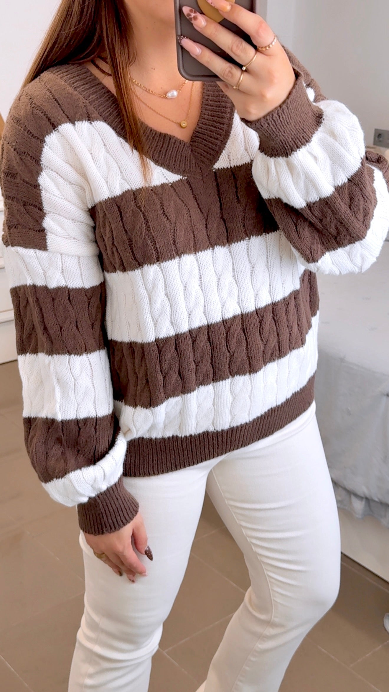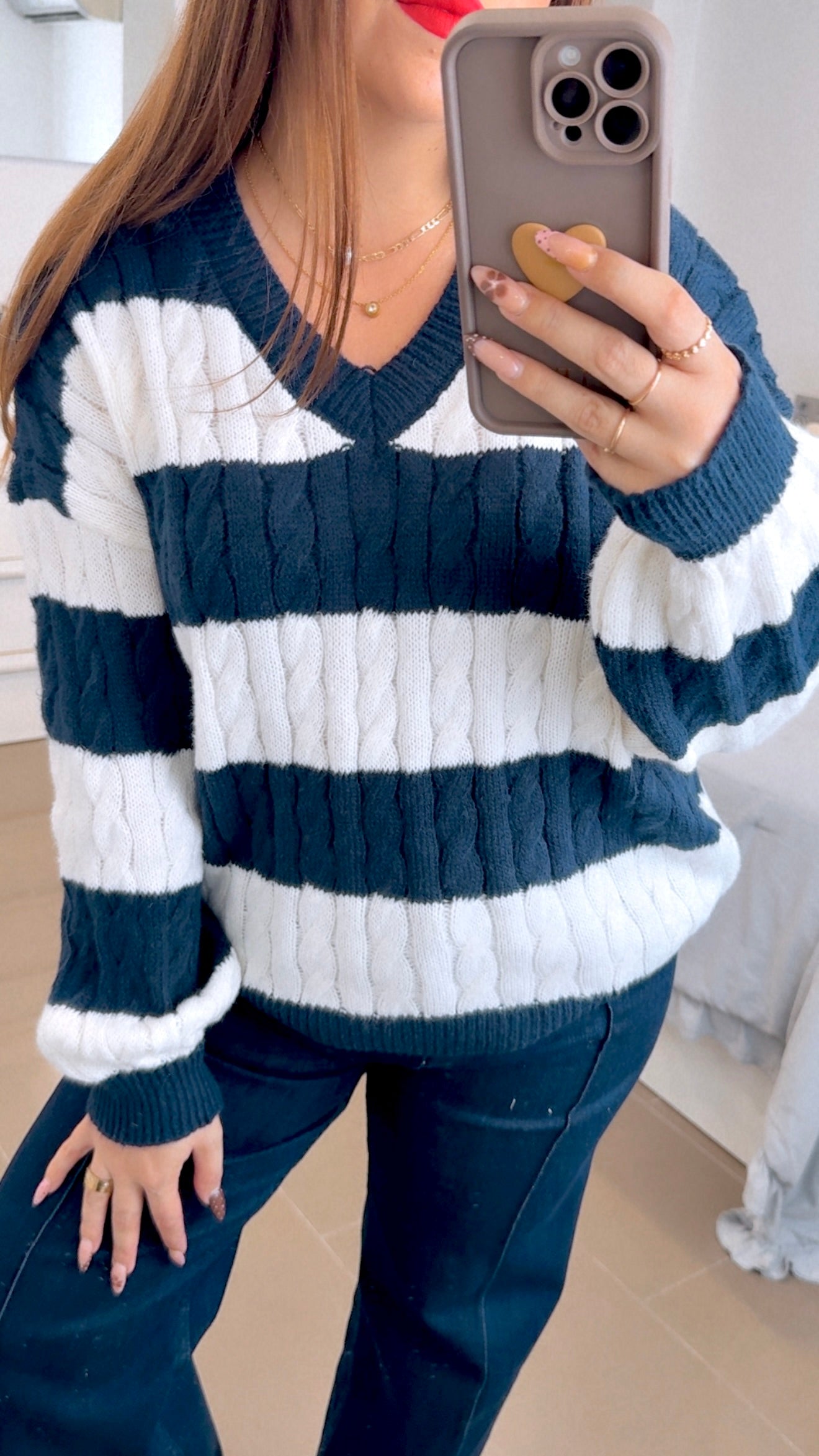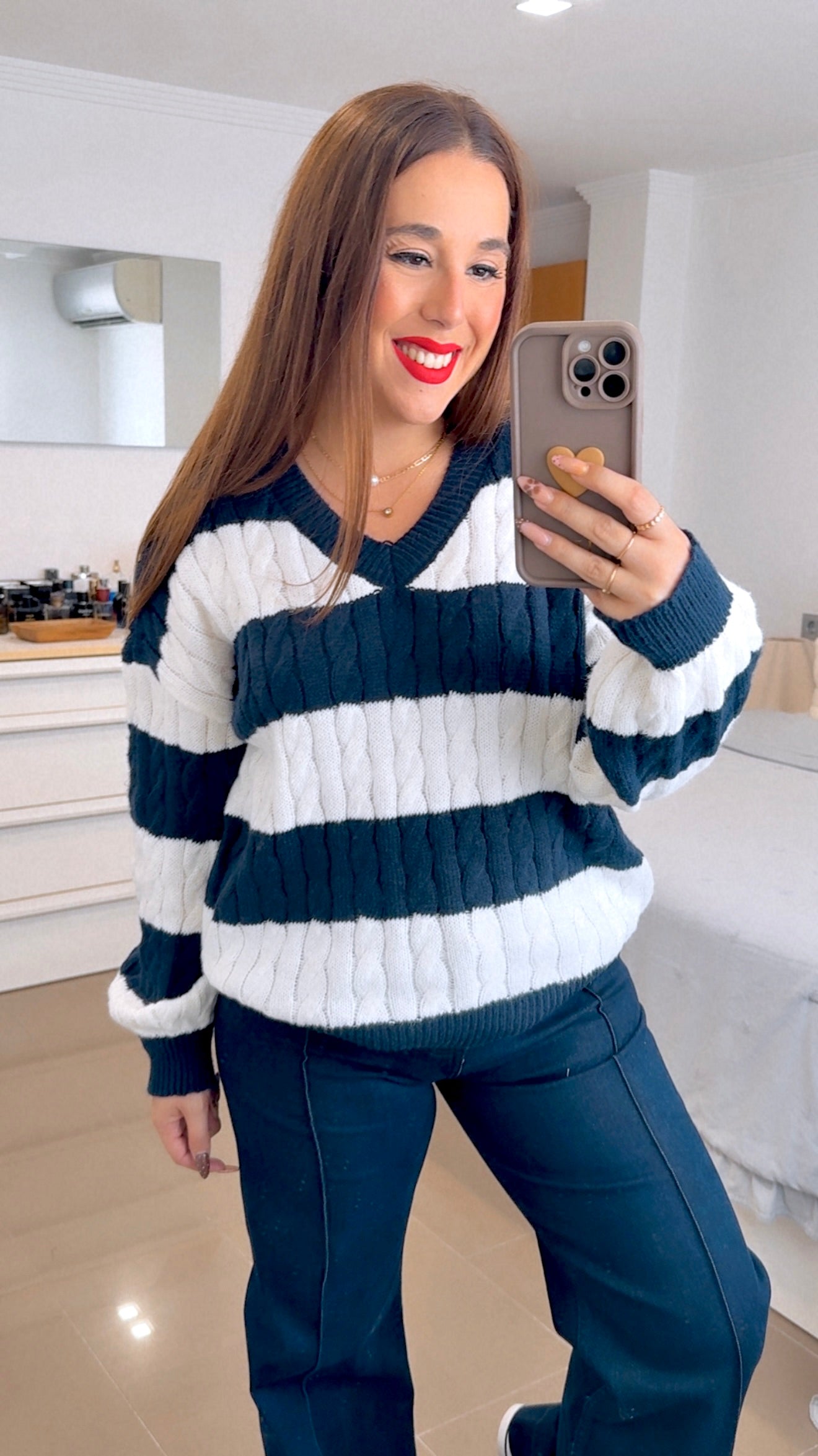 Este suéter de talla única combina colores con un diseño de rayas y un elegante cuello en V. Su tejido mezcla 30% acrílico, 30% nylon y 40% poliéster, ofreciendo una prenda resistente, ligera y confortable. Ideal para aportar estilo y comodidad en cualquier ocasión.