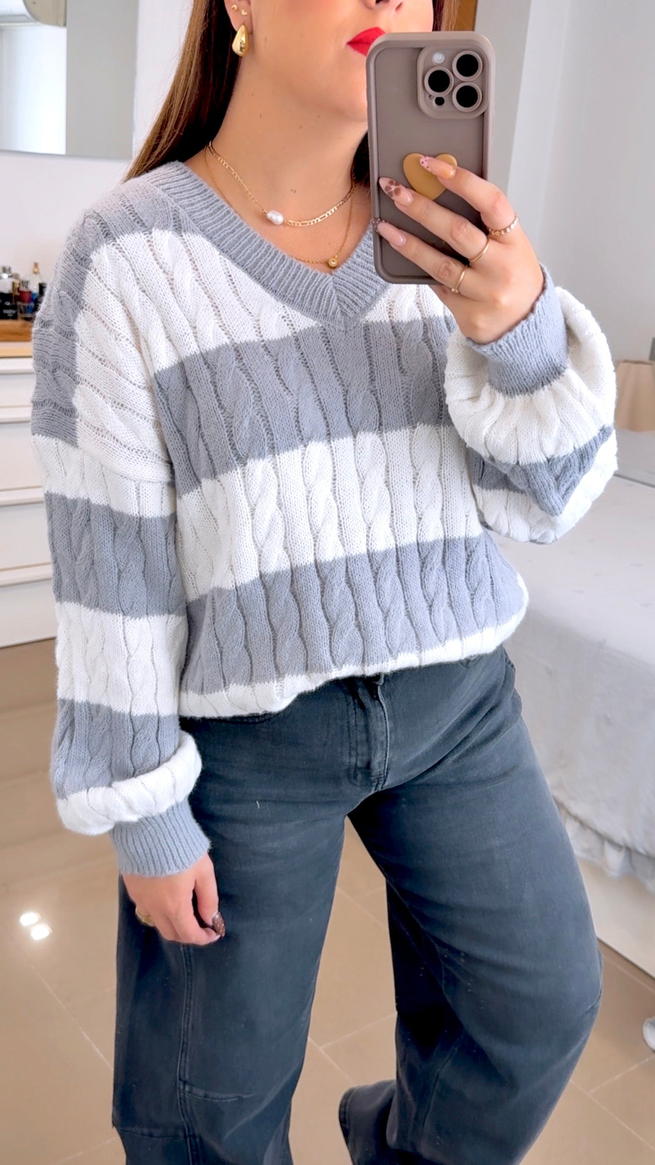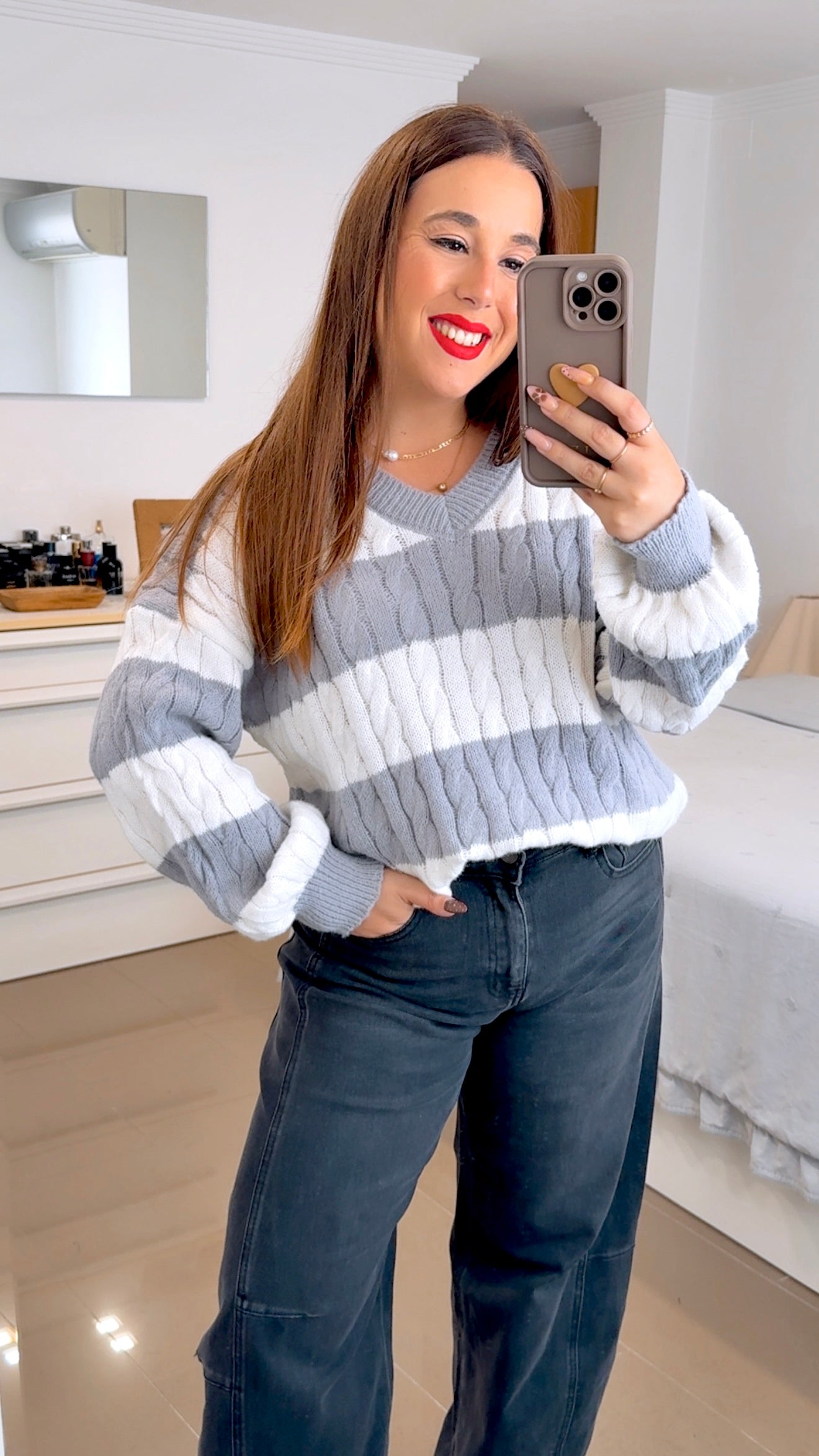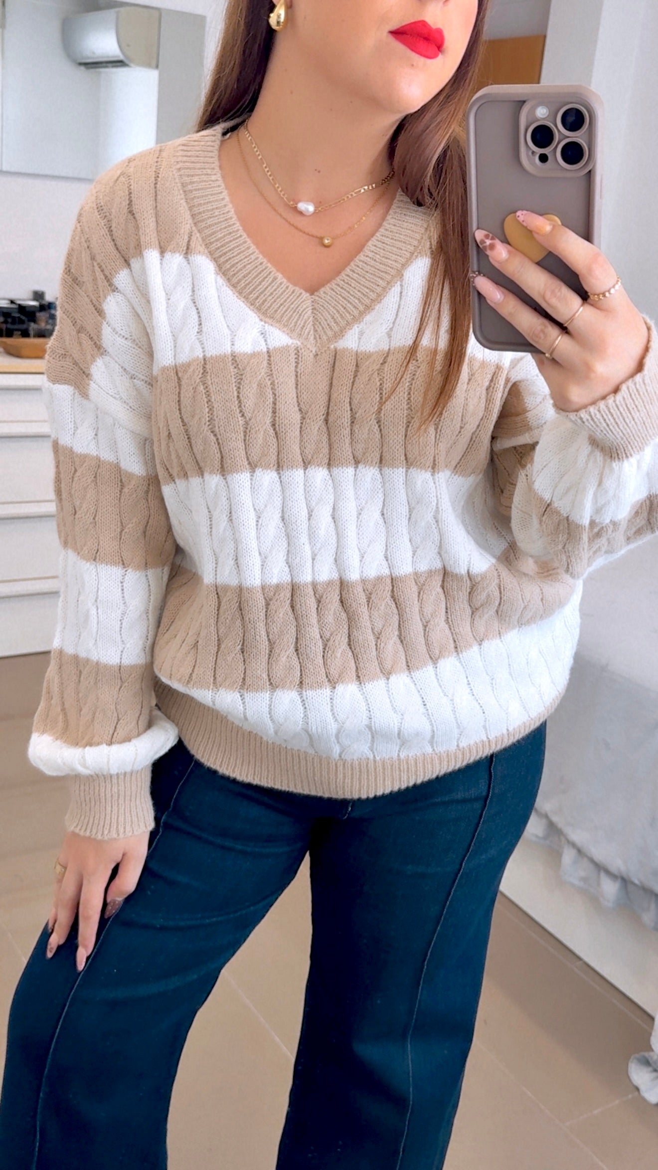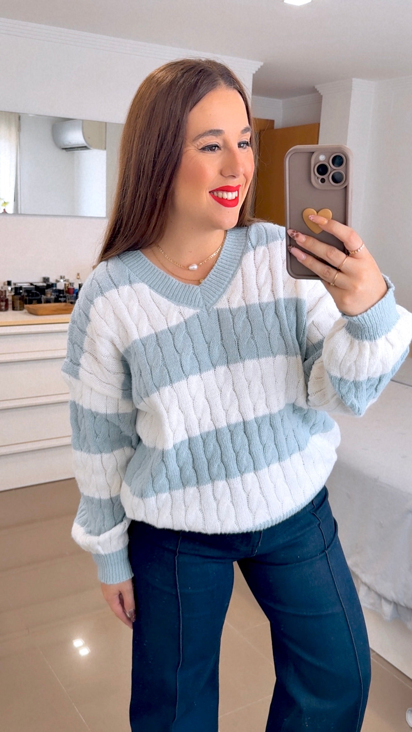 Este suéter de talla única combina colores con un diseño de rayas y un elegante cuello en V. Su tejido mezcla 30% acrílico, 30% nylon y 40% poliéster, ofreciendo una prenda resistente, ligera y confortable. Ideal para aportar estilo y comodidad en cualquier ocasión.