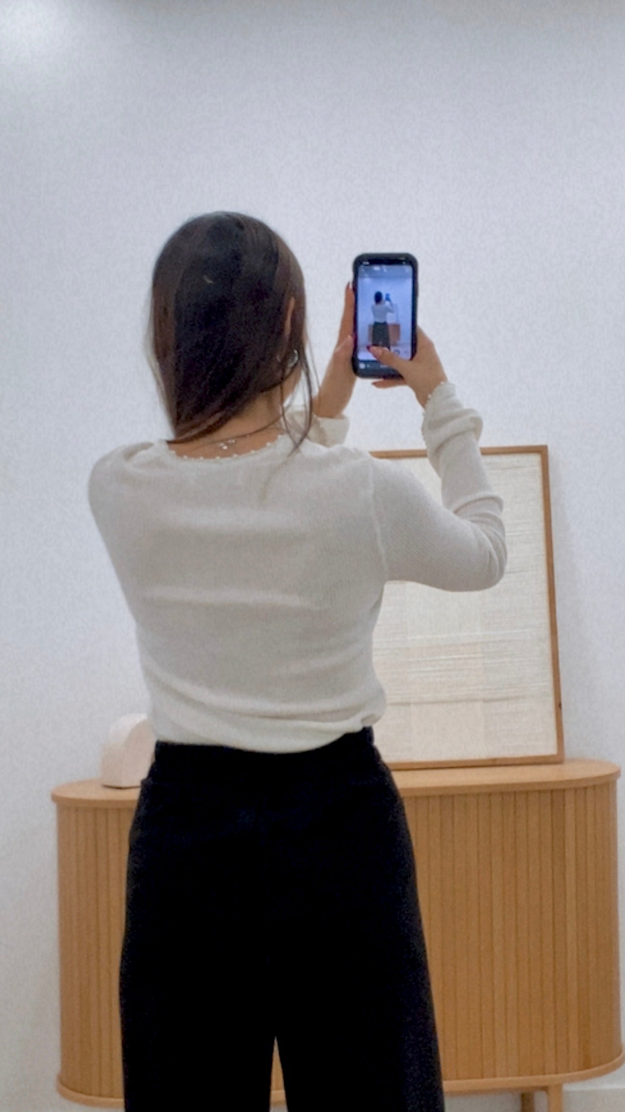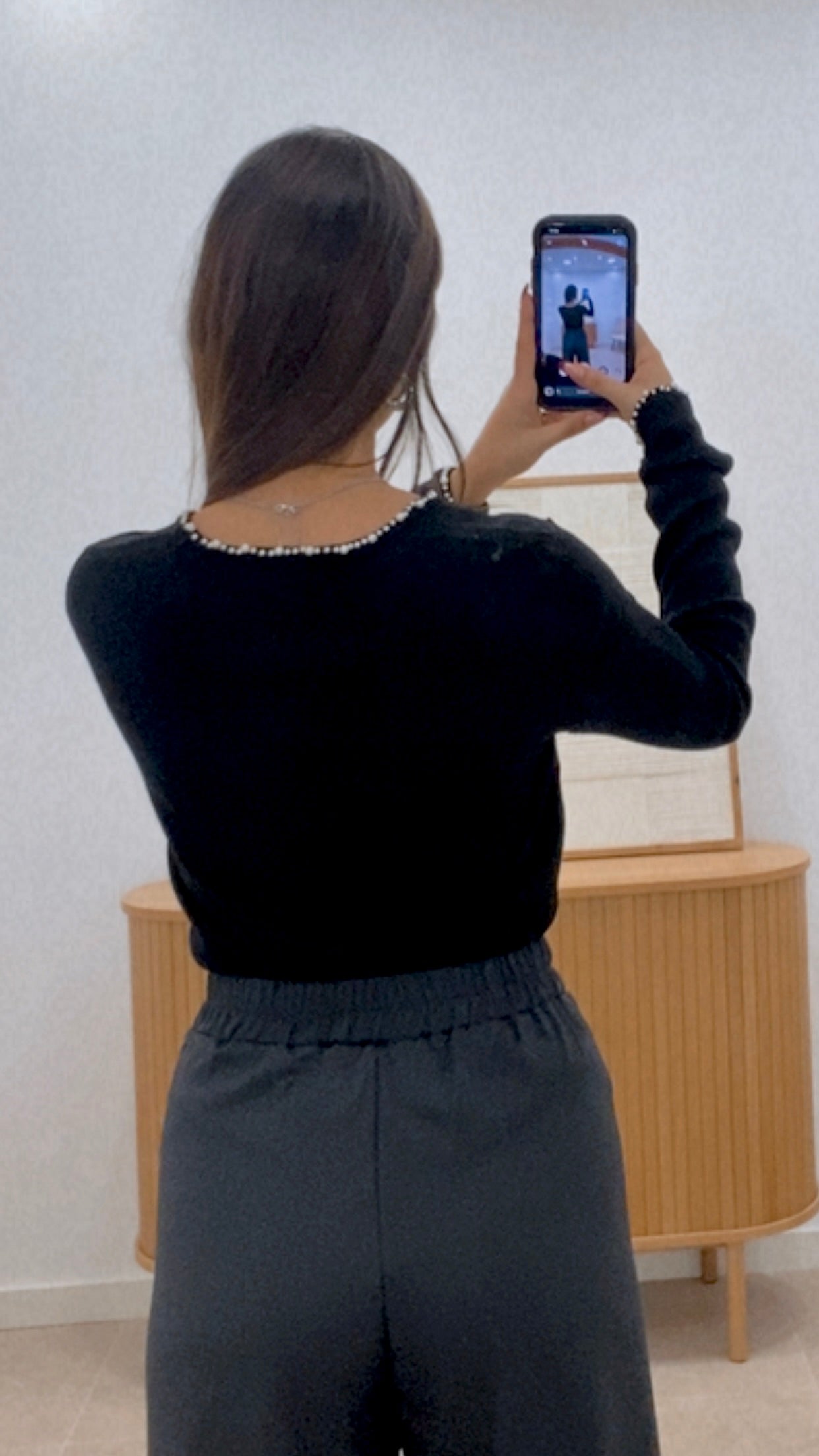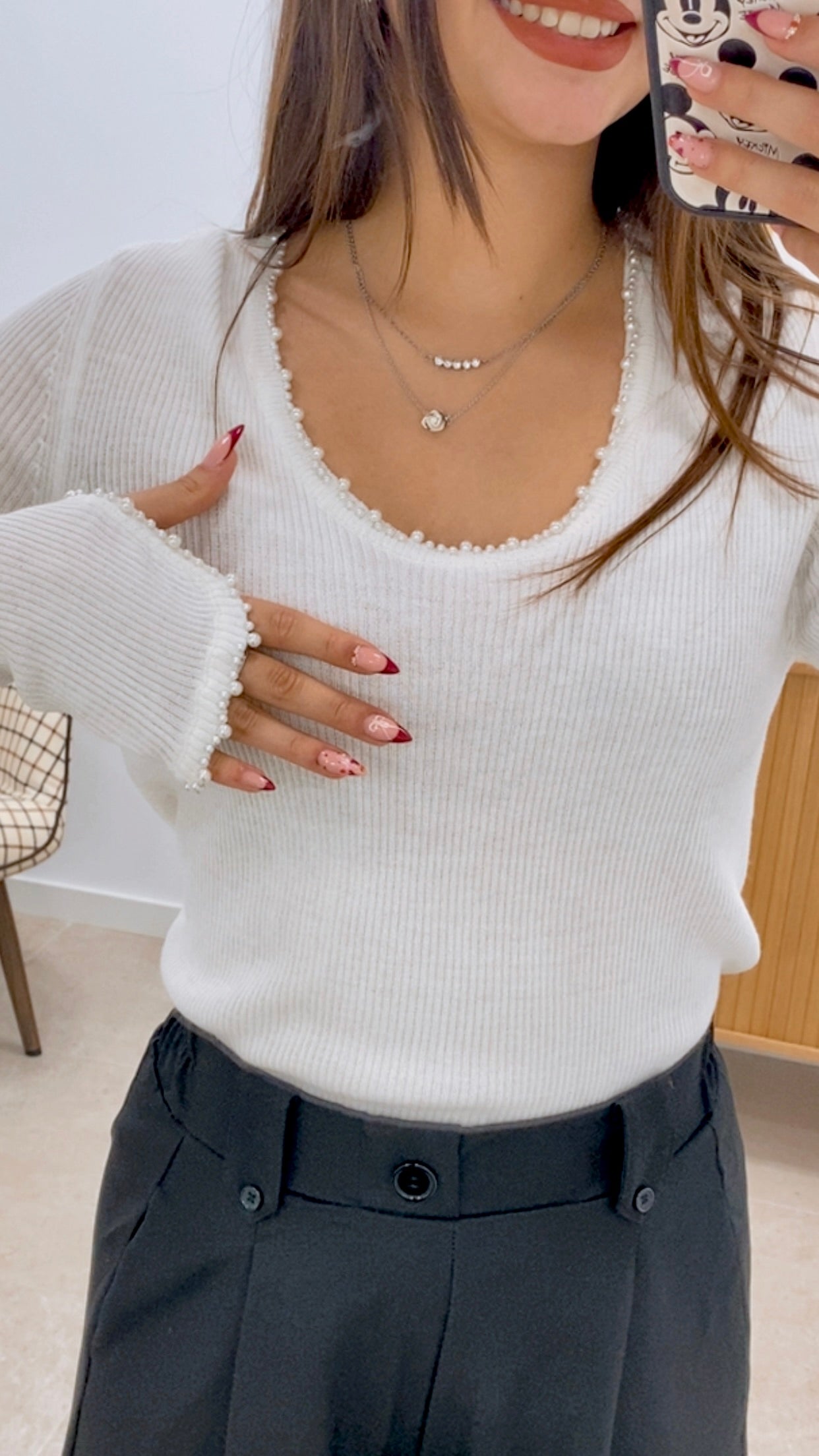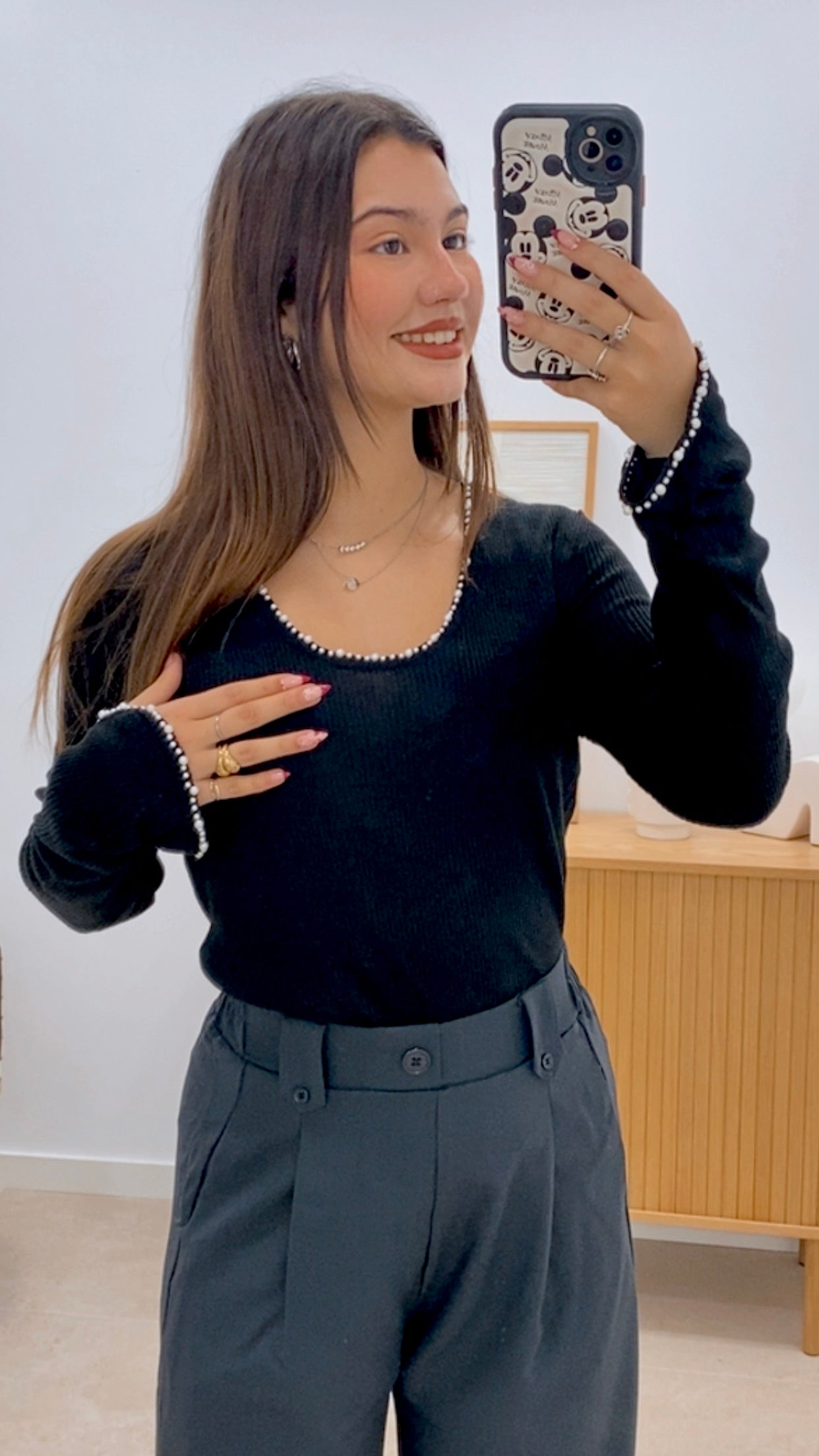 This long-sleeved T-shirt is made from a blended fabric combining 50% polyester, 25% nylon, 21% acrylic, and 4% wool for comfort and durability. Available in one size with a solid color finish. It features strategically placed pearl embellishments on the collar and cuffs, adding an elegant and sophisticated touch. A versatile garment suitable for various occasions, it combines functionality with a refined design.