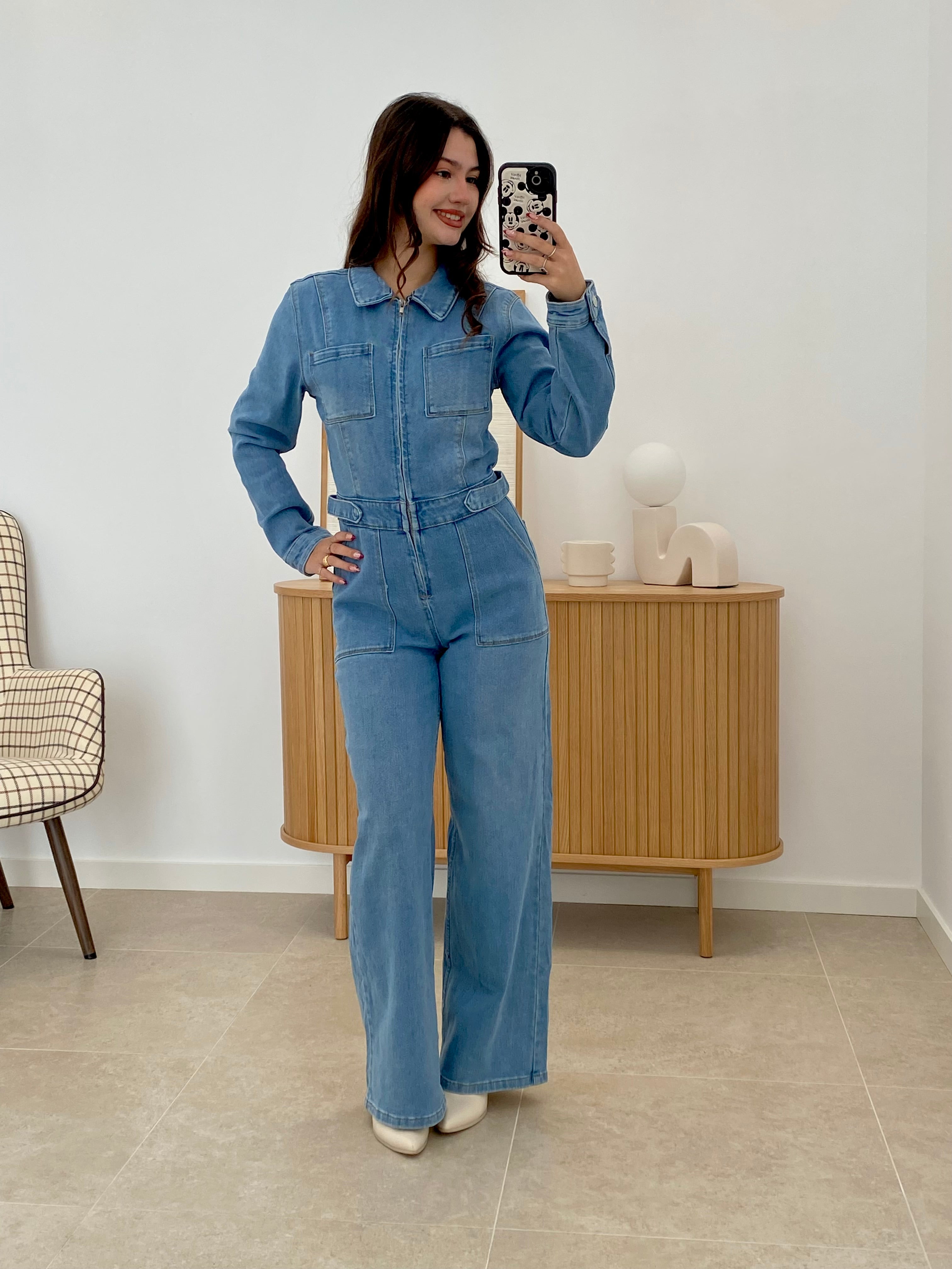 Long-sleeved denim jumpsuit with a lapel collar for a classic and versatile look. A front zip closure offers added comfort and convenience. Designed with strategically placed functional pockets. Available in sizes S to L for an optimal fit. This durable garment, crafted from quality denim, is ideal for creating stylish casual looks. 72% Cotton, 26% Polyester, and 2% Elastane