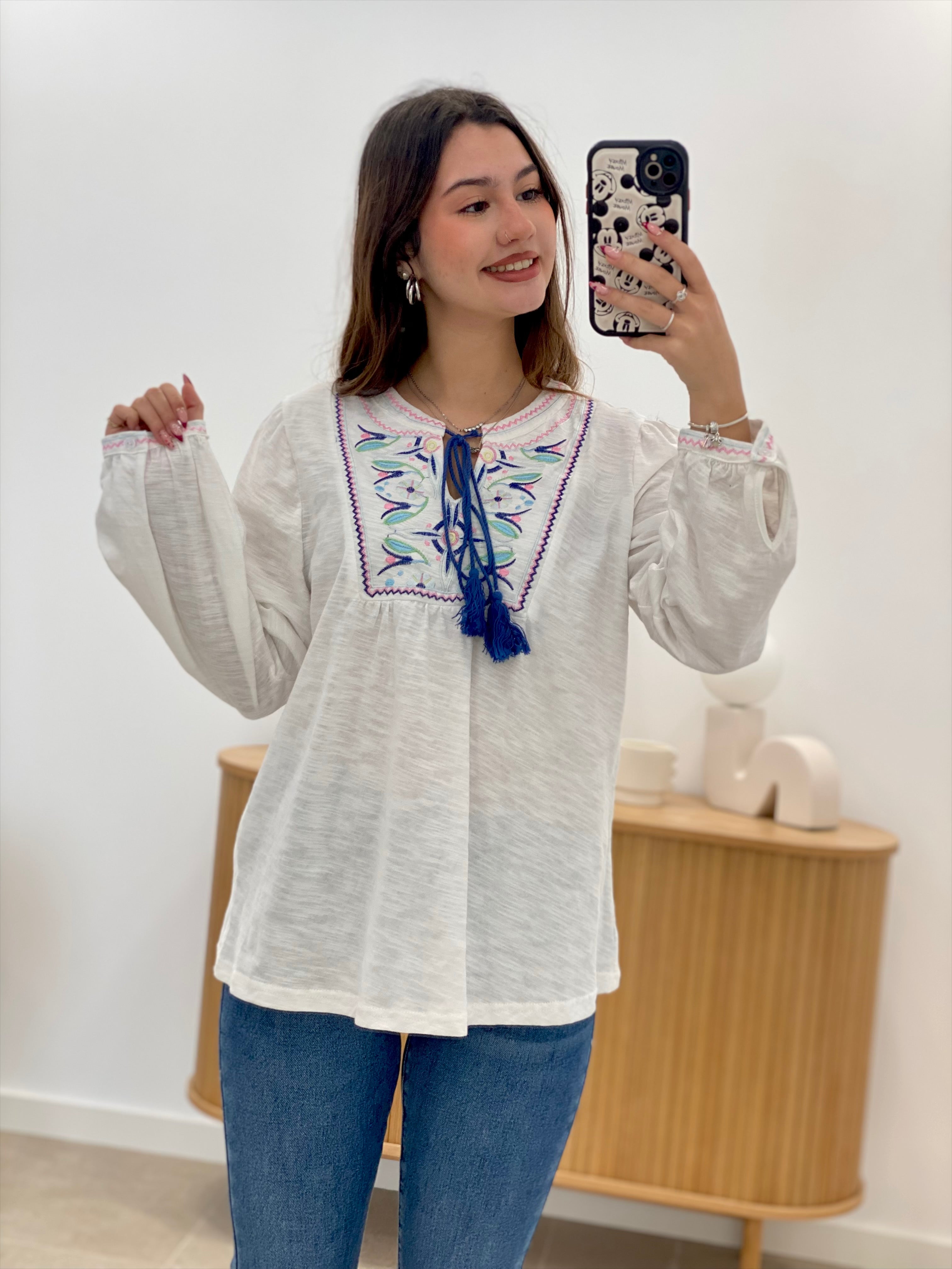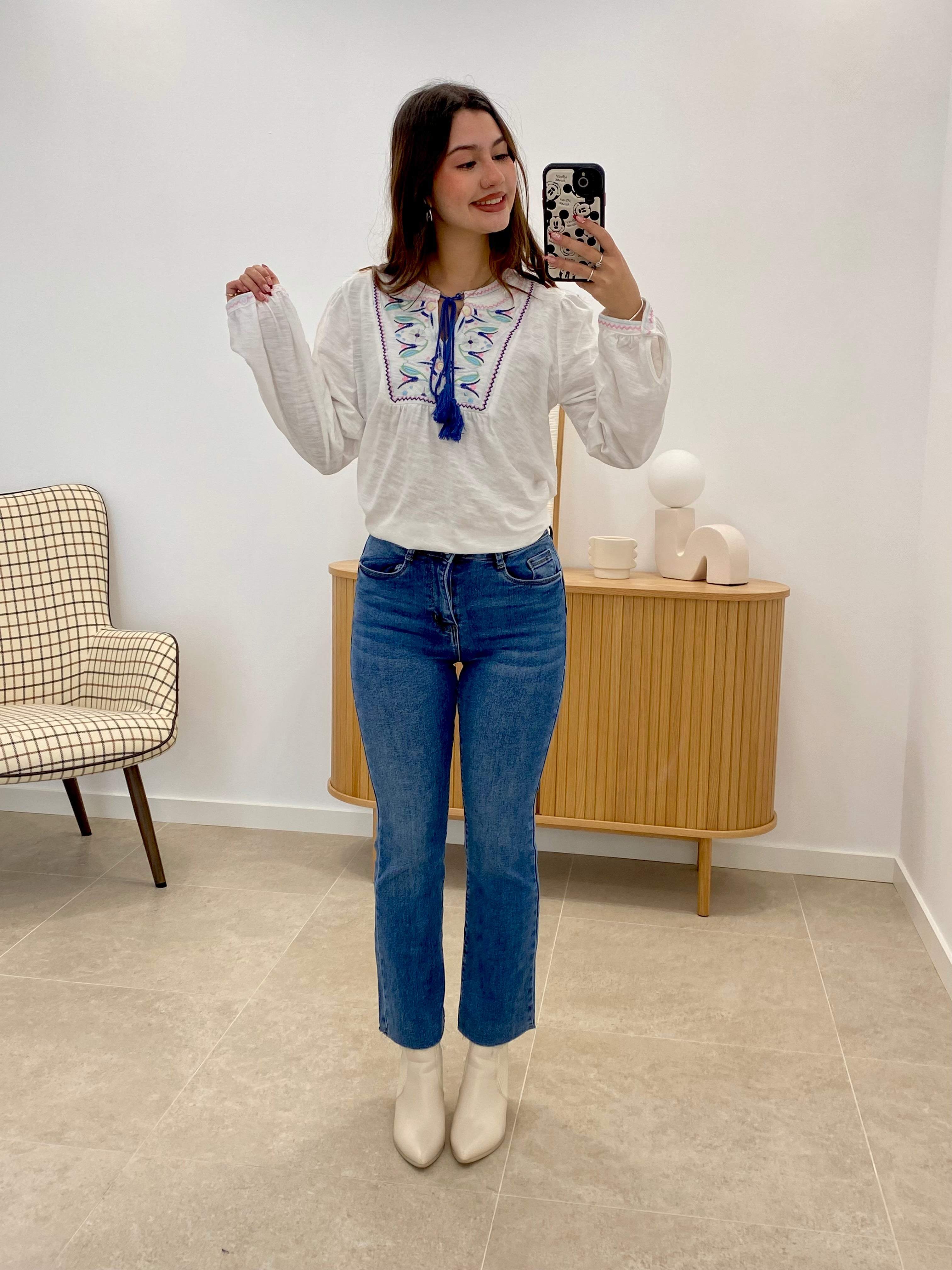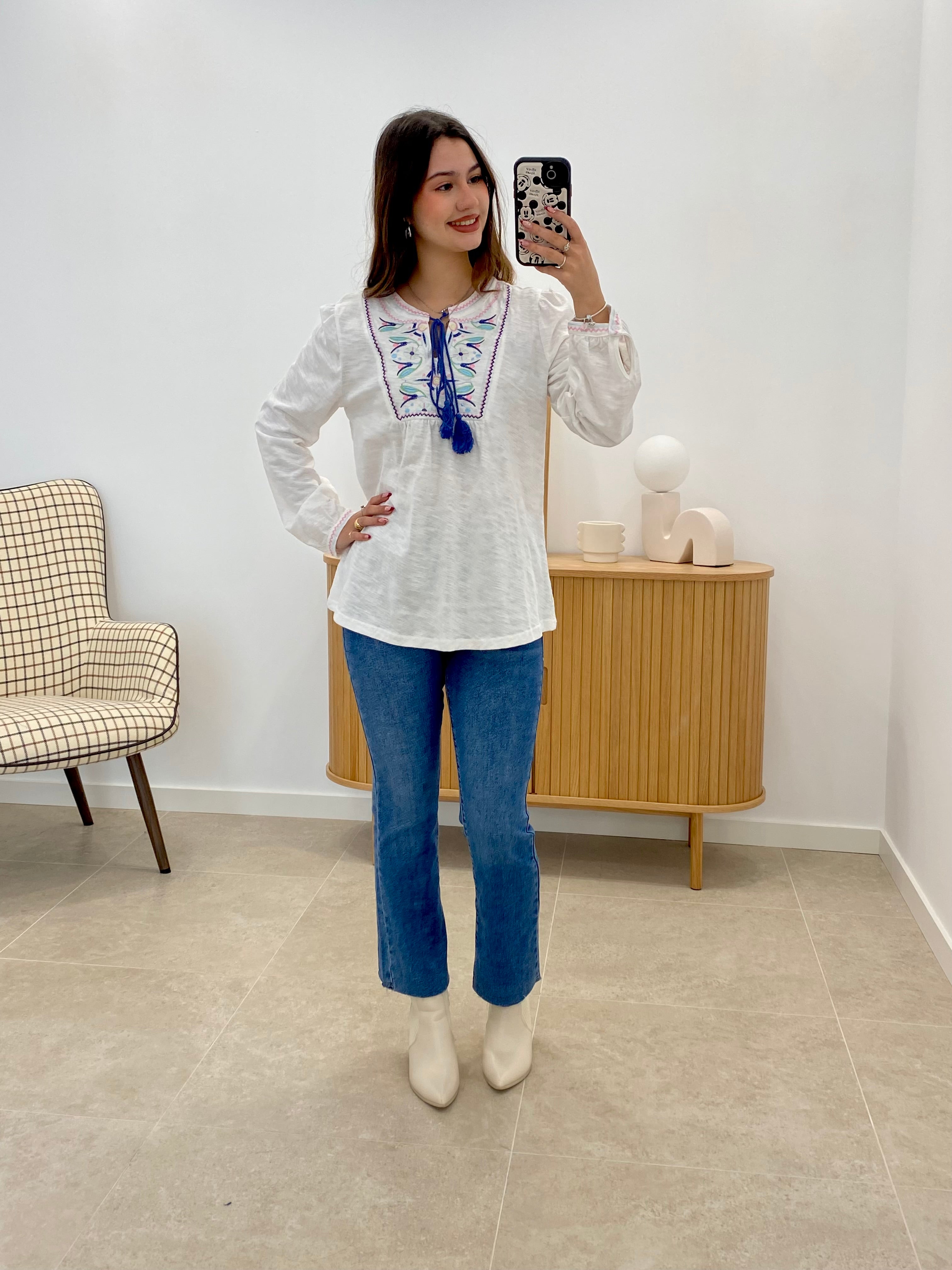 This blouse is crafted from a cotton and elastane blend, ensuring comfort and flexibility with every movement. Available in sizes S to XL, it features elegant embroidery on the chest in a combination of blue and pink tones, adding a sophisticated touch to your wardrobe. The 95% cotton composition guarantees breathability and durability, while the 5% elastane provides stretch for a perfect fit. A versatile garment ideal for both casual and professional occasions.