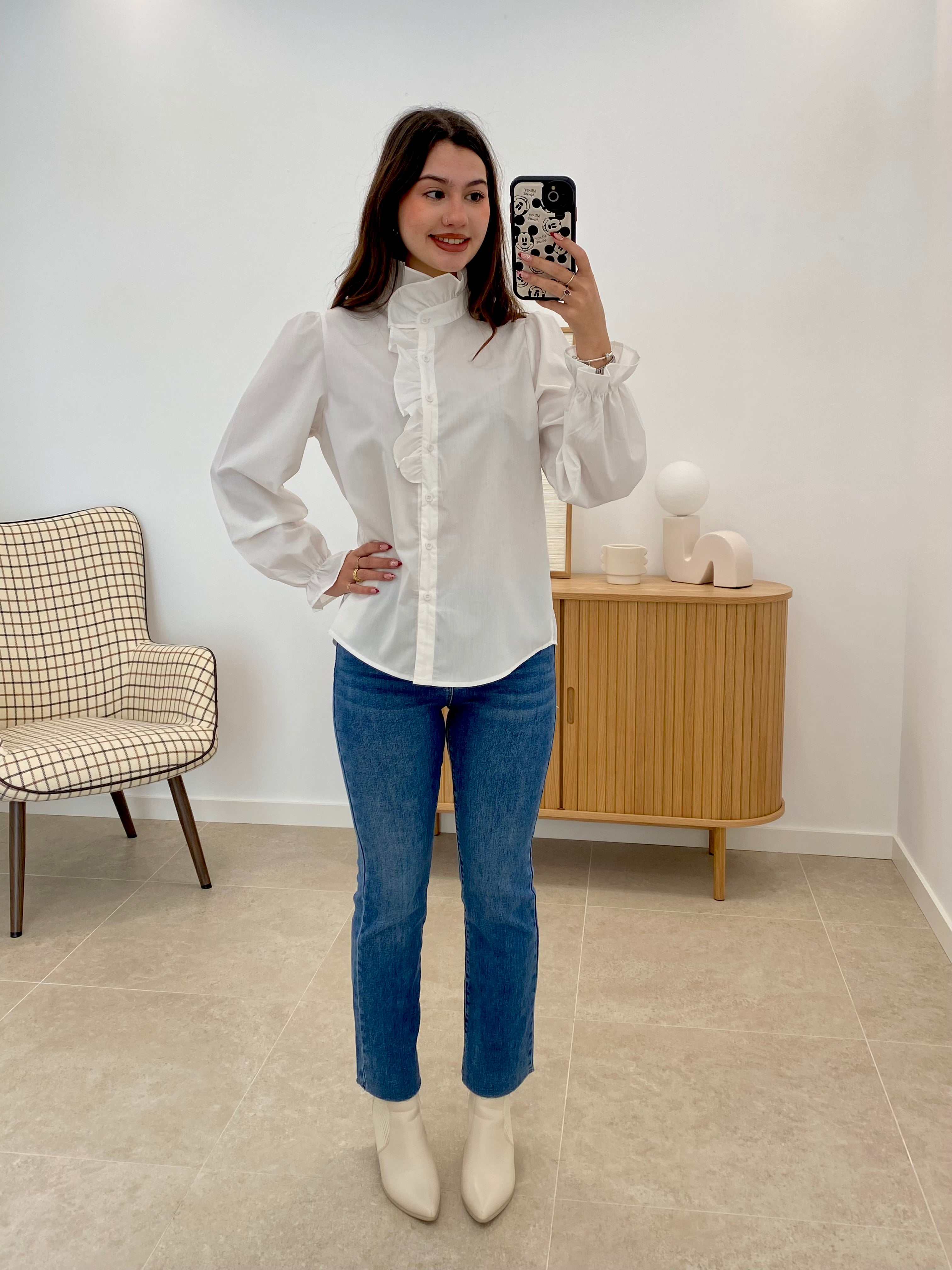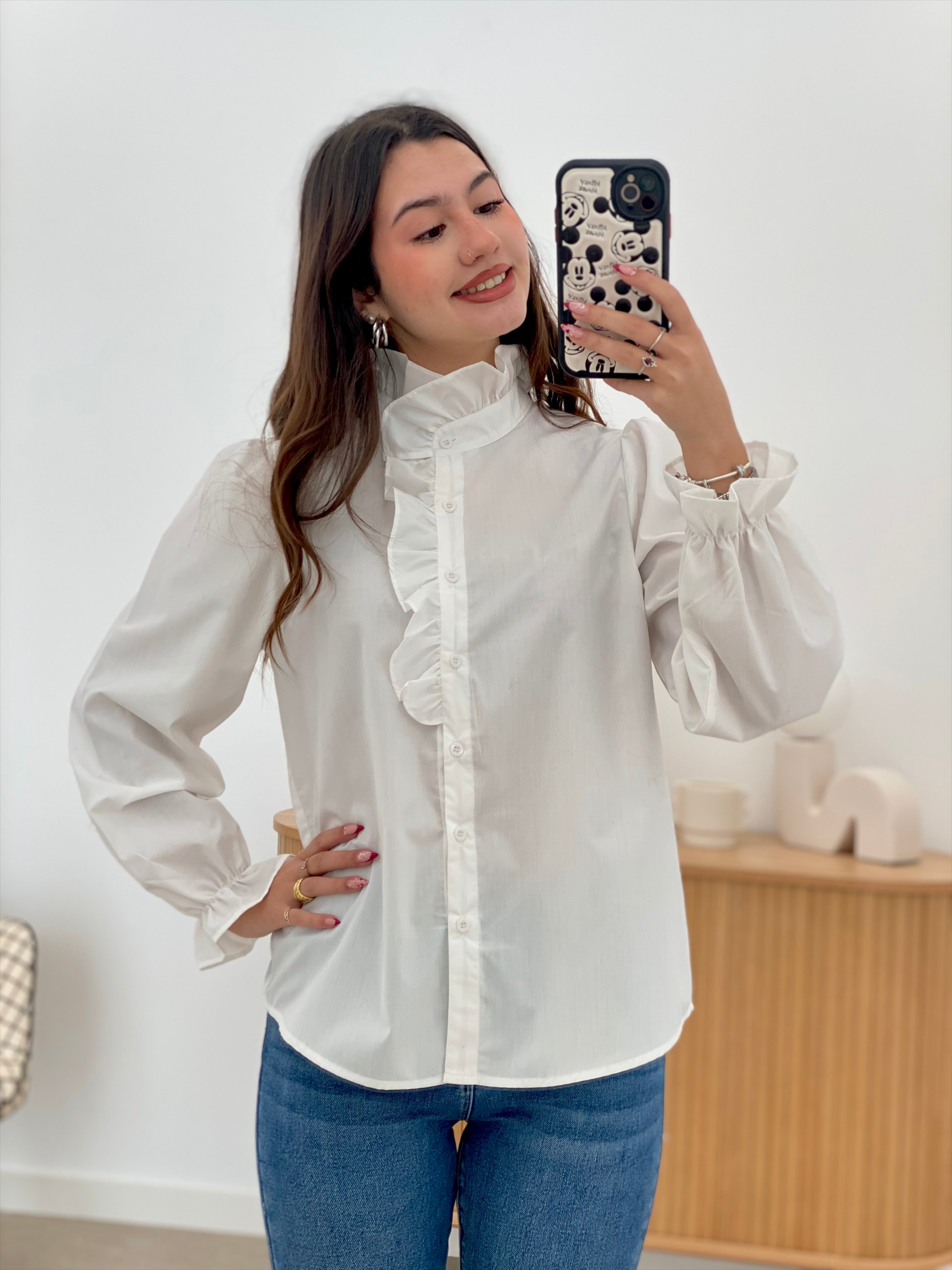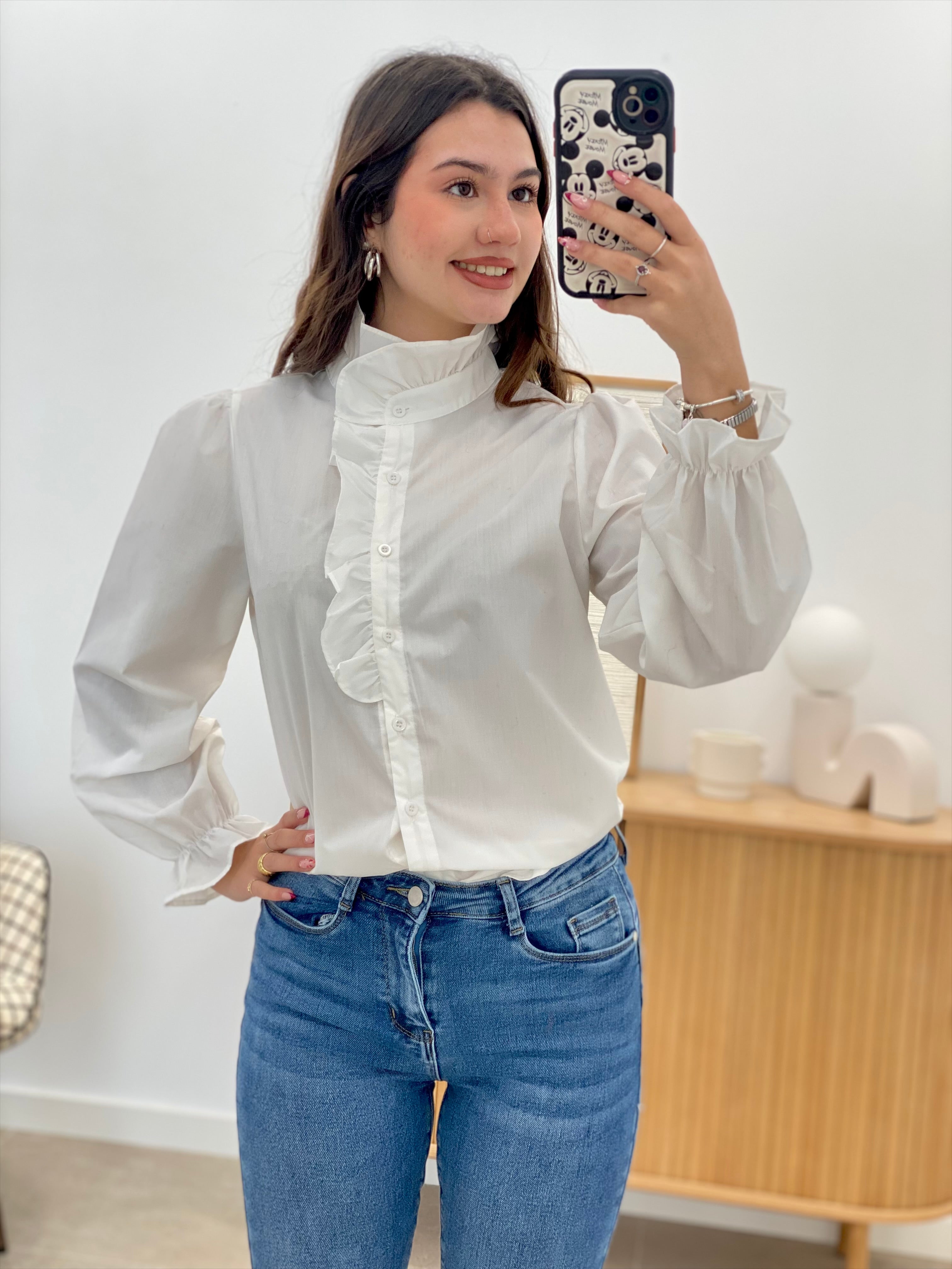 Cette élégante chemise est confectionnée dans un mélange de 70 % polyester et 30 % viscose, alliant résistance et douceur au toucher. Disponible des tailles S à XL dans un coloris uni polyvalent. Elle présente une fermeture boutonnée sur le devant et des détails raffinés : un col volanté et des poignets froncés qui lui confèrent une touche sophistiquée et féminine. Un vêtement polyvalent, idéal pour composer facilement des tenues professionnelles et décontractées.