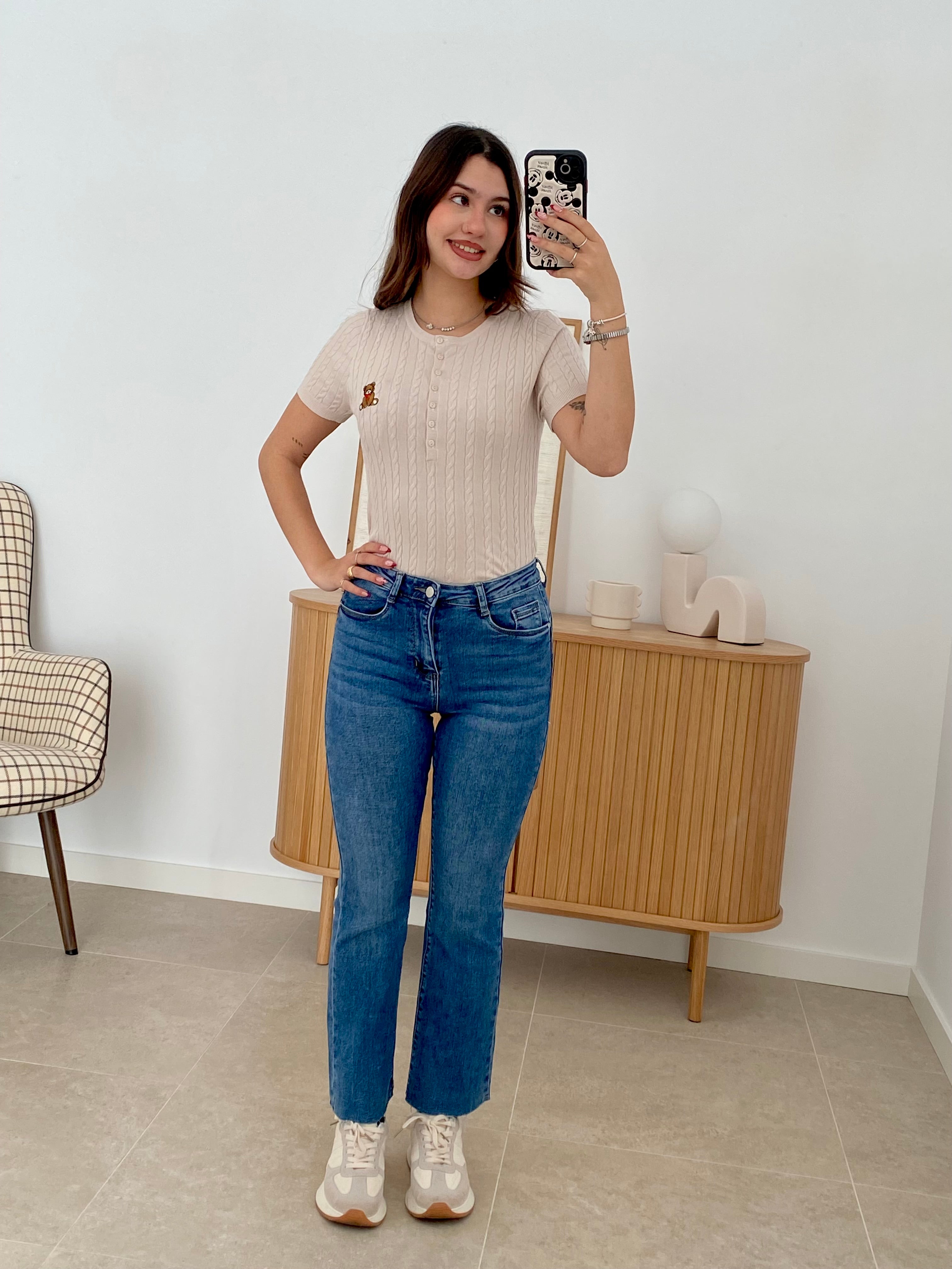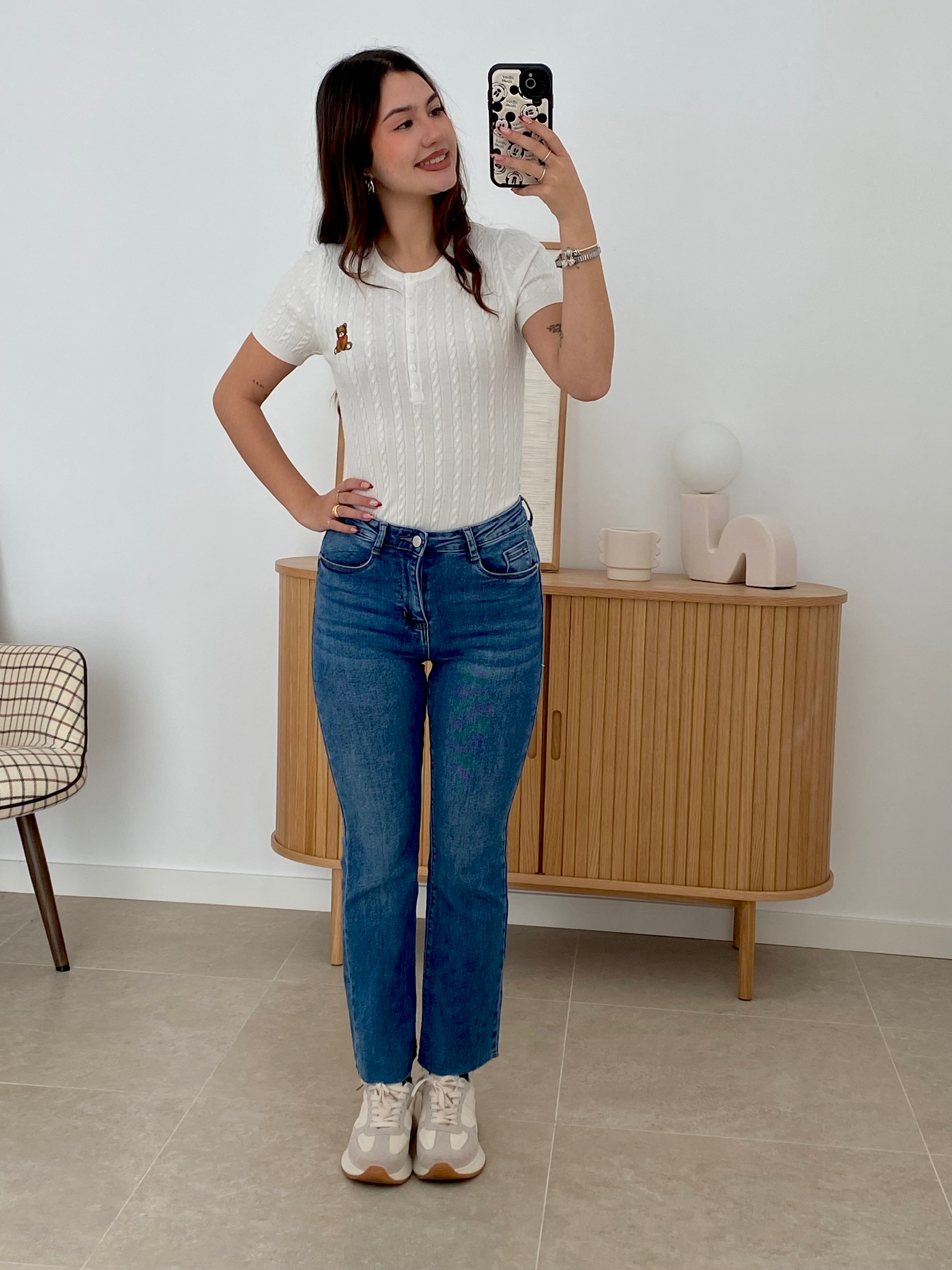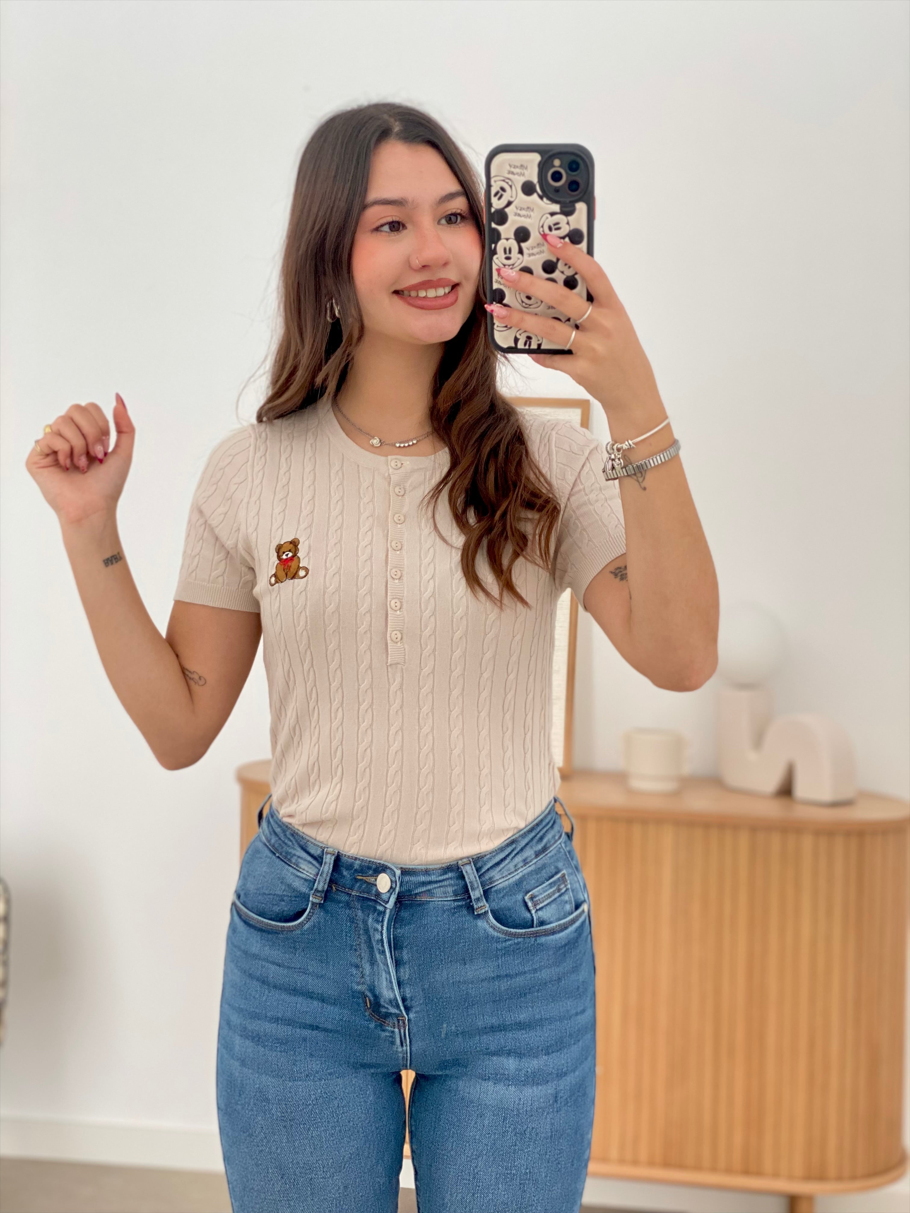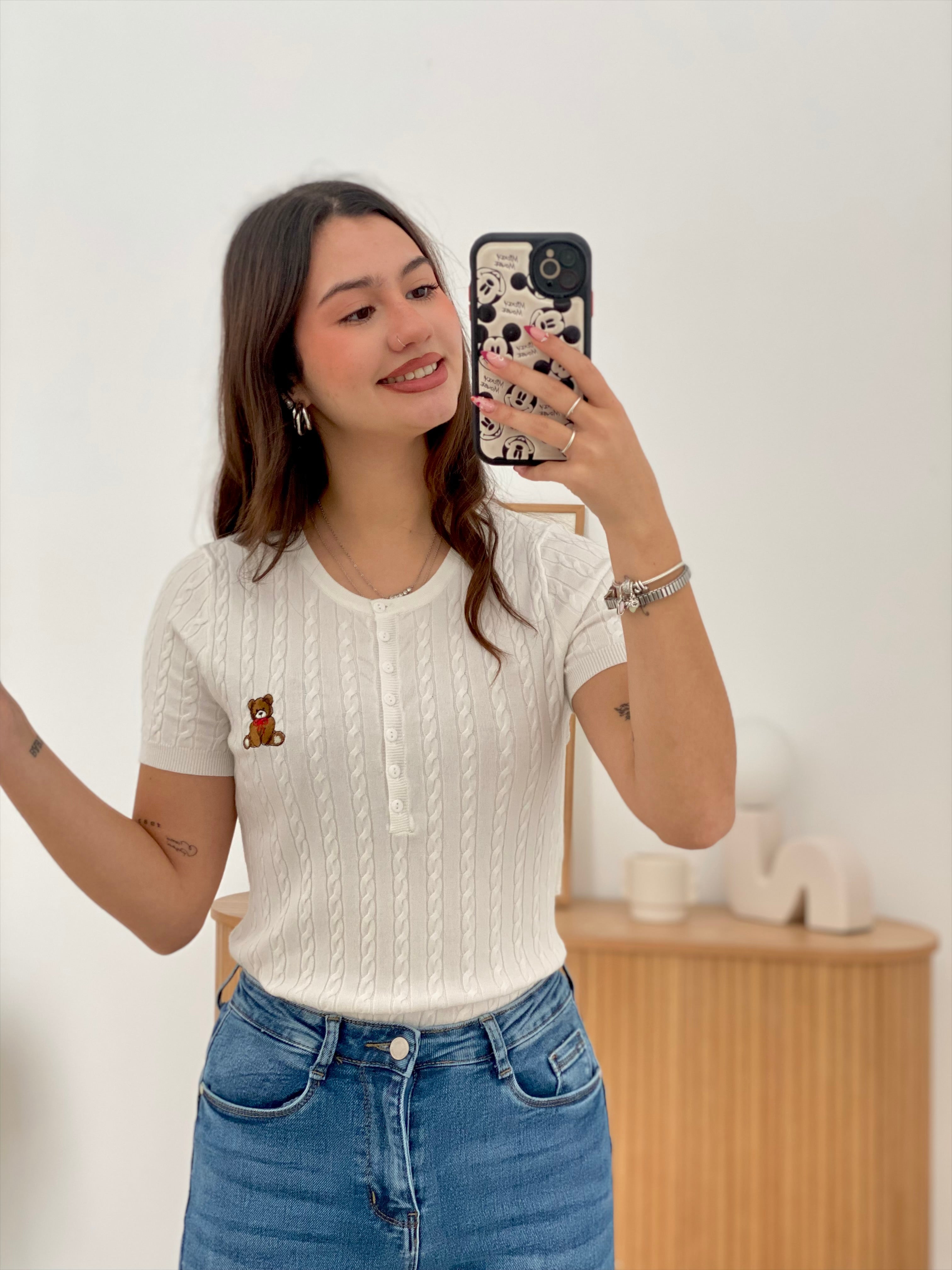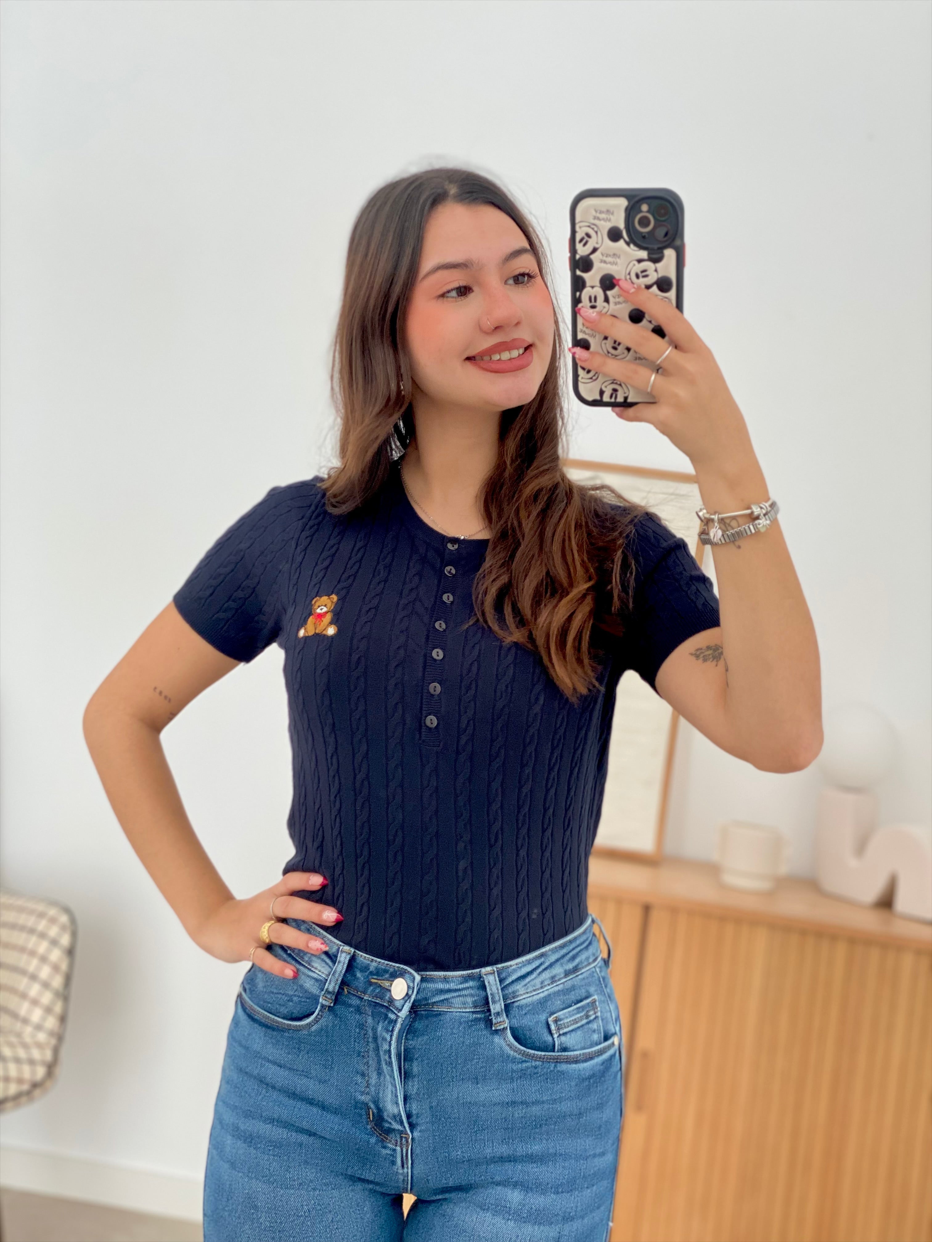 Camiseta de punto fino en manga corta, confeccionada con una composición de 55% viscosa, 35% poliéster y 10% elastán que garantiza comodidad y elasticidad. Disponible en tallas S/M y L/XL. Destaca por sus botones en el pecho y un delicado osito bordado que añade un toque distintivo. Prenda versátil y de calidad, ideal para el uso diario.
