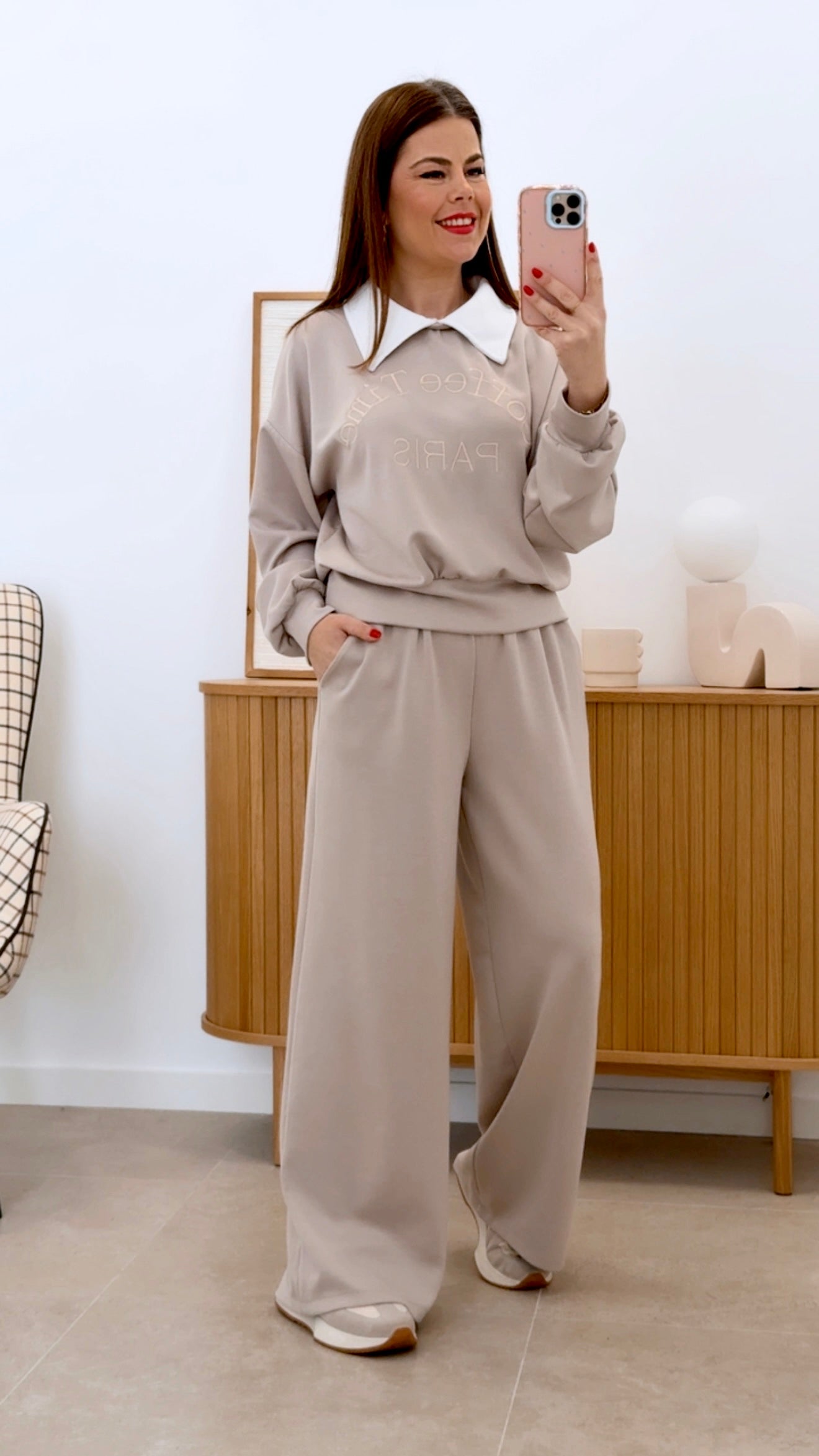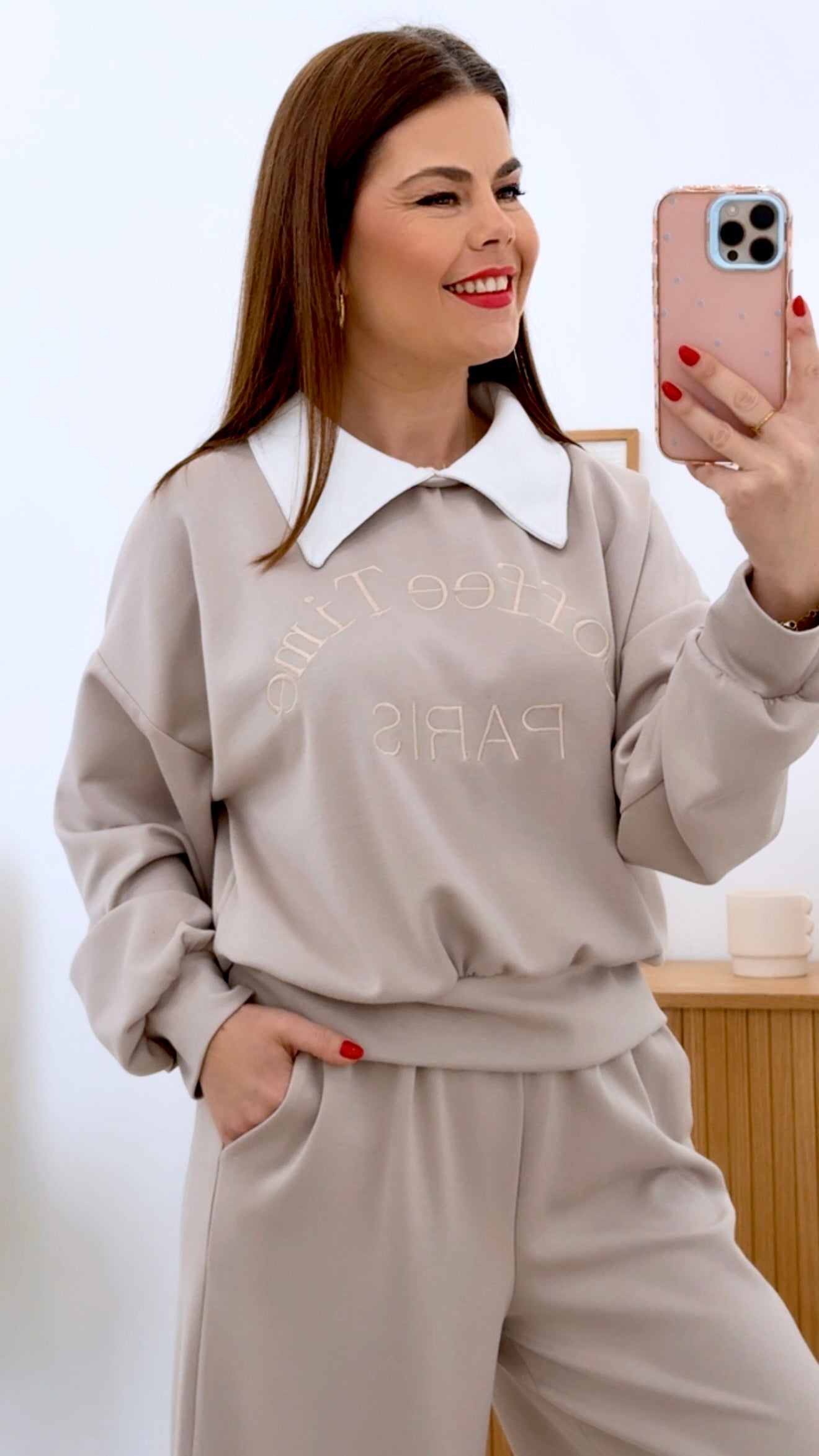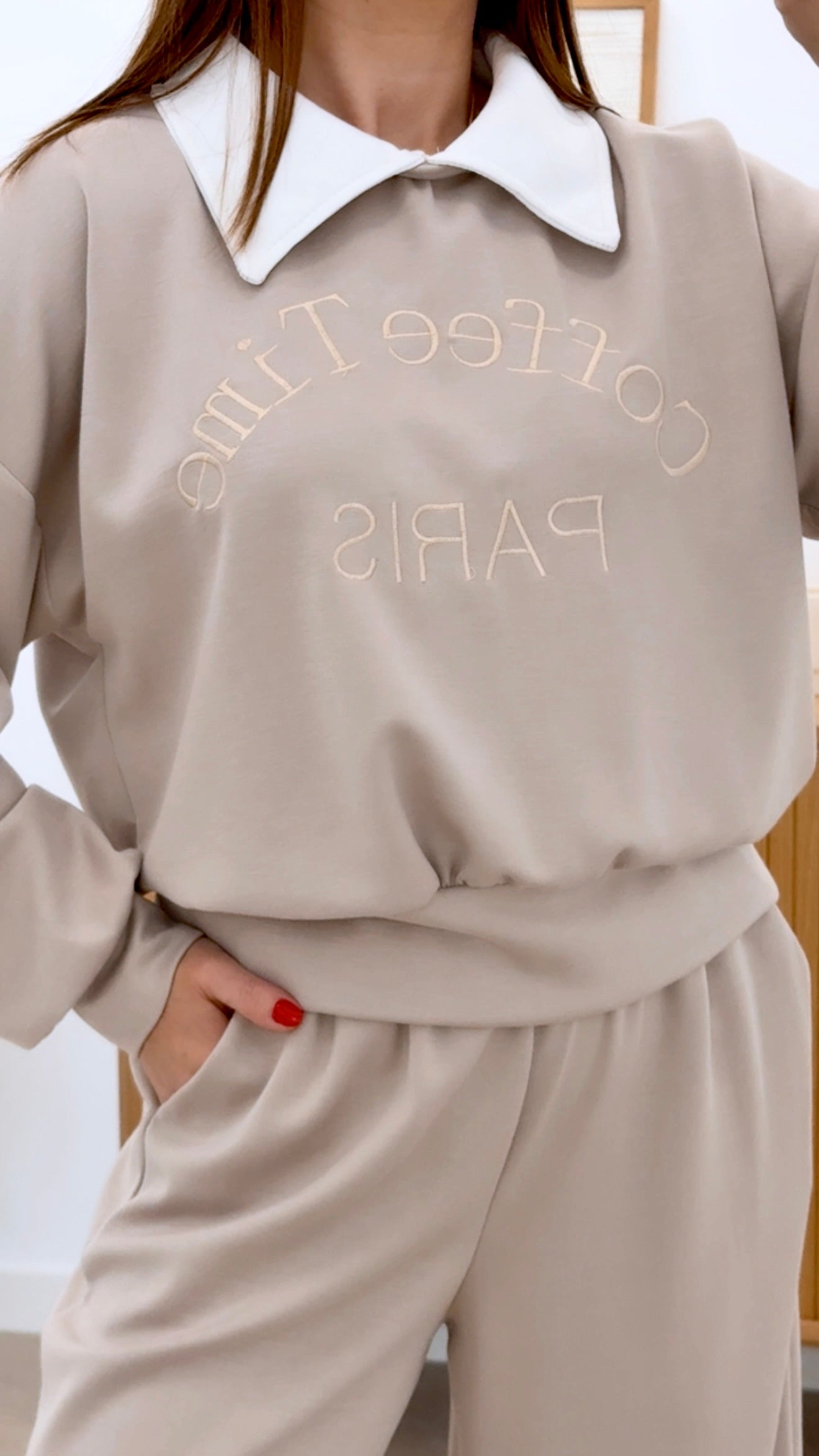 Chándal Coffee Time en talla única, diseñado con sudadera de cuello solapado integrado y estampado frontal distintivo. Pantalón de cintura engomada que asegura comodidad y ajuste perfecto. Composición equilibrada de 50% viscosa, 45% poliéster y 5% elástico, proporcionando suavidad, durabilidad y elasticidad. Prenda versátil ideal para momentos de descanso y uso casual, combinando estilo contemporáneo con funcionalidad.