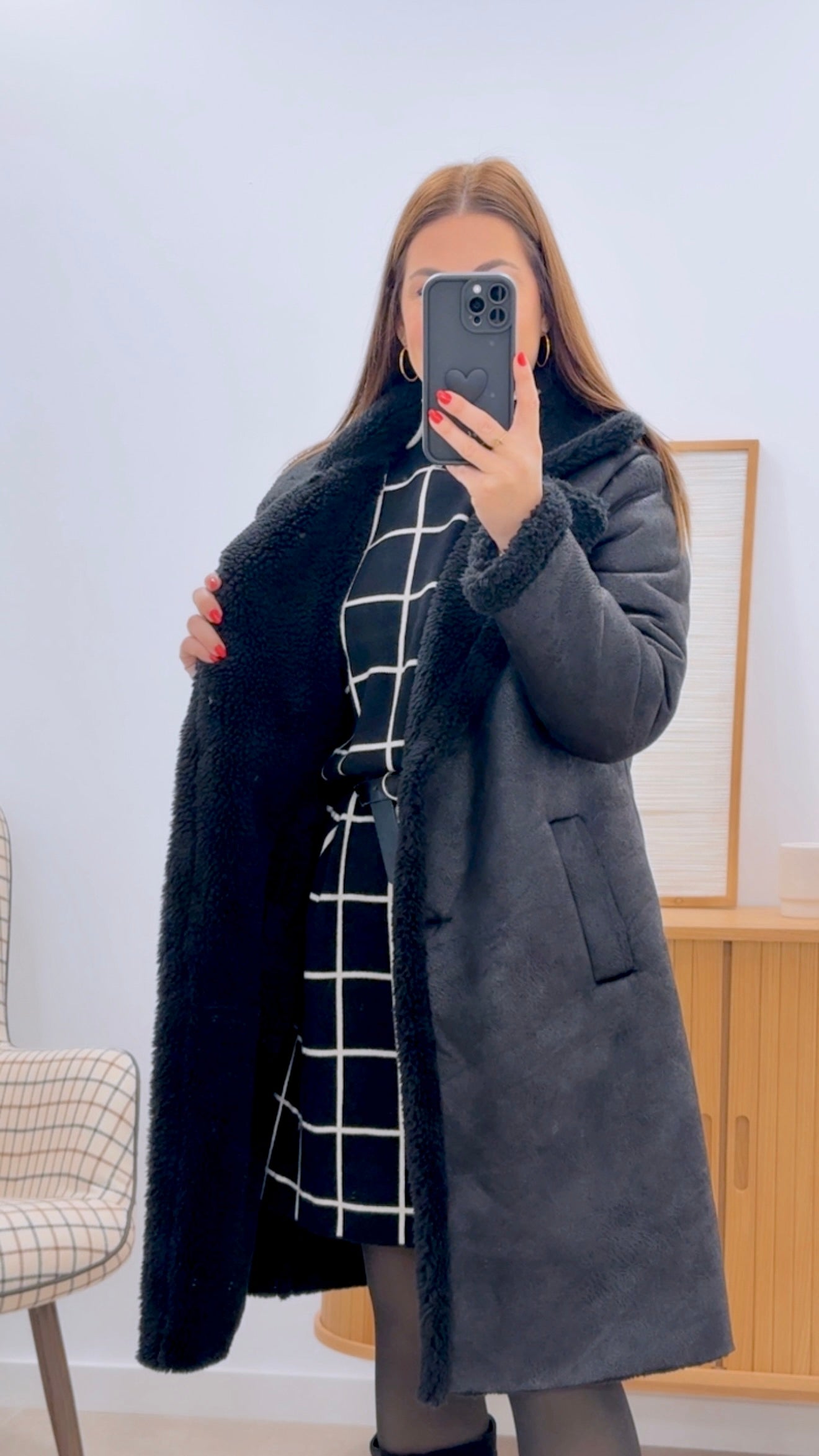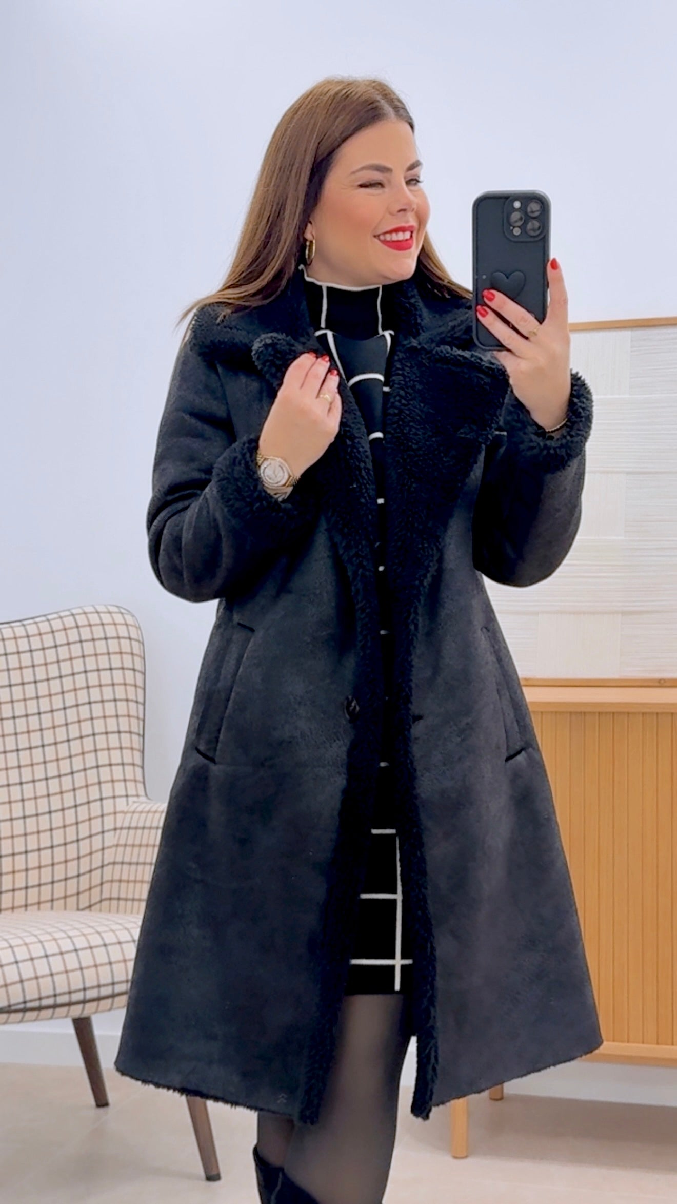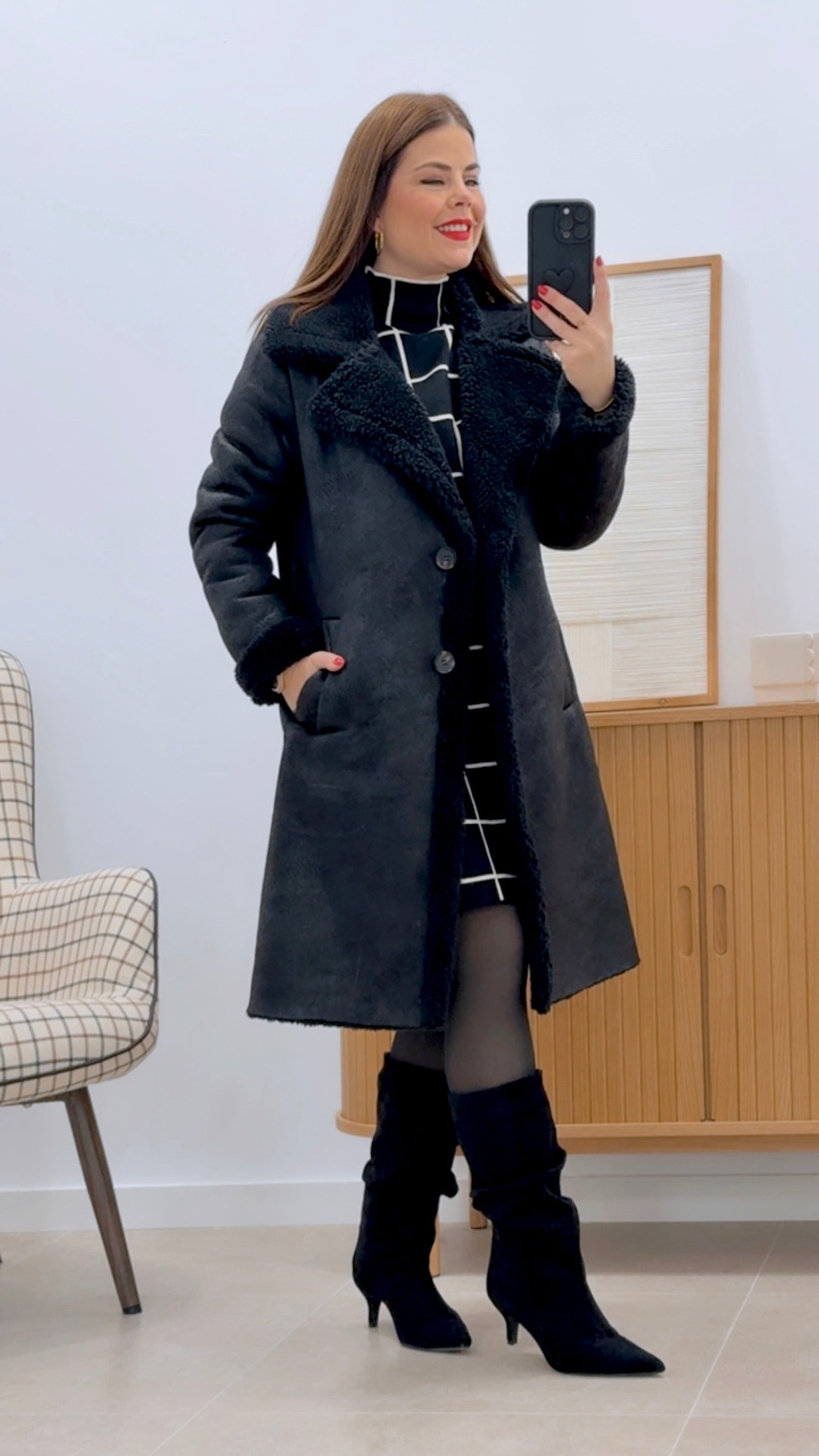 Abrigo largo confeccionado en piel vuelta con forro de borrego natural que recorre toda la prenda, incluyendo mangas, proporcionando un aislamiento térmico excepcional. Disponible en múltiples tallas para garantizar el ajuste perfecto. Cuenta con bolsillos funcionales y cierre de botones que combina practicidad con elegancia. Una pieza versátil que ofrece calidez y sofisticación para la temporada fría, manteniendo un acabado refinado y duradero.