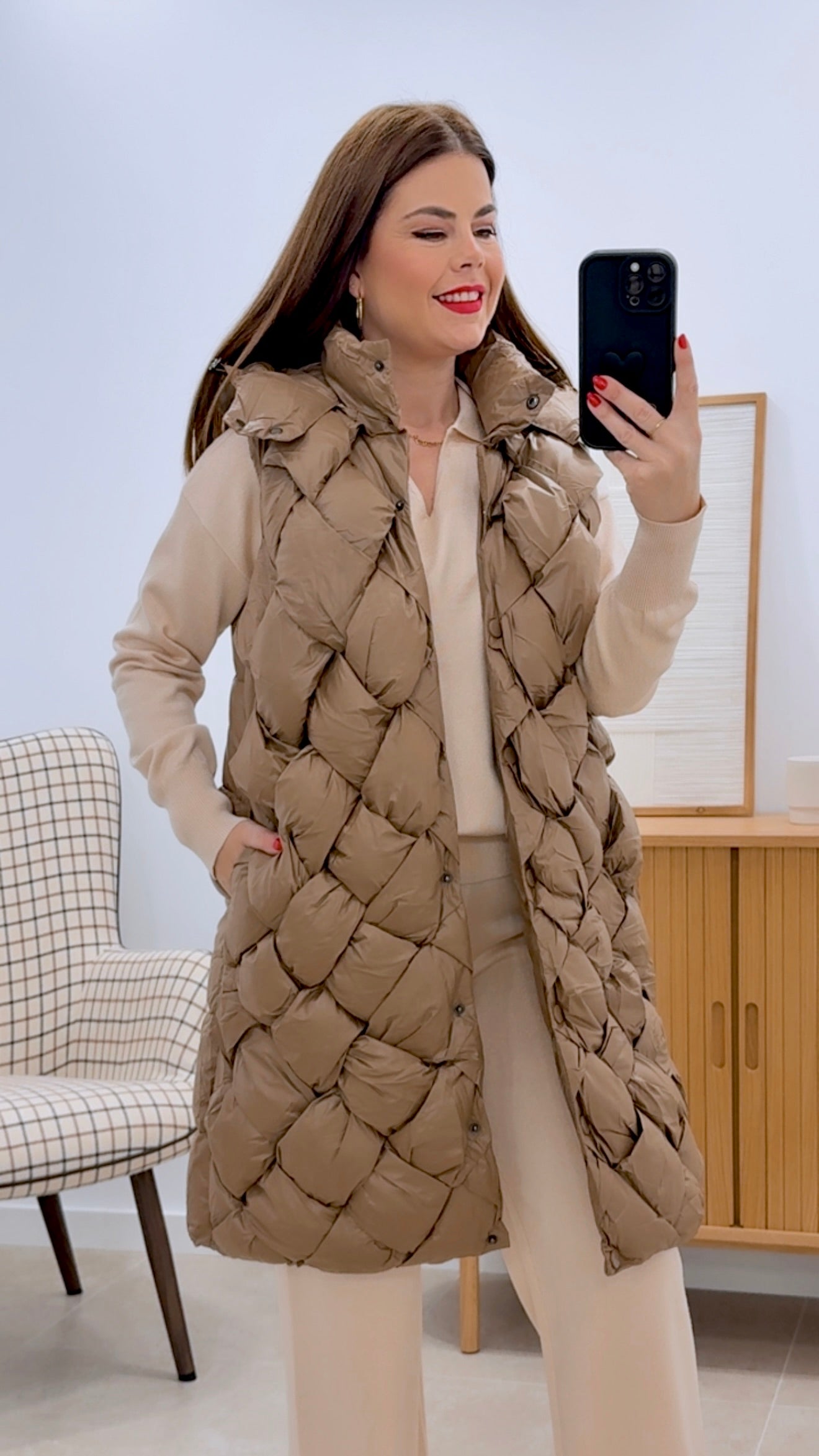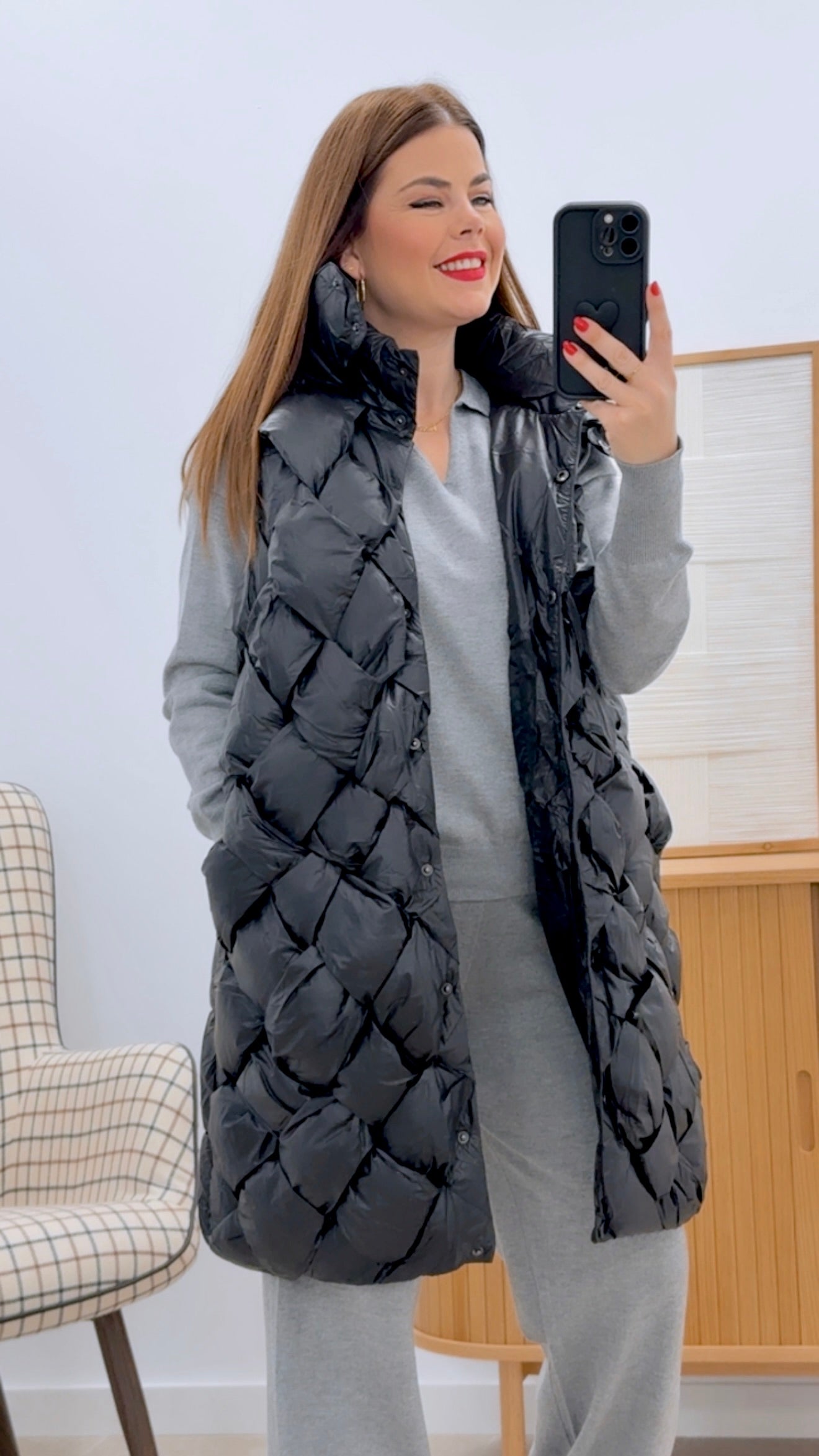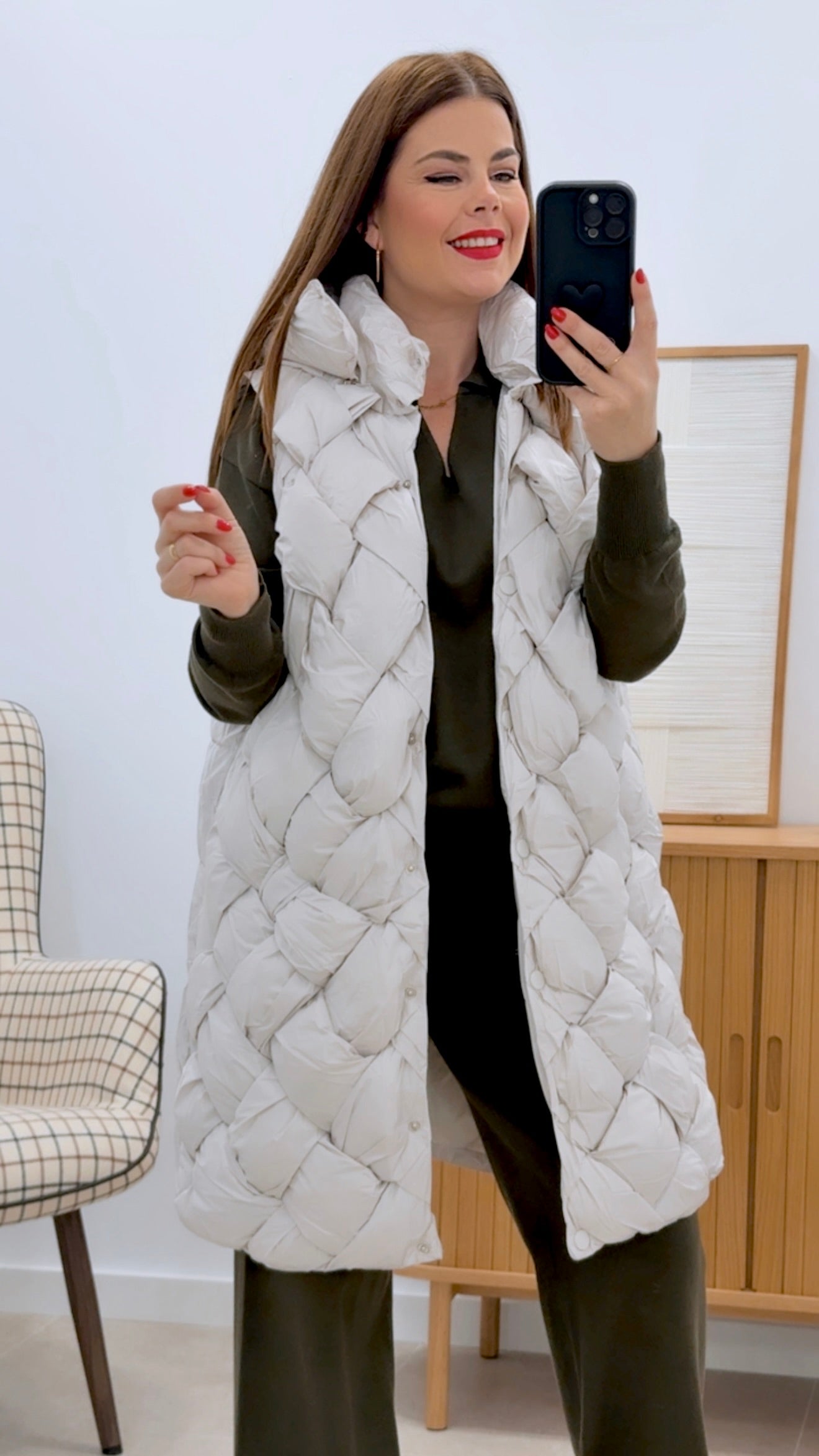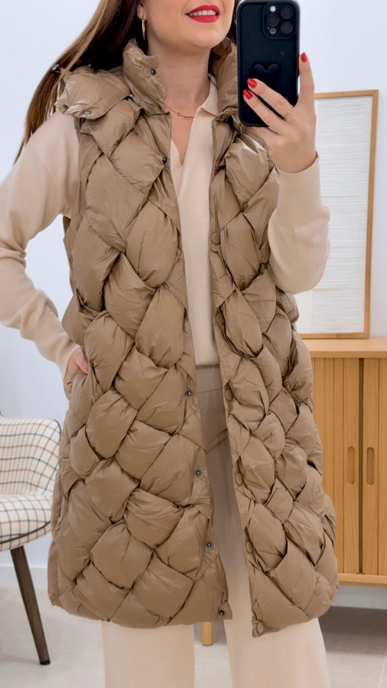 Chaleco acolchado de diseño innovador con textura trenzada que proporciona un acabado sofisticado y moderno. Equipado con capucha ajustable mediante cierre de clip para mayor comodidad y versatilidad. La estructura acolchada ofrece aislamiento térmico óptimo, manteniéndote abrigado en cualquier estación. Disponible en múltiples tallas para un ajuste perfecto y variedad de colores que se adaptan a cualquier estilo personal. Prenda versátil ideal para capas o uso independiente en tu día a día.