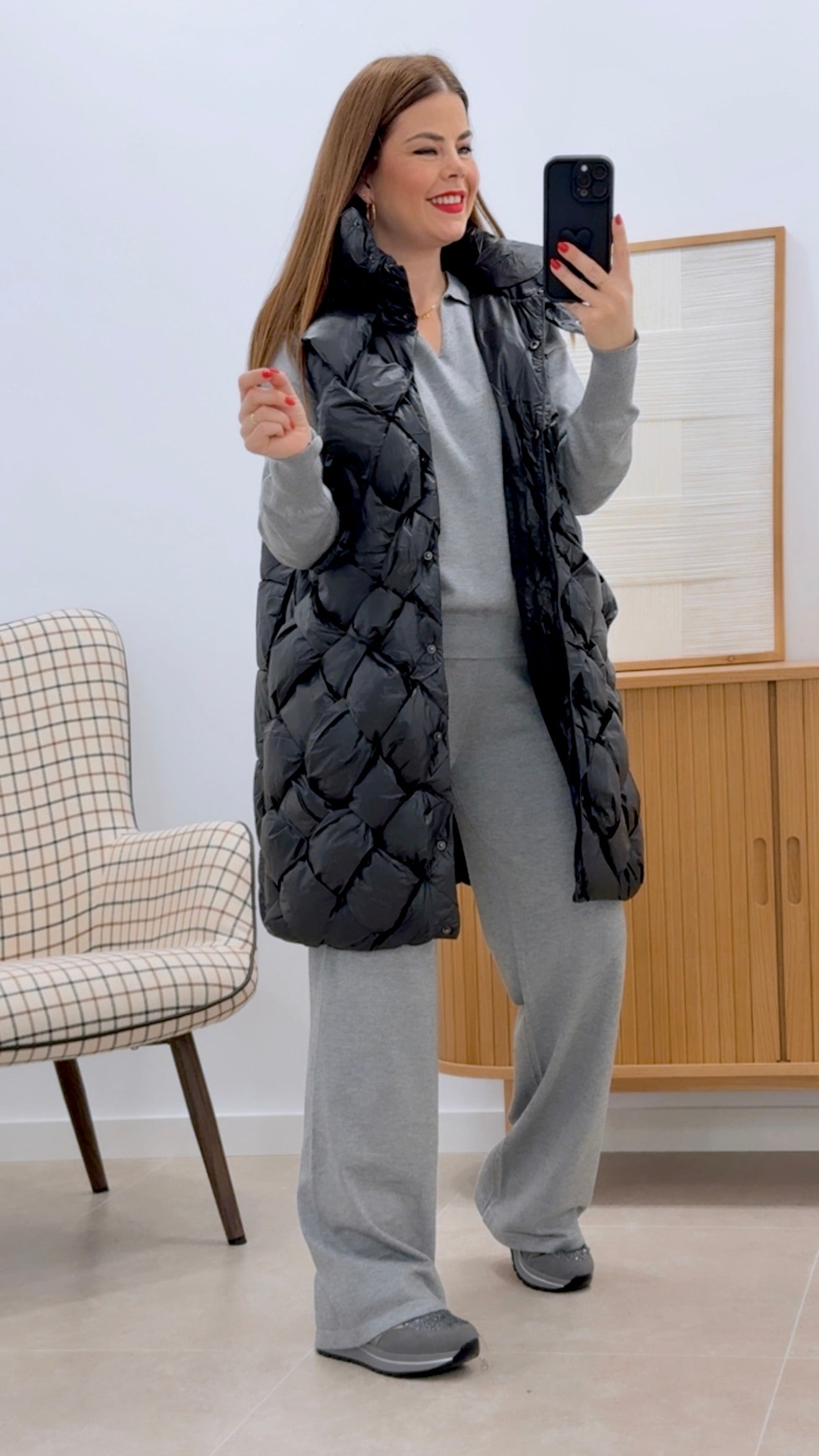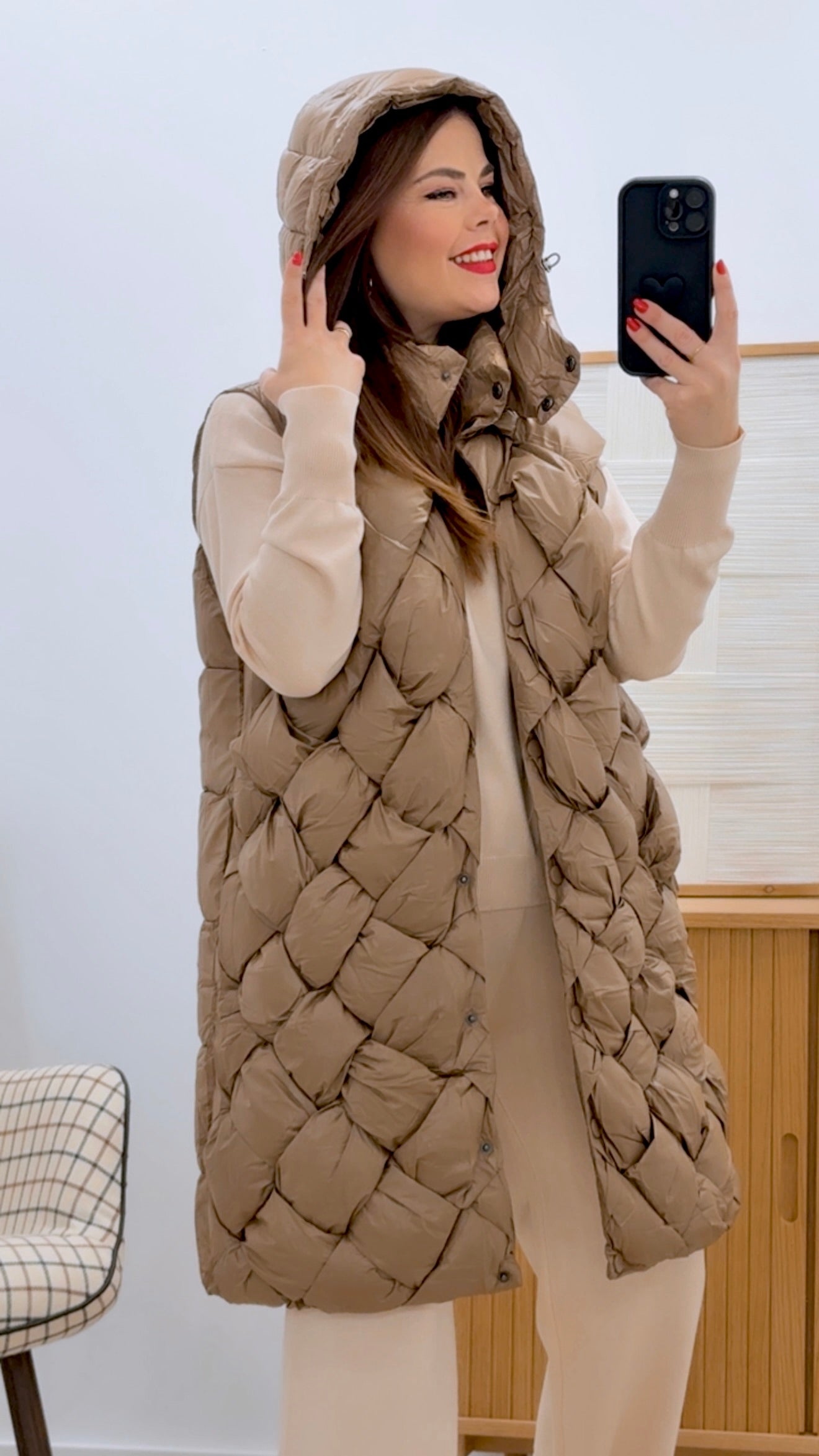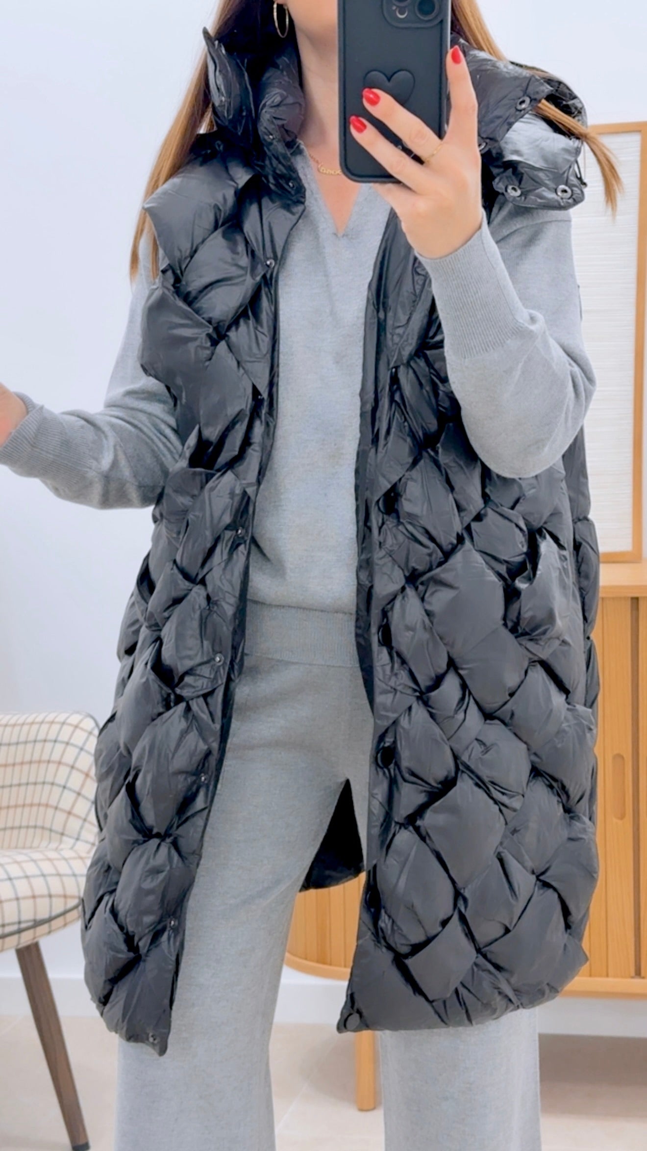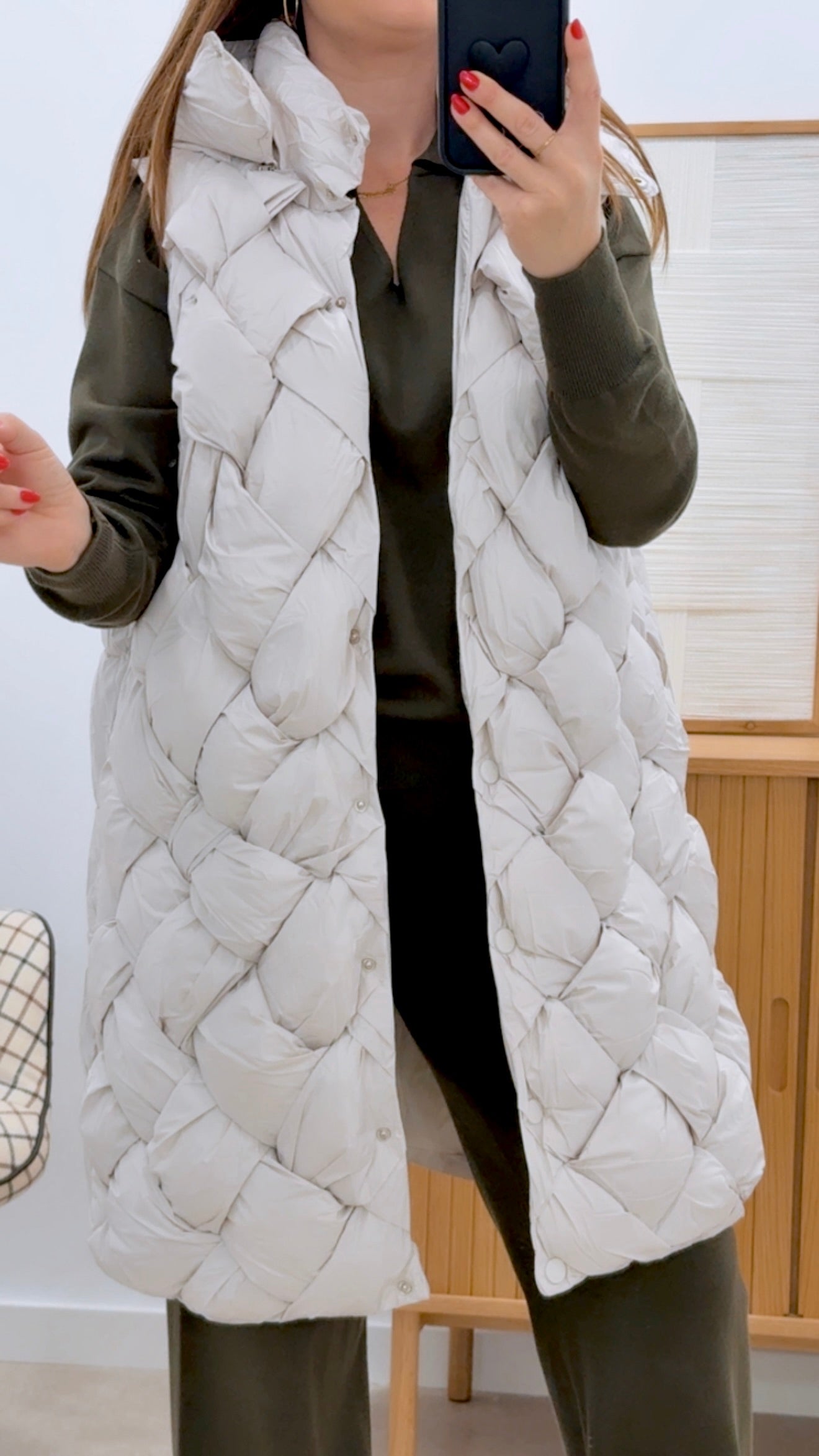 Chaleco acolchado de diseño innovador con textura trenzada que proporciona un acabado sofisticado y moderno. Equipado con capucha ajustable mediante cierre de clip para mayor comodidad y versatilidad. La estructura acolchada ofrece aislamiento térmico óptimo, manteniéndote abrigado en cualquier estación. Disponible en múltiples tallas para un ajuste perfecto y variedad de colores que se adaptan a cualquier estilo personal. Prenda versátil ideal para capas o uso independiente en tu día a día.