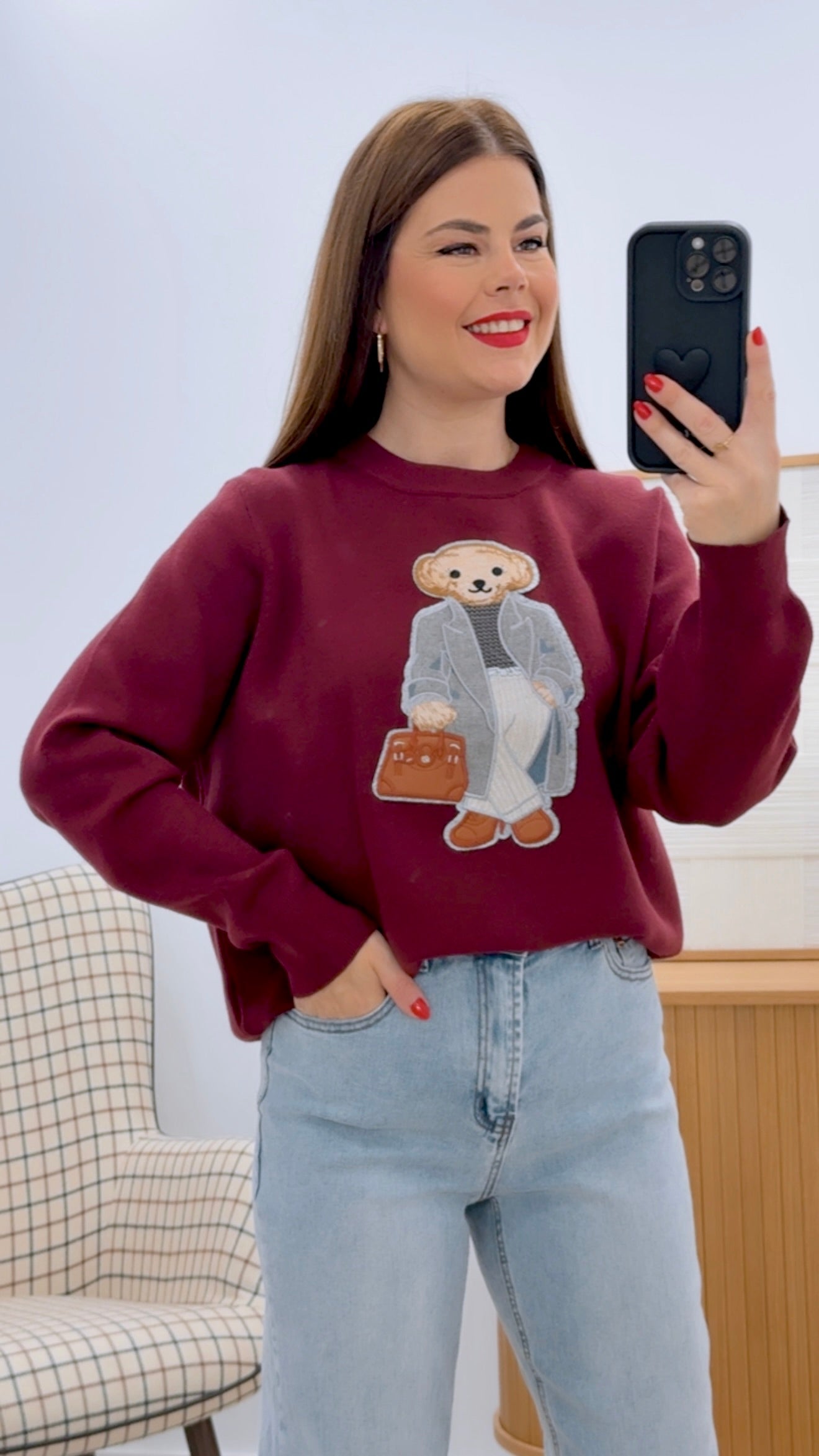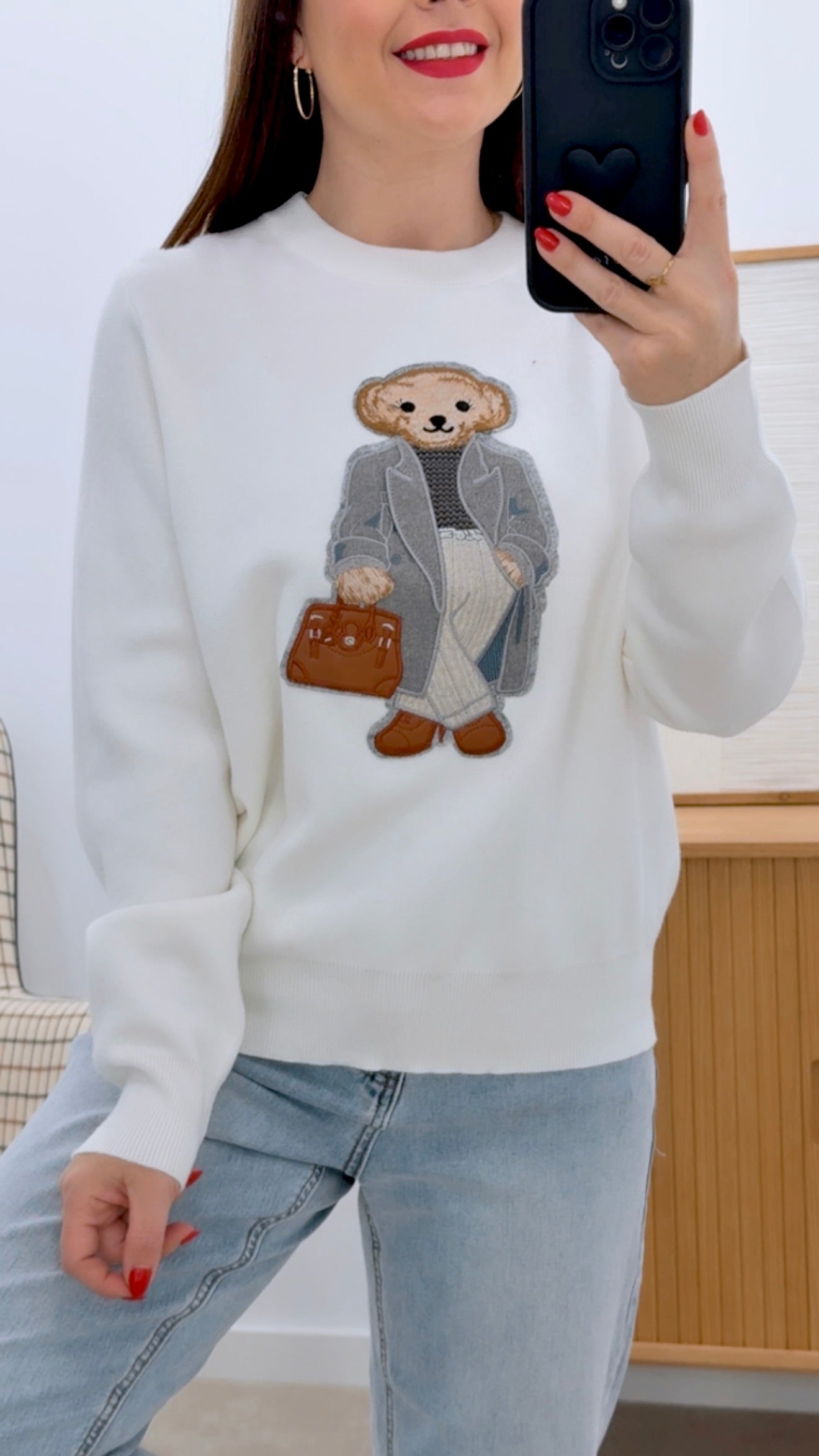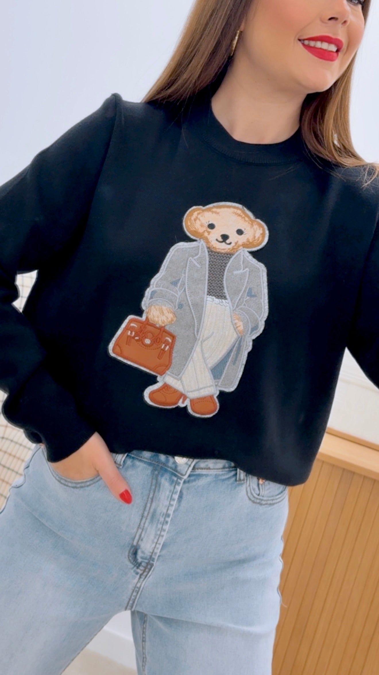 Jersey de punto liso confeccionado en una mezcla equilibrada de viscosa, poliéster y nylon que garantiza comodidad y durabilidad. Cuello redondo clásico y mangas largas que ofrecen versatilidad para cualquier estación. Destaca por su estampado de oso en la zona central, un detalle distintivo que añade carácter a tu armario. La composición textil proporciona una caída natural del tejido con excelente elasticidad y resistencia al lavado. Prenda versátil que combina funcionalidad con un toque de personalidad.